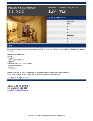 MIESZKANIE na WYNAJEM 11 500 Warszawa, Śródmieście, Niecała 124 m2 4619/2095/OMW Secondary 2004 2 6 3 Separate 1 1 Opis Do wynajęcia przestronne mieszkanie w ścisłym centrum Warszawy z dostępem do basenu, jacuzzi i sauny. Mieszkanie składa się z: - hallu - kuchni - salonu z kominkiem - sypialni - łazienki z wanna i prysznicem - gabinetu/sypialni - łazienki - garderoby Mieszkanie jest w pełni umeblowane, klimatyzowane, w cenie wszystkie opłaty. Cena za wynajem w pełni adekwatna do luksusowego wyposażenia. Zapraszam do oglądania!!! 109/ Beata Drab tel. +48/602-442-408 email: [email protected] Kancelaria GOLDHAUS & Partnerzy Marco von der Vanbrugh Powered by TCPDF (www.tcpdf.org)