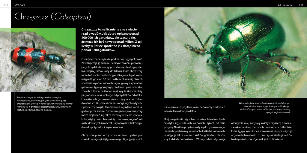 140 Chrz¹szcze O WA D Y Chrz¹szcze (Coleoptera) Chrząszcze to najliczniejszy na świecie rząd owadów. Jak dotąd opisano ponad 400 000 ich gatunków, ale szacuje się, że może ich być nawet ponad milion. Z tej liczby w Polsce spotkano jak dotąd nieco ponad 6200 gatunków. Barciel to chrząszcz z rodziny przekraskowatych, który zarówno jako larwa, jak i jako owad dorosły jest drapieżnikiem. Dorosłe osobniki polują na kwiatach, a larwy rozwijają się w gniazdach pszczół i grzebaczy. Zwierzęta te spotyka się od maja do lipca–sierpnia. Owady te znane są także pod nazwą „tęgopokrywe”. Zawdzięczają ją silnemu schitynizowaniu pierwszej pary skrzydeł, stanowiących ochronę dla drugiej, delikatniejszej, która służy do latania. Ciało chrząszczy może być wydłużone lub krępe. U krajowych gatunków osiąga długość od 0,6 mm do 8 cm. Składa się z trzech wyraźnie wyodrębnionych tagm: głowy z aparatem gębowym typu gryzącego, czułkami i parą oczu złożonych; tułowia, na którym znajdują się skrzydła i trzy pary odnóży, oraz wolnego od przydatków odwłoka. U niektórych gatunków samce mają mocno rozbudowane czułki, dzięki czemu mogą wychwytywać z powietrza związki feromonowe, wysyłane w czasie godów przez samice. Dymorfizm płciowy u chrząszczy może objawiać się także różnicą w wielkości ciała, kolorystyką oraz obecnością u samców „rogów” lub rozbudowanych żuwaczek, używanych w trakcie godów do potyczek z innymi samcami. Chrząszcze przechodzą przeobrażenie zupełne, poczwarki są najczęściej typu wolnego. Występują u nich za to rozmaite typy larw, m.in. pędrak czy drutowiec, a także larwa kampoidalna. Krajowe gatunki żyją w bardzo różnych środowiskach. Spotyka się je w lasach, na polach i łąkach, od nizin po góry. Niektóre przystosowały się do bytowania w jaskiniach, pod ziemią, w wodach słodkich i słonawych; występują także w norach ssaków, gniazdach ptaków czy ludzkich domostwach. W przyrodzie odgrywają Wiele gatunków stonek charakteryzuje się metalicznym ubarwieniem, błyszczącymi pokrywami i pękatym ciałem. Chrząszcze te są roślinożercami, często o dużej specjalizacji pokarmowej. olbrzymią rolę: zapylają kwiaty i czyszczą dno lasu z ekskrementów, martwych zwierząt czy roślin. Niektóre żyją w symbiozie z mrówkami, inne pasożytują w gniazdach mrówek, pszczół czy os. Wiele gatunków to drapieżniki, część jednak jest roślinożerna. 141 248 Motyle O WA D Y Zmrocznik gładysz to jedna z najpiękniejszych krajowych ciem. Wieczorami można obserwować przedstawicieli tego gatunku, jak zawisają nad kwiatami wielu gatunków roślin. Ich gąsienice żerują na wierzbówce kiprzycy oraz na różnych gatunkach przytulii. Rozpiętość skrzydeł zmrocznika gładysza sięga 6,5 cm, a jego skrzydła i pokrój ciała (podobnie jak u innych zawisakowatych) przypominają samolot. Należy on do najsprawniejszych lotników wśród polskich zwierząt. Zmrocznik g³adysz Oblaczek granatek to niewielka, latająca w dzień ćma z rodziny niedźwiedziówkowatych. Pokrojem ciała, ubarwieniem oraz sposobem lotu przypomina kraśniki. Występuje w całej Polsce, ale na rozproszonych, lokalnych stanowiskach. Oblaczek granatek 249 272 Pa j k i PAJÊCZAKI Tygrzyk paskowany Tygrzyk paskowany rozpina sieci najczęściej nisko nad ziemią, wśród traw lub innych roślin. Charakterystyczną cechą jego sieci jest pionowe pasmo wzmacniające w kształcie zygzaka, znajdujące się w jej centrum. Pająk ten poluje na owady, głównie na stosunkowo silne i duże szarańczaki, dlatego jego sieć potrzebuje takiego wzmocnienia. Paj¹k liœciak Pająk liściak żyje na krzewach i drzewach. Sieci buduje wewnątrz lekko zwiniętych liści i na nich poluje na drobne owady. Jego zielony kolor dodatkowo pozwala mu maskować się wśród roślin. 273