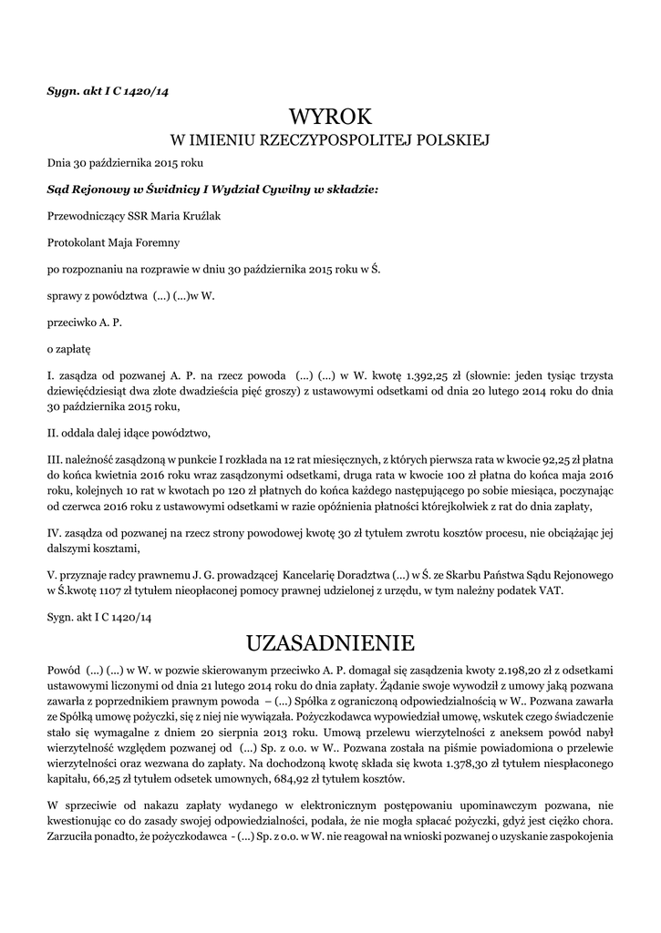 Sygn. akt I C 1420/14 WYROK W IMIENIU RZECZYPOSPOLITEJ POLSKIEJ Dnia 30 października 2015 roku Sąd Rejonowy w Świdnicy I Wydział Cywilny w składzie: Przewodniczący SSR Maria Kruźlak Protokolant Maja Foremny po rozpoznaniu na rozprawie w dniu 30 października 2015 roku w Ś. sprawy z powództwa (...) (...)w W. przeciwko A. P. o zapłatę I. zasądza od pozwanej A. P. na rzecz powoda (...) (...) w W. kwotę 1.392,25 zł (słownie: jeden tysiąc trzysta dziewięćdziesiąt dwa złote dwadzieścia pięć groszy) z ustawowymi odsetkami od dnia 20 lutego 2014 roku do dnia 30 października 2015 roku, II. oddala dalej idące powództwo, III. należność zasądzoną w punkcie I rozkłada na 12 rat miesięcznych, z których pierwsza rata w kwocie 92,25 zł płatna do końca kwietnia 2016 roku wraz zasądzonymi odsetkami, druga rata w kwocie 100 zł płatna do końca maja 2016 roku, kolejnych 10 rat w kwotach po 120 zł płatnych do końca każdego następującego po sobie miesiąca, poczynając od czerwca 2016 roku z ustawowymi odsetkami w razie opóźnienia płatności którejkolwiek z rat do dnia zapłaty, IV. zasądza od pozwanej na rzecz strony powodowej kwotę 30 zł tytułem zwrotu kosztów procesu, nie obciążając jej dalszymi kosztami, V. przyznaje radcy prawnemu J. G. prowadzącej Kancelarię Doradztwa (...) w Ś. ze Skarbu Państwa Sądu Rejonowego w Ś.kwotę 1107 zł tytułem nieopłaconej pomocy prawnej udzielonej z urzędu, w tym należny podatek VAT. Sygn. akt I C 1420/14 UZASADNIENIE Powód (...) (...) w W. w pozwie skierowanym przeciwko A. P. domagał się zasądzenia kwoty 2.198,20 zł z odsetkami ustawowymi liczonymi od dnia 21 lutego 2014 roku do dnia zapłaty. Żądanie swoje wywodził z umowy jaką pozwana zawarła z poprzednikiem prawnym powoda – (...) Spółka z ograniczoną odpowiedzialnością w W.. Pozwana zawarła ze Spółką umowę pożyczki, się z niej nie wywiązała. Pożyczkodawca wypowiedział umowę, wskutek czego świadczenie stało się wymagalne z dniem 20 sierpnia 2013 roku. Umową przelewu wierzytelności z aneksem powód nabył wierzytelność względem pozwanej od (...) Sp. z o.o. w W.. Pozwana została na piśmie powiadomiona o przelewie wierzytelności oraz wezwana do zapłaty. Na dochodzoną kwotę składa się kwota 1.378,30 zł tytułem niespłaconego kapitału, 66,25 zł tytułem odsetek umownych, 684,92 zł tytułem kosztów. W sprzeciwie od nakazu zapłaty wydanego w elektronicznym postępowaniu upominawczym pozwana, nie kwestionując co do zasady swojej odpowiedzialności, podała, że nie mogła spłacać pożyczki, gdyż jest ciężko chora. Zarzuciła ponadto, że pożyczkodawca - (...) Sp. z o.o. w W. nie reagował na wnioski pozwanej o uzyskanie zaspokojenia z jej ubezpieczenia. W toku procesu wnosiła o oddalenie powództwa ewentualnie zasądzenie kwoty 948,48 zł jako kwoty zaległej wskazanej w piśmie z dnia 6 maja 2013 roku. Wniosła też o zwolnienie jej od kosztów sądowych oraz rozłożenie należności na raty, przy czym na rozprawie zmodyfikowała wniosek złożony w piśmie procesowym w ten sposób, że raty byłyby płatne od kwietnia 2016 roku, to jest po spłacie dotychczasowego zobowiązania. Sąd ustalił następujący stan faktyczny: W dniu 13 września 2012 roku pozwana A. P. zawarła ze Spółką z o.o. w W. S. umowę pożyczki. Na mocy tej umowy udzielono jej pożyczki kwoty 2.000 zł na 46 tygodni. Kwota wyliczona do spłaty wyniosła 3.651,94 zł. Spłata nastąpić miała w ratach tygodniowych po 79,39 zł. Pierwszą ratę pozwana uiściła w dniu zawarcia umowy. Na sumę pożyczki składały się: wypłacona pozwanej kwota 2.000 zł, koszt ubezpieczenia – 250 zł, opłata przygotowawcza 115 zł, odsetki 196,81 zł, opłata za obsługę pożyczki w domu – 1.090,13 zł. Dowód: umowa pożyczki – k. 54 – 55, wniosek o pożyczkę – k. 56- 57, zeznania pozwanej – k. 171 – 177 Do 6 lutego 2013 roku pozwana spłacała pożyczkę regularnie, płacąc 80 zł tygodniowo. Do jej mieszkania przychodził przedstawiciel pożyczkodawcy. Do 6 lutego 2013 roku pozwana również była przedstawicielem firmy, u której zaciągnęła pożyczkę. Od tej daty nikt z przedstawicieli pożyczkodawcy nie skontaktował się z nią, nie przychodził po odbiór pożyczki. U pozwanej zdiagnozowano chorobę nowotworową, jej córka uległa wypadkowi. Pozwana potrzebowała pieniędzy na leczenie i rehabilitację córki. Przestała spłacać raty. Skontaktowała się z pożyczkodawcą, wysyłając SMS z informacją, że zmiana sytuacji życiowej uniemożliwia jej spłatę zadłużenia. Następnie wysłała pismo datowane na 4 czerwca 2013 roku. Pozwana kierowała najpierw do pożyczkodawcy, potem do pełnomocnika nabywcy wierzytelności szereg pism z wyjaśnieniem swojej trudnej sytuacji i z propozycją, by spłatę pożyczki przejął ubezpieczyciel. Dowód: zeznania pozwanej – k.172, pisma– k. 102, 106, 107 Pozwana spłaciła 21 rat pożyczki na łączną sumę 1.667,19 zł. Do zapłaty pozostało 25 rat na łączną kwotę 1.984,75 zł. Pismem z dnia 6 maja 2013 roku zawiadomiono pozwaną o zaległości wynoszącej 948,48 zł, stanowiącej równowartość 12 rat tygodniowych. Dowód: zeznania pozwanej – k. pismo – k. 101 Pozwana leczy się na nowotwór złośliwy. Była hospitalizowana od 15 marca 2013 roku do 26 marca 2013 r. W kwietniu 2013 roku została skierowana na oddział onkologiczny. Dowód: zaświadczenie o stanie zdrowia – k. 90, karta informacyjna – k. 96 – 97, wynik badania – k. 98, skierowanie do szpitala – k. 98 Pożyczkodawca wypowiedział pozwanej umowę pożyczki pismem z dnia 26 sierpnia 2013 r. Dowód: pismo – k. 58, dowód nadania – k. 59 – 61 W dniu 8 października 2013 roku (...) Sp. z o.o. w W. zbyła powodowi wierzytelności. Na liście sprzedanych wierzytelności pod pozycją 1764 znajdowała się wierzytelność wobec pozwanej w kwocie dochodzonej pozwem. Dowód: umowa 