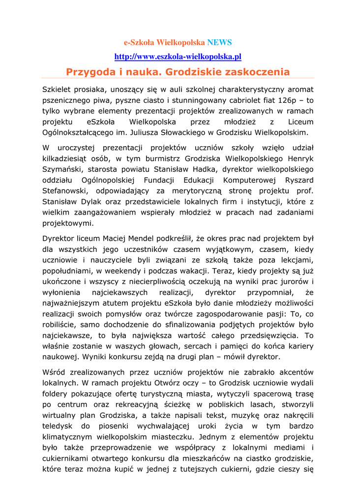 e-Szkoła Wielkopolska NEWS http://www.eszkola-wielkopolska.pl Przygoda i nauka. Grodziskie zaskoczenia Szkielet prosiaka, unoszący się w auli szkolnej charakterystyczny aromat pszenicznego piwa, pyszne ciasto i stunningowany cabriolet fiat 126p – to tylko wybrane elementy prezentacji projektów zrealizowanych w ramach projektu eSzkoła Wielkopolska przez młodzież z Liceum Ogólnokształcącego im. Juliusza Słowackiego w Grodzisku Wielkopolskim. W uroczystej prezentacji projektów uczniów szkoły wzięło udział kilkadziesiąt osób, w tym burmistrz Grodziska Wielkopolskiego Henryk Szymański, starosta powiatu Stanisław Hadka, dyrektor wielkopolskiego oddziału Ogólnopolskiej Fundacji Edukacji Komputerowej Ryszard Stefanowski, odpowiadający za merytoryczną stronę projektu prof. Stanisław Dylak oraz przedstawiciele lokalnych firm i instytucji, które z wielkim zaangażowaniem wspierały młodzież w pracach nad zadaniami projektowymi. Dyrektor liceum Maciej Mendel podkreślił, że okres prac nad projektem był dla wszystkich jego uczestników czasem wyjątkowym, czasem, kiedy uczniowie i nauczyciele byli związani ze szkołą także poza lekcjami, popołudniami, w weekendy i podczas wakacji. Teraz, kiedy projekty są już ukończone i wszyscy z niecierpliwością oczekują na wyniki prac jurorów i wyłonienia najciekawszych realizacji, dyrektor przypomniał, że najważniejszym atutem projektu eSzkoła było danie młodzieży możliwości realizacji swoich pomysłów oraz twórcze zagospodarowanie pasji: To, co robiliście, samo dochodzenie do sfinalizowania podjętych projektów było najciekawsze, to była największa wartość całego przedsięwzięcia. To właśnie zostanie w waszych głowach, sercach i pamięci do końca kariery naukowej. Wyniki konkursu zejdą na drugi plan – mówił dyrektor. Wśród zrealizowanych przez uczniów projektów nie zabrakło akcentów lokalnych. W ramach projektu Otwórz oczy – to Grodzisk uczniowie wydali foldery pokazujące ofertę turystyczną miasta, wytyczyli spacerową trasę po centrum oraz rekreacyjną ścieżkę w pobliskich lasach, stworzyli wirtualny plan Grodziska, a także napisali tekst, muzykę oraz nakręcili teledysk do piosenki wychwalającej uroki życia w tym bardzo klimatycznym wielkopolskim miasteczku. Jednym z elementów projektu było także przeprowadzenie we współpracy z lokalnymi mediami i cukiernikami otwartego konkursu dla mieszkańców na ciastko grodziskie, które teraz można kupić w jednej z tutejszych cukierni, gdzie cieszy się niesłabnącym zainteresowaniem smakoszy łakoci. Zresztą o jego wyjątkowym smaku mogli przekonać się wszyscy uczestnicy prezentacji. Na innym aspekcie historii regionu skupiła się grupa pracująca nad tematem Grodziskie serce z pianką, czyli rzecz o piwie grodziskim. Uczniowie postanowili zbadać tradycje piwowarskie Grodziska i okolic, a w efekcie sami nawarzyli Grodzisza, który został nawet doceniony (zajął II miejsce) w konkursie „Prawie jak Grodzisz” zorganizowanym podczas Międzynarodowej Giełdy Birofilów. Prezentacja projektu nie obyła się bez degustacji szlachetnego napitku, o którym Jędrzej Kitowicz pisał, że nawet „doktorowie (…) w pewnych chorobach pić go każą”. Sus domesticus – to z kolei projekt, w którym młodzież pochyliła się nad – wydawałoby się mało interesującą – świnią domową, ze wszystkimi jej aspektami kulturowymi i fizjologicznymi. Zakrojony na szeroką skalę pomysł zaowocował m.in. opisaniem miejsca świni w literaturze i sztuce, zaangażowaniem przedszkolaków do zaprezentowania swoich obrazów tego szlachetnego zwierzęcia, ale także przeprowadzeniem sekcji prosiaka, wyodrębnieniem narządów wewnętrznych, które spreparowane własnręcznie przez uczniów służą jako pomoce naukowe w szkole oraz odtworzeniem szkieletu świni, co wymagało naprawdę benedyktyńskiej pracy i ogromnego zaangażowania. Nie mniej pomysłowa była kolejna grupa, która stworzyła e-Malucha Cabrio. Mocno wyeksploatowana legenda polskiej motoryzacji – Fiat 126p – została przez uczniów gruntownie odnowiona i zmodernizowana. Pojazd prezentuje się doskonale, posiada radio, głośniki i nawigację. Co ważne uczniowie nie tylko zmodernizowali auto, ale także znaleźli sponsorów na jego zakup i sfinansowanie materiałów i narzędzi potrzebnych do pracy oraz przebrnęli przez procedury związane z umową kupna, rejestracją czy legalizacją zmian w dowodzie. e-Maluch już stał się wizytówką Grodziska, a to dlatego, że pierwszy honorowy przejazd odbył nim burmistrz otwierając nowe rondo w mieście. Podczas szkolnej prezentacji uczniowie uroczyście wręczyli kluczyki i dowód do e-Malucha dyrektorowi szkoły, którego do krótkiej przejażdżki nie trzeba było długo namawiać. Ostatnia grupa projektowa stworzyła Radio Słowak (nazwa pochodząca od patrona szkoły) – rozpoczęła od przedstawienia założeń finansowych rozgłośni, następnie zbadała oczekiwania przyszłych słuchaczy oraz opracowała ramówkę radiostacji. Projekt eSzkoła Wielkopolska w Grodzisku Wielkopolskim pokazał w jaki sposób praca metodą projektową potrafi wydobyć – częstokroć uśpiony przy tradycyjnej formule prowadzenia lekcji – potencjał tkwiący w uczniach oraz jak podejmowane indywidualnie zadania rozbudzają inicjatywę, pasję i zaangażowanie młodzieży i pozytywnie wpływają na całą społeczność lokalną. Trzeba bowiem podkreślić, że uczniowie z Liceum Ogólnokształcącego im. Słowackiego z Grodziska spotkali się z otwartością i chęcią pomocy ze strony mieszkańców miasta, burmistrza i starosty, pracowników leśnictwa, muzeów oraz przedstawicieli lokalnych firm i instytucji. Będący pod wrażeniem zaprezentowanych projektów prof. Stanisław Dylak, gratulując uczniom i opiekunom grup, powiedział: „Pokazaliście, jaka musi być szkoła!” i podkreślił, że dla efektywności p