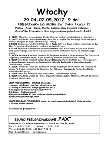 Włochy 29.04-07.05.2017 9 dni PIELGRZYMKA DO GROBU ŚW. JANA PAWŁA II Padwa -Asyż -Rzym-Monte Cassino-San Giovanni RotondoCascia*Św.Rita-Monte San Angelo-Manoppello-Loreto-Rimini 1 DZIEŃ. Msza Św., przejazd przez Polskę i Czechy nocleg i obiadokolacja w Czechach. 2. DZIEŃ. Śniadanie, przejazd do Padwy Msza Św. w bazylice Św. Antoniego. Krótka wizyta w Padwie. Przejazd do Asyżu. obiadokolacja i nocleg. 3. DZIEŃ. Śniadanie, zwiedzanie i Msza Św. w Asyżu. Wizyta w Casci-miejsca związanego ze Św. Rita. Przejazd na obiadokolacje i nocleg w okolicach Rzymu. 4. DZIEŃ. Śniadanie. Całodzienne zwiedzanie Rzymu: m.in. Katakumby, Bazylika Św. Piotra, Grób Ojca Świętego Jana Pawła II, Bazylika Św. Pawła za Murami. Powrót na obiadokolację i nocleg. 5. DZIEN. Wczesne śniadanie, przejazd do Watykanu. Audiencja Generalna Ojca Św. Franciszka. Ciąg dalszy zwiedzania Rzymu. Rzym Barokowy. Powrót na obiadokolację i nocleg. 6. DZIEN. Śniadanie. Przejazd do San Giovanni Rotondo. Po drodze Msza Św. i chwila zadumy na Monte Cassino. Nawiedzenie Sanktuarium Michała Archanioła w Monte San Angelo. Obiadokolacja i nocleg. 7. DZIEŃ. Śniadanie. Msza Św. Zwiedzanie miejsc związanych ze Św. Ojcem Pio. Przejazd do Loreto. Po drodze zwiedzanie Sanktuarium Św. Oblicza w Manoppello. Przejazd do Rimini, obiadokolacja i nocleg. 8. DZIEŃ Msza Św. Śniadanie, wyjazd do Czech , obiadokolacja, nocleg. 9. DZIEN. Śniadanie, wyjazd do Polski. Przyjazd do Częstochowy, Msza Św. . Powrót do domu w godzinach wieczornych. CENA PIELGRZYMKI: 1900 zł Obejmuje: - transport autokarem ( dvd, bar, klimatyzacja ,wc) -2 noclegi w Czechach ( pokoje typu studio 2+2 ) -6 noclegów we Włoszech w hotelach**/*** -8 śniadań i 8 obiadokolacji -Ubezpieczenie NNW, KL.( nie obejmuje chorób przewlekłych) -opiekę licencjonowanego pilota. KOSZT REALIZACJI PIELGRZYMKI: wjazdy do miast, przewodnicy lokalni, bilety wstępów, - 90 euro. Płatne pilotowi. Bez nocnych przejazdów!!! BIURO PIELGRZYMKOWE „PAX” Białystok, ul. Ks. Adama Abramowicza 1 ( obok Kościoła Św. Rocha) Pn. – Pt. 9.00 – 16.00 Sobota 10.00-12.00 Tel.:+48 85 674 5924, +48 888 17 96 17 Mail : [email protected] www.bppax.pl