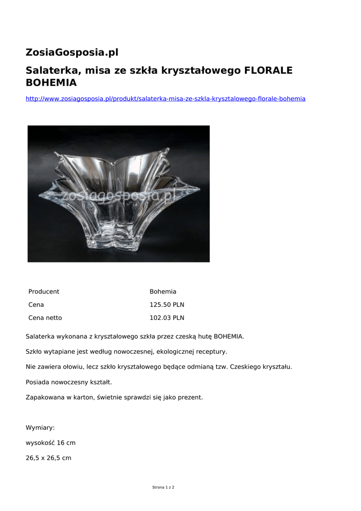 ZosiaGosposia.pl Salaterka, misa ze szkła kryształowego FLORALE BOHEMIA http://www.zosiagosposia.pl/produkt/salaterka-misa-ze-szkla-krysztalowego-florale-bohemia Producent Bohemia Cena 125.50 PLN Cena netto 102.03 PLN Salaterka wykonana z kryształowego szkła przez czeską hutę BOHEMIA. Szkło wytapiane jest według nowoczesnej, ekologicznej receptury. Nie zawiera ołowiu, lecz szkło kryształowego będące odmianą tzw. Czeskiego kryształu. Posiada nowoczesny kształt. Zapakowana w karton, świetnie sprawdzi się jako prezent. Wymiary: wysokość 16 cm 26,5 x 26,5 cm Strona 1 z 2 Strona 2 z 2