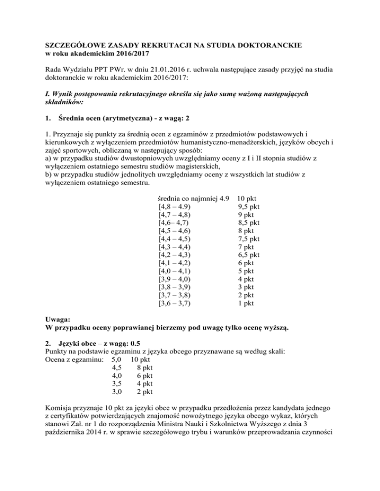 SZCZEGÓŁOWE ZASADY REKRUTACJI NA STUDIA DOKTORANCKIE w roku akademickim 2016/2017 Rada Wydziału PPT PWr. w dniu 21.01.2016 r. uchwala następujące zasady przyjęć na studia doktoranckie w roku akademickim 2016/2017: I. Wynik postępowania rekrutacyjnego określa się jako sumę ważoną następujących składników: 1. Średnia ocen (arytmetyczna) - z wagą: 2 1. Przyznaje się punkty za średnią ocen z egzaminów z przedmiotów podstawowych i kierunkowych z wyłączeniem przedmiotów humanistyczno-menadżerskich, języków obcych i zajęć sportowych, obliczaną w następujący sposób: a) w przypadku studiów dwustopniowych uwzględniamy oceny z I i II stopnia studiów z wyłączeniem ostatniego semestru studiów magisterskich, b) w przypadku studiów jednolitych uwzględniamy oceny z wszystkich lat studiów z wyłączeniem ostatniego semestru. średnia co najmniej 4.9 [4,8 – 4.9) [4,7 – 4,8) [4,6– 4,7) [4,5 – 4,6) [4,4 – 4,5) [4,3 – 4,4) [4,2 – 4,3) [4,1 – 4,2) [4,0 – 4,1) [3,9 – 4,0) [3,8 – 3,9) [3,7 – 3,8) [3,6 – 3,7) 10 pkt 9,5 pkt 9 pkt 8,5 pkt 8 pkt 7,5 pkt 7 pkt 6,5 pkt 6 pkt 5 pkt 4 pkt 3 pkt 2 pkt 1 pkt Uwaga: W przypadku oceny poprawianej bierzemy pod uwagę tylko ocenę wyższą. 2. Języki obce – z wagą: 0.5 Punkty na podstawie egzaminu z języka obcego przyznawane są według skali: Ocena z egzaminu: 5,0 10 pkt 4,5 8 pkt 4,0 6 pkt 3,5 4 pkt 3,0 2 pkt Komisja przyznaje 10 pkt za języki obce w przypadku przedłożenia przez kandydata jednego z certyfikatów potwierdzających znajomość nowożytnego języka obcego wykaz, których stanowi Zał. nr 1 do rozporządzenia Ministra Nauki i Szkolnictwa Wyższego z dnia 3 października 2014 r. w sprawie szczegółowego trybu i warunków przeprowadzania czynności w przewodzie doktorskim, w postępowaniu habilitacyjnym oraz w postępowaniu o nadanie tytułu profesora. 3. Aktywność naukowa – z wagą: 1 Liczba punktów nie może przekroczyć 10. Punkty przyznawane są za publikacje oraz prace przyjęte do druku w wydawnictwach naukowych (bierzemy pod uwagę rangę naukową), staże naukowe, udział w konferencjach i konkursach naukowych. Szczegółowe kryteria oceny osiągnięć są ustalane przez komisję rekrutacyjną osobno dla każdej dyscypliny. 4. Rozmowa kwalifikacyjna– z wagą: 2 Liczba punktów nie może przekroczyć 10. Ocenie podlega poziom wiedzy kandydata i sposób prezentacji zainteresowań naukowych np. tematyki pracy magisterskiej. 5. Zgodność z profilem naukowym – z wagą: 1 Liczba punktów nie może przekroczyć 10. Punkty przyznaje się na podstawie zgodności wykształcenia kandydata z profilem naukowym lub preferencjami rozwojowymi odpowiedniego Instytutu wchodzącego w skład SD przy Wydziale PPT oraz na podstawie opinii o kandydacie przyszłego opiekuna naukowego. II. Kandydat przedkłada Kierownikowi SD Wydziału PPT następujące dokumenty: • oświadczenie o średniej ocen określonej w punkcie I.1, • wykaz wszystkich ocen uzyskanych podczas studiów, • kopie prac (dokument potwierdzający przyjęcie prac do druku) oraz oświadczenie przedstawiające aktywność naukową, które podlegać mają ocenie punktowej wg zasad wymienionych w punkcie I.3. UWAGA: Kandydat nie musi dostarczać zaświadczenia lekarskiego stwierdzającego brak przeciwwskazań zdrowotnych do podjęcia studiów na naszym Wydziale. III. Na studia doktoranckie nie może być przyjęta osoba, która uzyskała łącznie mniej niż 50% możliwych do zdobycia punktów. IV. Ustala się następujące preferencje naukowe: Dziedzina nauk fizycznych – Fizyka: magnetooptyka; inżynieria nanostruktur; fizyka materiałów dwuwymiarowych; niskowymiarowe struktury półprzewodnikowe, grafen i inne układy dwuwymiarowe; kropki kwantowe, nanokryształy i inne układy zerowymiarowe; wytwarzanie nanokryształów; źródła pojedynczych fotonów; kondensaty polary tonowe; efekty topologiczne w fazie skondensowanej; kwantowy efekt Halla; złożone fermiony; nadprzewodnictwo; fizyczne podstawy informatyki kwantowej; mechanizm Higgsa i pole grawitacyjne; metodologia i zastosowania badań molekularnych; modelowanie nieliniowych zjawisk optycznych w polimerach i ciekłych kryształach; modelowanie stochastyczne dynamiki układów złożonych; nadprzewodnictwo; optyczne przetwarzanie informacji; optyka widzenia; spektroskopia struktur przyrządów optoelektronicznych; spektroskopia nanomateriałów nieorganicznych i jej zastosowanie w medycynie; światłowody konwencjonalne i fotoniczne; teoria niskowymiarowych struktur półprzewodnikowych; własności fizyczne i przejścia fazowe w materiałach ferroicznych; elektrodynamika kwantowa w ciele stałym; spektroskopia optyczna; spektroskopia nanomateriałów nieorganicznych – zastosowania w medycynie. Dziedzina nauk technicznych - Biocybernetyka i inżynieria biomedyczna: metodologia i zastosowania badań molekularnych, bioinformatyka, modelowanie procesów fizjologicznych, biofizyka agregatów molekularnych, biofizyka i fizjologia błon komórkowych, biooptyka, biopomiary w nanoskali, pomiary i analiza sygnałów biologicznych, elektronika biomedyczna, systemy pomiarowe i diagnostyczne. Dziedzina nauk technicznych - informatyka: algorytmika, kryptografia, bezpieczeństwo komputerowe, optymalizacja dyskretna, matematyczne metody analizy algorytmów.