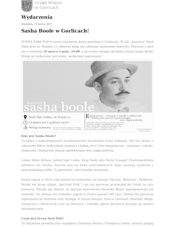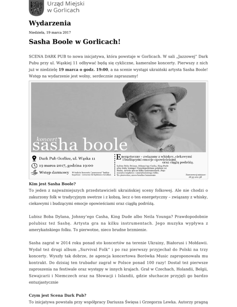 Wydarzenia Niedziela, 19 marca 2017 Sasha Boole w Gorlicach! SCENA DARK PUB to nowa inicjatywa, która powstaje w Gorlicach. W sali „Jazzowej” Dark Pubu przy ul. Wąskiej 11 odbywać będą się cykliczne, kameralne koncerty. Pierwszy z nich już w niedzielę 19 marca o godz. 19:00, a na scenie wystąpi ukraiński artysta Sasha Boole! Wstęp na wydarzenie jest wolny, serdecznie zapraszamy! Kim jest Sasha Boole? To jeden z najważniejszych przedstawicieli ukraińskiej sceny folkowej. Ale nie chodzi o zakurzony folk w tradycyjnym swetrze i z kobzą, lecz o ten energetyczny – związany z whisky, ciekawymi i budzącymi emocje opowieściami oraz ciągłą podróżą. Lubisz Boba Dylana, Johnny’ego Casha, King Dude albo Neila Younga? Prawdopodobnie polubisz też Sashę. Artysta gra na kilku instrumentach. Jego muzyka wypływa z amerykańskiego folku. To pierwotne, nieco brudne brzmienie. Sasha zagrał w 2014 roku ponad sto koncertów na terenie Ukrainy, Białorusi i Mołdawii. Wydał też drugi album „Survival Folk” i po raz pierwszy przyjechał do Polski na trzy koncerty. Wyszły tak dobrze, że agencja koncertowa Borówka Music zaproponowała mu kontrakt. Do dzisiaj ten trubadur zagrał w Polsce ponad 100 razy! Dostał też pierwsze zaproszenia na festiwale oraz występy w innych krajach. Grał w Czechach, Holandii, Belgii, Szwajcarii i Niemczech oraz na Słowacji i Islandii, gdzie słuchacze przyjęli go bardzo entuzjastycznie Czym jest Scena Dark Pub? To inicjatywa powstała przy współpracy Dariusza Święsa i Grzegorza Lewka. Autorzy pragną systematycznie organizować kameralne koncerty zarówno tych mniej jak i bardziej znanych artystów. Chcą dotrzeć do wszystkich gorliczan oraz sprawić by o naszym mieście usłyszeli ludzie w całej Polsce. W trakcie koncertu „puszczony” będzie kapelusz - wrzucisz, ile będziesz chciał(a). Sugerowana kwota – 10 zł (wszystkie pieniądze trafią do artysty i na rozwój Sceny Dark Pub).
