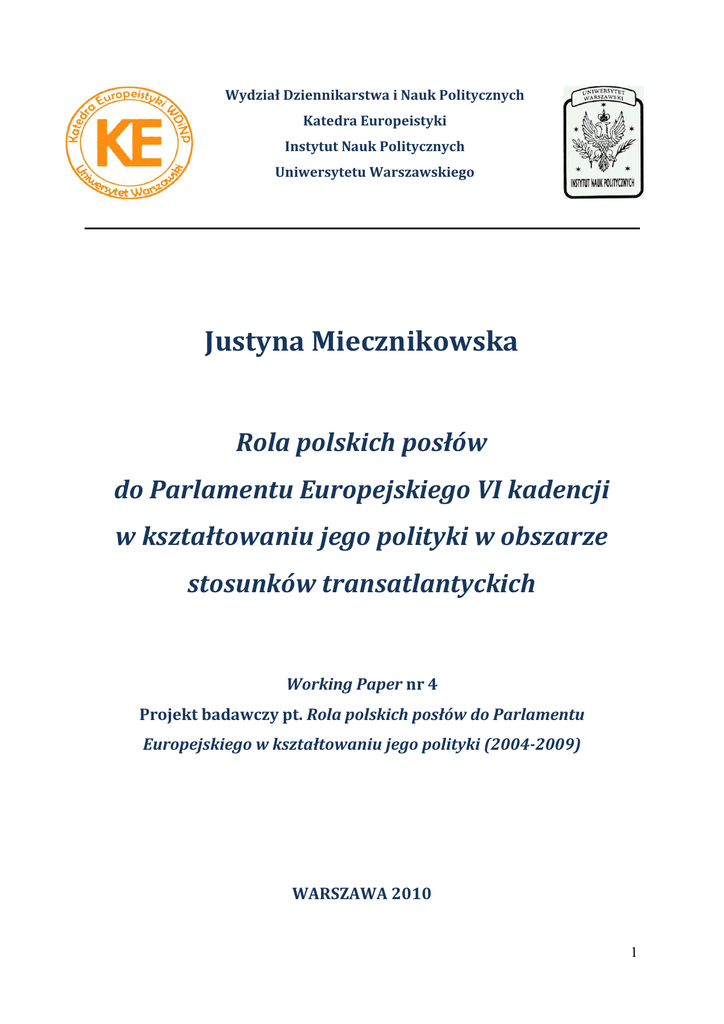 Wydział Dziennikarstwa i Nauk Politycznych Katedra Europeistyki Instytut Nauk Politycznych Uniwersytetu Warszawskiego Justyna Miecznikowska Rola polskich posłów do Parlamentu Europejskiego VI kadencji w kształtowaniu jego polityki w obszarze stosunków transatlantyckich Working Paper nr 4 Projekt badawczy pt. Rola polskich posłów do Parlamentu Europejskiego w kształtowaniu jego polityki (2004-2009) WARSZAWA 2010 1 Opracowanie powstało w ramach projektu badawczego nr N N116 066 33 pt. Rola polskich posłów do Parlamentu Europejskiego w kształtowaniu jego polityki (2004-2009) zrealizowanego na podstawie grantu Ministerstwa Nauki i Szkolnictwa Wyższego w okresie: listopad 2007 - listopad 2010. Badania akietowe i wywiady pogłębione na potrzeby projektu badawczego zostały przeprowadzone po konsultacjach metodologicznych i przy współpracy z Zakładem Badań Naukowych Polskiego Towarzystwa Socjologicznego w okresie listopad 2008 - luty 2009. 2 Spis treści Wstęp ...................................................................................................................................................................................... 4 1. Relacje Unia Europejska - Stany Zjednoczone Ameryki Północnej .......................................................... 7 2. Polska wobec relacji UE-USA .................................................................................................................................... 9 3. Parlament Europejski a stosunki transatlantyckie w latach 2004-2009 ............................................ 10 4. Analiza jakościowa na podstawie przeprowadzonych wywiadów oraz ankiet z polskimi posłami do PE VI kadencji ........................................................................................................................................... 16 5. Analiza ilościowa działalności polskich posłów do PE VI kadencji ....................................................... 22 6. Analiza jakościowa i ilościowa instrumentów formalnych....................................................................... 27 Podsumowanie................................................................................................................................................................. 33 Aneksy ................................................................................................................................................................................. 35 Wykaz ankiet oraz wywiadów pogłębionych przeprowadzonych z polskim posłami do Parlamentu Europejskiego ..................................................................................................... 35 Skróty nazw grup politycznych w Parlamencie Europejskim ........................................... 36 Skróty nazw komisji w Parlamencie Europejskim VI kadencji ......................................... 37 Skróty nazw delgacji w Parlamencie Europejskim ............................................................... 39 Spis tabel ............................................................................................................................................ 41 Informacje o autorze ....................................................................................................................... 42 3 Wstęp Poddanie analizie badawczej obszaru stosunków transatlantyckich między Stanami Zjednoczonymi a Unią Europejską jako jednej z głównych dziedzin aktywnej działalności polskich posłów w Parlamencie Europejskim (VI kadencja: 2004-2009) wynikało z czterech głównych przesłanek. Po pierwsze, współpraca w ramach Unii Europejskiej jak i współdziałanie sojuszników w NATO (North Altlantic Treaty Organization) jest podstawą długookresowej strategii bezpiecznego rozwoju Polski1. Po drugie, Polska przywiązuje ogromną wagę do relacji łączących ją ze Stanami Zjednoczonymi2 i konsekwentnie realizuje proamerykański kurs, objawiający się m.in. zaangażowaniem w walce z terroryzmem poprzez działania wojskowe na terenie Afganistanu, wsparciem politycznym i wojskowym amerykańskiej interwencji w Iraku (udział Polski przez 5 lat w misji stabilizacyjnej w charakterze koordynatora działań wojskowych i administracyjnych w jednej ze stref), poparciem dla amerykańskiej inicjatywy budowy w Europie systemu obrony przeciwrakietowej oraz wyrażeniem zgody na umieszczenie elementów takiej tarczy w Polsce3. Szczególnie ten ostatni aspekt wiąże się z dużymi kosztami politycznymi, jakie poniosła Polska w relacjach z niektórymi państwami członkowskimi UE i NATO negocjując z USA swój udział w 1 W przyjętej w 2007 r. Strategii Bezpieczeństwa Narodowego Rzeczypospolitej Polskiej (s. 6-9, www.bbn.gov.pl) zawarte jest sformułowanie, iż: „Interesom polskim służy umacnianie transatlantyckiej wspólnoty zacieśnianie stosunków między Stanami Zjednoczonymi a Unią Europejską, zwłaszcza ich kooperatywności oraz komplementarności w dziedzinie bezpieczeństwa. Polsce, jako bliskiemu sojusznikowi Stanów Zjednoczonych, zależy na umacnianiu zaangażowania tego państwa w Europie, jako siły gwarantującej bezpieczeństwo i stabilizującej relacje polityczno-militarne na kontynencie (…) Potencjalnym zagrożeniem dla interesów Polski byłaby ambicja traktowania UE jako przeciwwagi dla Stanów Zjednoczonych, a także niezdolności UE do kreowania wspólnej polityki. Zagrożeniem byłoby również osłabienie więzów łączących wspólnotę transatlantycką, co spowodowałaby oddalanie się od siebie państw położonych po obu brzegach Atlantyku”. Zob. też K.Łastawski, Polska racja stanu, Warszawa 2009, s. 85-99. 2 W Strategii Bezpieczeństwa Narodowego RP (op.cit. s. 13) scharakteryzowano w następujący sposób relacji bilateralnych pomiędzy Polską a USA: „Szczególne znaczenie w polskiej polityce bezpieczeństwa zachowują stosunki dwustronne ze Stanami Zjednoczonymi. Polska uznaje, iż mają one strategiczny 