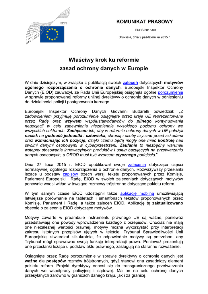 KOMUNIKAT PRASOWY EDPS/2015/09 Bruksela, dnia 9 października 2015 r. Właściwy krok ku reformie zasad ochrony danych w Europie W dniu dzisiejszym, w związku z publikacją swoich zaleceń dotyczących motywów ogólnego rozporządzenia o ochronie danych, Europejski Inspektor Ochrony Danych (EIOD) zauważył, że Rada Unii Europejskiej osiągnęła ogólne porozumienie w sprawie proponowanej reformy unijnej dyrektywy o ochronie danych w odniesieniu do działalności policji i postępowania karnego. Europejski Inspektor Ochrony Danych Giovanni Buttarelli powiedział: „Z zadowoleniem przyjmuję porozumienie osiągnięte przez kraje UE reprezentowane przez Radę oraz wzywam współustawodawców do pilnego kontynuowania negocjacji w celu zapewnienia niezmiennie wysokiego poziomu ochrony we wszystkich sektorach. Zachęcam ich, aby w reformie ochrony danych w UE położyli nacisk na godność jednostki i człowieka, chroniąc osoby fizyczne przed szkodami oraz wzmacniając ich pozycję, dzięki czemu będą mogły one mieć kontrolę nad swoimi danymi osobowymi w cyberprzestrzeni. Zaufanie to niezbędny warunek wstępny stosowania innowacyjnych produktów i usług bazujących na przetwarzaniu danych osobowych, a OROD musi być wzorcem etycznego podejścia.” Dnia 27 lipca 2015 r. EIOD opublikował swoje zalecenia dotyczące części normatywnej ogólnego rozporządzenia o ochronie danych. Rozważywszy przesłanki leżące u podstaw zapisów trzech wersji tekstu proponowanych przez Komisję, Parlament Europejski i Radę, EIOD w swoich zaleceniach dotyczących motywów ponownie wnosi wkład w trwające rozmowy trójstronne dotyczące pakietu reform. W tym samym czasie EIOD udostępnił także aplikację mobilną umożliwiającą łatwiejsze porównanie na tabletach i smartfonach tekstów proponowanych przez Komisję, Parlament i Radę, a także zaleceń EIOD. Aplikację tę zaktualizowano obecnie o zalecenia EIOD dotyczące motywów. Motywy zawarte w preambule instrumentu prawnego UE są ważne, ponieważ przedstawiają one powody wprowadzenia każdego z przepisów. Chociaż nie mają one niezależnej wartości prawnej, motywy można wykorzystać przy interpretacji zakresu istotnych przepisów ujętych w tekście. Trybunał Sprawiedliwości Unii Europejskiej stwierdzał kilkukrotnie, że odpowiednie motywy są potrzebne, aby Trybunał mógł sprawować swoją funkcję interpretacji prawa. Ponieważ prezentują one przesłanki leżące u podstaw aktu prawnego, zasługują na staranne rozważenie. Osiągnięte przez Radę porozumienie w sprawie dyrektywy o ochronie danych jest ważne dla postępów rozmów trójstronnych, gdyż stanowi ona zasadniczy element pakietu reform. Projekt dyrektywy odnosi się do transgranicznego przetwarzania danych we współpracy policyjnej i sądowej. Ma on na celu ochronę danych przesyłanych zarówno w granicach danego kraju, jak i za granicę. Informacje ogólne Prywatność i ochrona danych są prawami podstawowymi w UE. Ochrona danych jest prawem podstawowym chronionym na mocy przepisów prawa europejskiego i zapisanym w art. 8 Karty praw podstawowych Unii Europejskiej. Zasady ochrony danych w instytucjach UE, jak również obowiązki Europejskiego Inspektora Ochrony Danych (EIOD) określono dokładniej w rozporządzeniu (WE) nr 45/2001. EIOD jest względnie nowym, ale coraz bardziej wpływowym niezależnym organem nadzorczym odpowiedzialnym za monitorowanie przetwarzania danych osobowych przez instytucje i organy UE, doradztwo w zakresie polityki i ustawodawstwa mającego wpływ na ochronę prywatności oraz współpracę z podobnymi organami w celu zapewnienia spójnego poziomu ochrony danych. Giovanni Buttarelli (Europejski Inspektor Danych Osobowych) oraz Wojciech Wiewiórowski (zastępca EIOD) zostali powołani wspólną decyzją Parlamentu Europejskiego i Rady. Mianowani na pięcioletnią kadencję, objęli urząd w dniu 4 grudnia 2014 r. Strategia EIOD na lata 2015–2019: W ogłoszonym 2 marca 2015 r. planie na lata 2015–2019 podsumowano najważniejsze wyzwania związane z ochroną danych i prywatności w nadchodzących latach, jak też wskazano trzy cele strategiczne EIOD wraz z dziesięcioma działaniami prowadzącymi do ich osiągnięcia. Celami tymi są: (1) ochrona danych w erze cyfrowej; (2) budowa globalnego partnerstwa; oraz (3) otwarcie nowego rozdziału w ochronie danych w UE. Dane osobowe: Wszelkie informacje dotyczące zidentyfikowanej lub możliwej do zidentyfikowania (żyjącej) osoby fizycznej. Przykładami są nazwiska, daty urodzenia, fotografie, nagrania wideo, adresy e-mail i numery telefonów. Inne dane, takie jak adresy IP i treść komunikacji – związane z użytkownikami końcowymi usług komunikacyjnych lub dostarczone przez nich – są również uważane za dane osobowe. Prywatność: Prawo jednostki do spokoju oraz kontroli nad dotyczącymi jej informacjami. Prawo do prywatności lub życia prywatnego jest zapisane w Powszechnej deklaracji praw człowieka (art. 12), europejskiej konwencji praw człowieka (art. 8) oraz Karcie praw podstawowych Unii Europejskiej (art. 7). W Karcie zapisano także wyraźnie prawo do ochrony danych osobowych (art. 8). Przetwarzanie danych osobowych: Zgodnie z art. 2 lit. b) rozporządzenia (WE) nr 45/2001 przetwarzanie danych osobowych oznacza „każdą operację lub zestaw operacji, dokonywanych na danych osobowych przy pomocy środków zautomatyzowanych lub innych, jak np.: gromadzenie, nagrywanie, porządkowanie, przechowywanie, adaptacja lub modyfikacja, odzyskiwanie, konsultowanie, wykorzystywanie, ujawnienie przez transmisję, rozpowszechnianie lub udostępnianie w inny sposób, układanie lub kompilowanie, blokowanie, usuwanie lub niszczenie”. Zob. glosariusz na stronie internetowej EIOD. Pakiet dotyczący reformy ochrony danych w UE: W dniu 25 stycznia 2012 r. Komisja Europejska przyjęła pakiet reform obejmujący dwa wnioski ustawodawcze: jeden dotyczący ogólnego rozporządz