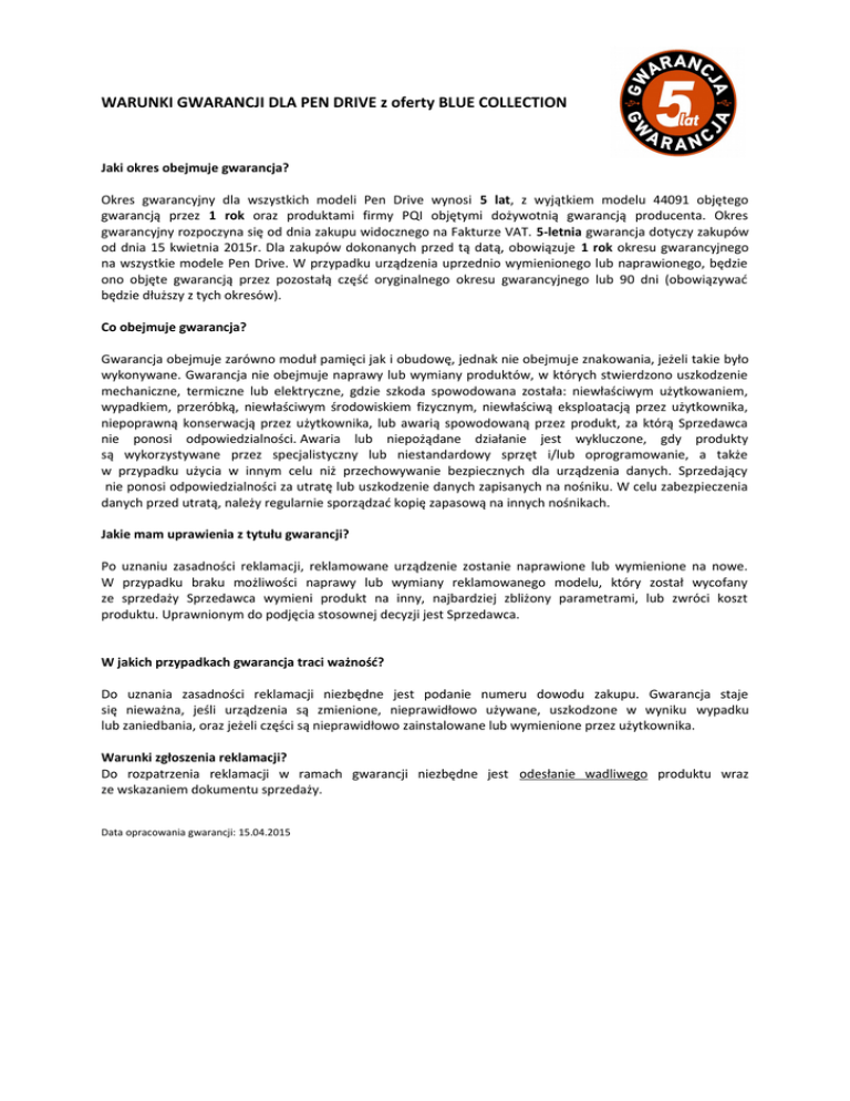 WARUNKI GWARANCJI DLA PEN DRIVE z oferty BLUE