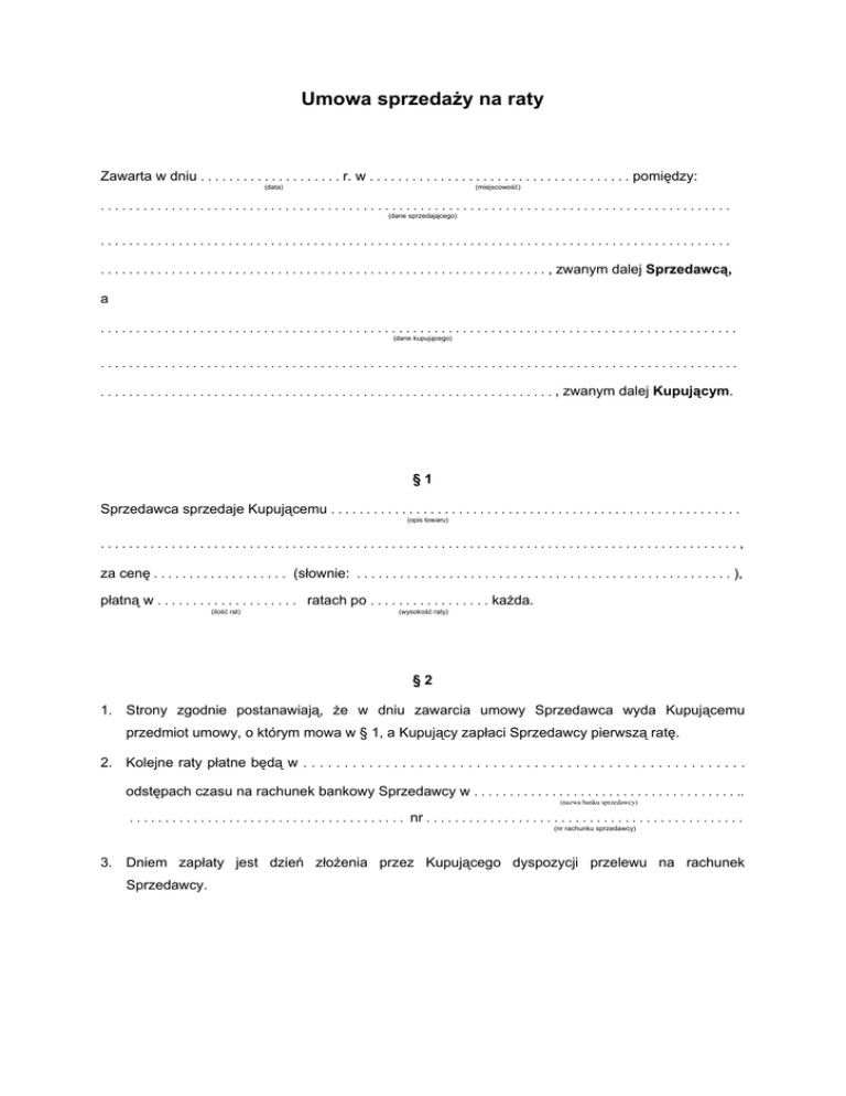 Umowa sprzedaży na raty Zawarta w dniu . . . . . . . . . . . . . . . . . . . . r. w . . . . . . . . . . . . . . . . . . . . . . . . . . . . . . . . . . . . . pomiędzy: (data) (miejscowość) ......................................................................................... (dane sprzedającego) ......................................................................................... . . . . . . . . . . . . . . . . . . . . . . . . . . . . . . . . . . . . . . . . . . . . . . . . . . . . . . . . . . . . . . . , zwanym dalej Sprzedawcą, a .......................................................................................... (dane kupującego) .......................................................................................... . . . . . . . . . . . . . . . . . . . . . . . . . . . . . . . . . . . . . . . . . . . . . . . . . . . . . . . . . . . . . . . . , zwanym dalej Kupującym. §1 Sprzedawca sprzedaje Kupującemu . . . . . . . . . . . . . . . . . . . . . . . . . . . . . . . . . . . . . . . . . . . . . . . . . . . . . . . . . . (opis towaru) .........................................................................................., za cenę . . . . . . . . . . . . . . . . . . . (słownie: . . . . . . . . . . . . . . . . . . . . . . . . . . . . . . . . . . . . . . . . . . . . . . . . . . . . . ), płatną w . . . . . . . . . . . . . . . . . . . . ratach po . . . . . . . . . . . . . . . . . każda. (ilość rat) (wysokość raty) §2 1. Strony zgodnie postanawiają, że w dniu zawarcia umowy Sprzedawca wyda Kupującemu przedmiot umowy, o którym mowa w § 1, a Kupujący zapłaci Sprzedawcy pierwszą ratę. 2. Kolejne raty płatne będą w . . . . . . . . . . . . . . . . . . . . . . . . . . . . . . . . . . . . . . . . . . . . . . . . . . . . . . odstępach czasu na rachunek bankowy Sprzedawcy w . . . . . . . . . . . . . . . . . . . . . . . . . . . . . . . . . . . . . .. (nazwa banku sprzedawcy) . . . . . . . . . . . . . . . . . . . . . . . . . . . . . . . . . . . . . . . nr . . . . . . . . . . . . . . . . . . . . . . . . . . . . . . . . . . . . . . . . . . . . . (nr rachunku sprzedawcy) 3. Dniem zapłaty jest dzień złożenia przez Kupującego dyspozycji przelewu na rachunek Sprzedawcy. §3 Z chwilą wydania przedmiotu sprzedaży na Kupującego przechodzi niebezpieczeństwo przypadkowej utraty bądź uszkodzenia tego przedmiotu, a także korzyści i ciężary z nim związane. §4 W razie zalegania Kupującego z zapłatą co najmniej . . . . . . rat, Sprzedawca może, po uprzednim wezwaniu do niezwłocznego uregulowania należności, żądać od Kupującego natychmiastowej zapłaty sumy pozostałych do zapłaty rat wraz z odsetkami za opóźnienie w płatnościach rat. §5 W przypadku określonym w § 3 Sprzedawca może, zamiast żądania zapłaty pozostałych rat, odstąpić od umowy, uprzednio wyznaczając Kupującemu odpowiedni termin dodatkowy do zapłaty zaległości z zagrożeniem, iż w razie bezskutecznego upływu wyznaczonego terminu będzie on uprawniony do odstąpienia od umowy. §6 1. Wszelkie zmiany niniejszej umowy wymagają dla swej ważności formy pisemnej. 2. W sprawach nieuregulowanych niniejszą umową stosuje się przepisy Kodeksu cywilnego. 3. Umowę sporządzono w dwóch jednobrzmiących egzemplarzach, po jednym dla każdej ze stron. .................. Sprzedawca ................. Kupujący