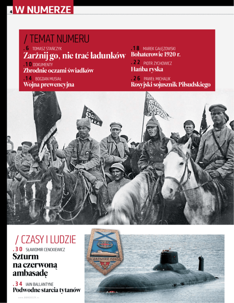 W NUMERZE / TEMAT NUMERU .6 TOMASZ STAŃCZYK Zarżnij go, nie trać ładunków . 1 0 DOKUMENTY Zbrodnie oczami świadków . 1 4 BOGDAN MUSIAŁ Wojna prewencyjna FFOT. RIA NOVOSTI/EAST NEWS 4 / CZASY I LUDZIE .30 SŁAWOMIR CENCKIEWICZ Szturm na czerwoną ambasadę . 3 4 IAIN BALLANTYNE Podwodne starcia tytanów WWW.DORZECZY.PL . 1 8 MAREK GAŁĘZOWSKI Bohaterowie 1920 r. . 2 2 PIOTR ZYCHOWICZ Hańba ryska . 2 6 PAWEŁ MICHALIK Rosyjski sojusznik Piłsudskiego MIESIĘCZNIK LISICKIEGO DO RZECZY . 3 8 PIOTR ZYCHOWICZ Lincz na bohaterze . 4 2 WITOLD BAGIEŃSKI Afera agenta „Cargo” . 4 6 SŁAWOMIR KOPER Upadek Hannibala . 5 0 FILIPE VERDE Czerwony cień nad Portugalią . 5 4 LECH KOWALSKI Atomowa wojna PRL . 5 7 TOMASZ STAŃCZYK Dwory i twórcy / CO CZYTAĆ .76 KRZYSZTOF MASŁOŃ Piękny dwudziestoletni / FELIETONY .84 WIKTOR SUWOROW Krwawy Robespierre . 8 6 PIOTR SEMKA Cud nocy sierpniowej . 8 7 RAFAŁ A. HISTORIA 5 / KRESY .88 ANDRZEJ PRUS-NIEWIADOMSKI Saga rodu Dönhoffów / BATALIE I WODZOWIE .92 MACIEJ ROSALAK 50 bitew epoki „N” FOT. MAREK ZAJDLER/EAST NEWS ZIEMKIEWICZ Błogosławiona bomba / KOMIKS . 6 0 KRZYSZTOF MASŁOŃ Islamiści u bram! . 6 4 MACIEJ ROSALAK Kataklizmy, które zmieniły świat . 6 8 LESZEK CZARNECKI Polak na dworze cesarza Chin . 7 2 JAKUB OSTROMĘCKI Zbrodnie czerwonej Bułgarii SIERPIEŃ 2015 8(30)/2015 . 9 9 SŁAWOMIR CENCKIEWICZ Naziści na usługach Ameryki . 9 8 KRZYSZTOF WYRZYKOWSKI SŁAWOMIR ZAJĄCZKOWSKI Lubelski Lipiec