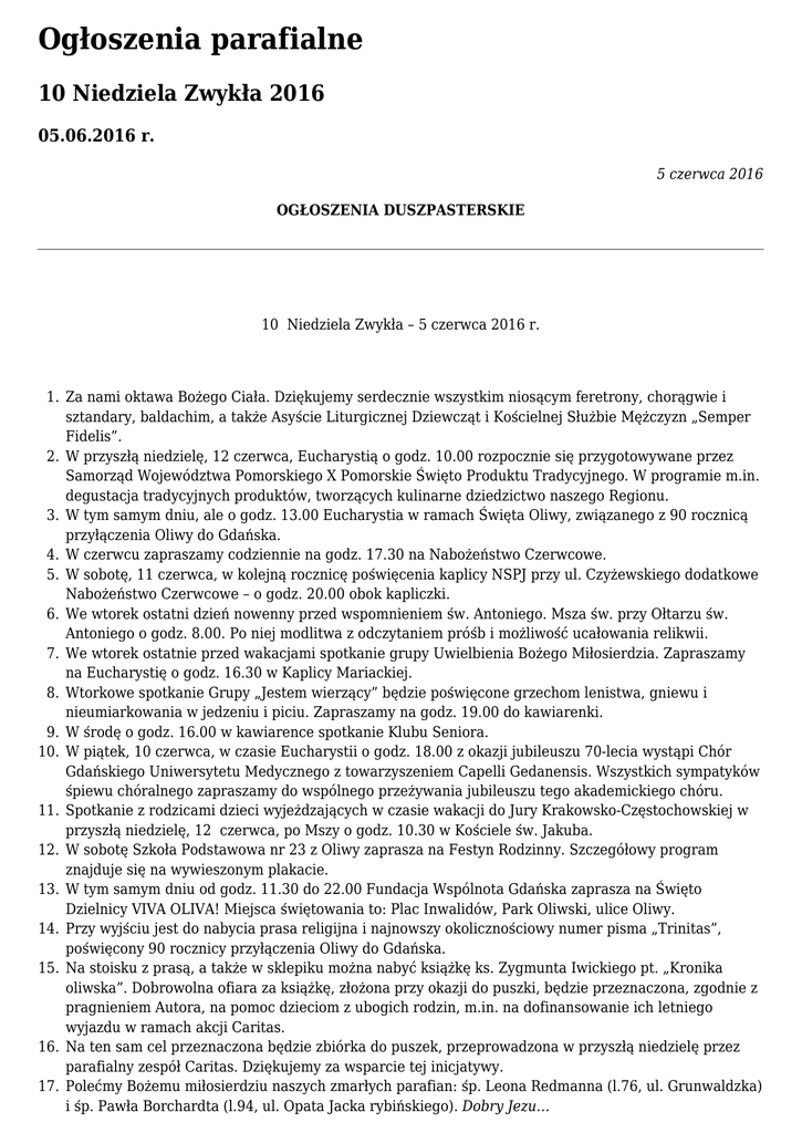 Ogłoszenia parafialne 10 Niedziela Zwykła 2016 05.06.2016 r. 5 czerwca 2016 OGŁOSZENIA DUSZPASTERSKIE 10 Niedziela Zwykła – 5 czerwca 2016 r. 1. Za nami oktawa Bożego Ciała. Dziękujemy serdecznie wszystkim niosącym feretrony, chorągwie i sztandary, baldachim, a także Asyście Liturgicznej Dziewcząt i Kościelnej Służbie Mężczyzn „Semper Fidelis”. 2. W przyszłą niedzielę, 12 czerwca, Eucharystią o godz. 10.00 rozpocznie się przygotowywane przez Samorząd Województwa Pomorskiego X Pomorskie Święto Produktu Tradycyjnego. W programie m.in. degustacja tradycyjnych produktów, tworzących kulinarne dziedzictwo naszego Regionu. 3. W tym samym dniu, ale o godz. 13.00 Eucharystia w ramach Święta Oliwy, związanego z 90 rocznicą przyłączenia Oliwy do Gdańska. 4. W czerwcu zapraszamy codziennie na godz. 17.30 na Nabożeństwo Czerwcowe. 5. W sobotę, 11 czerwca, w kolejną rocznicę poświęcenia kaplicy NSPJ przy ul. Czyżewskiego dodatkowe Nabożeństwo Czerwcowe – o godz. 20.00 obok kapliczki. 6. We wtorek ostatni dzień nowenny przed wspomnieniem św. Antoniego. Msza św. przy Ołtarzu św. Antoniego o godz. 8.00. Po niej modlitwa z odczytaniem próśb i możliwość ucałowania relikwii. 7. We wtorek ostatnie przed wakacjami spotkanie grupy Uwielbienia Bożego Miłosierdzia. Zapraszamy na Eucharystię o godz. 16.30 w Kaplicy Mariackiej. 8. Wtorkowe spotkanie Grupy „Jestem wierzący” będzie poświęcone grzechom lenistwa, gniewu i nieumiarkowania w jedzeniu i piciu. Zapraszamy na godz. 19.00 do kawiarenki. 9. W środę o godz. 16.00 w kawiarence spotkanie Klubu Seniora. 10. W piątek, 10 czerwca, w czasie Eucharystii o godz. 18.00 z okazji jubileuszu 70-lecia wystąpi Chór Gdańskiego Uniwersytetu Medycznego z towarzyszeniem Capelli Gedanensis. Wszystkich sympatyków śpiewu chóralnego zapraszamy do wspólnego przeżywania jubileuszu tego akademickiego chóru. 11. Spotkanie z rodzicami dzieci wyjeżdzających w czasie wakacji do Jury Krakowsko-Częstochowskiej w przyszłą niedzielę, 12 czerwca, po Mszy o godz. 10.30 w Kościele św. Jakuba. 12. W sobotę Szkoła Podstawowa nr 23 z Oliwy zaprasza na Festyn Rodzinny. Szczegółowy program znajduje się na wywieszonym plakacie. 13. W tym samym dniu od godz. 11.30 do 22.00 Fundacja Wspólnota Gdańska zaprasza na Święto Dzielnicy VIVA OLIVA! Miejsca świętowania to: Plac Inwalidów, Park Oliwski, ulice Oliwy. 14. Przy wyjściu jest do nabycia prasa religijna i najnowszy okolicznościowy numer pisma „Trinitas”, poświęcony 90 rocznicy przyłączenia Oliwy do Gdańska. 15. Na stoisku z prasą, a także w sklepiku można nabyć książkę ks. Zygmunta Iwickiego pt. „Kronika oliwska”. Dobrowolna ofiara za książkę, złożona przy okazji do puszki, będzie przeznaczona, zgodnie z pragnieniem Autora, na pomoc dzieciom z ubogich rodzin, m.in. na dofinansowanie ich letniego wyjazdu w ramach akcji Caritas. 16. Na ten sam cel przeznaczona będzie zbiórka do puszek, przeprowadzona w przyszłą niedzielę przez parafialny zespół Caritas. Dziękujemy za wsparcie tej inicjatywy. 17. Polećmy Bożemu miłosierdziu naszych zmarłych parafian: śp. Leona Redmanna (l.76, ul. Grunwaldzka) i śp. Pawła Borchardta (l.94, ul. Opata Jacka rybińskiego). Dobry Jezu… ------------------------------------------------------Przypominamy, ze trwa ustanowiony przez Papieża Franciszka Rok Miłosierdzia. Ks. Arcybiskup Metropolita Gdański ustanowił na ten czas Bazylikę Archikatedralną jednym z Kościołów Jubileuszowych w archidiecezji gdańskiej. Związana jest z tym łaska odpustu. Odpust można zyskać raz dziennie dla siebie lub dla zmarłych. Aby uzyskać łaskę odpustu zupełnego należy spełnić zwyczajne warunki określone przez Kościół oraz dodatkowo wypełnić warunki dotyczące Roku Jubileuszowego. Przypominamy, iż zwykłe warunki uzyskania odpustu zupełnego to: ● ● ● ● sakramentalna spowiedź Komunia Eucharystyczna modlitwa według intencji Ojca świętego wykluczenie przywiązania do jakiegokolwiek grzechu, nawet lekkiego Dodatkowe warunki związane z odpustem zupełnym w Roku Jubileuszowym Miłosierdzia można spełnić na różne sposoby: ● ● ● ● ● pielgrzymka do Drzwi Świętych (Bram Miłosierdzia) w katedrze lub w kościele wyznaczonym przez biskupa uczestnictwo we Mszy Świętej refleksja nad miłosierdziem odmówienie wyznania wiary („Wierzę w Boga” lub „Wierzę w Jednego Boga”) modlitwa za papieża
