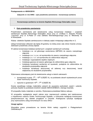 Dział Techniczny Szpitala Klinicznego Dzieciątka Jezus Postępowanie nr 49/KH/2016 Załącznik nr 2 do SIWZ – opis przedmiotu zamówienia – konserwacja sanitarna Konserwacja sanitarna na terenie Szpitala Klinicznego Dzieciątka Jezus 1. Opis przedmiotu zamówienia Przedmiotem zamówienia jest świadczenie usług konserwacji instalacji i urządzeń sanitarnych Szpitala Klinicznego Dzieciątka Jezus przy ul. Lindleya 4, Zespołu Poradni „Lecznica” przy ul. E.Plater 21 oraz Zakładu Stomatologicznego przy ul. Miodowej 18 w Warszawie. Wykaz obiektów Szpitala zamieszczono w dalszej części niniejszego załącznika nr 2. Usługi konserwacji odbywać się będą 24-godziny na dobę przez cały okres trwania umowy. Zakresem przedmiotu umowy będzie W zakres konserwacji instalacji sanitarnych i urządzeń sanitarnych wchodzą: • Instalacje z.w. od głównego wodomierza (MPWiK) do zaworu czerpalnego włącznie. • Instalacje c.w. i c.c.w. od wymiennika do zaworu czerpalnego włącznie. • Instalacje c.o. i c.t. od wymiennika do odbiorników włącznie. • Instalacje i wyposażenie węzłów cieplnych. • Instalacja gazowa od zaworu głównego do odbiorników gazu włącznie. • Instalacja kanalizacji sanitarnej od wywiewki, podejścia do odbiorników do studzienki przykanalika włącznie. • Instalacja kanalizacji deszczowej od żeliwnej rury deszczowej, kanał odpływowy do studzienki przykanalika. Wykonawca zobowiązany jest do świadczenia usługi w dwóch zakresach: • konserwacji w godz. 700 – 1500 (CZĘŚĆ A), na podstawie zleceń wystawianych przez Dział Techniczny Szpitala, • dyżurów w godzinach 1500 – 700 (CZĘŚĆ B). Koszty wszelkiego rodzaju materiałów użytych do usuwania uszkodzeń, awarii i usterek, pokrywa Szpital na podstawie średnich stawek SEKOCENBUD z danego kwartału. W przypadku braku materiału w cenniku, Wykonawca przedstawi faktury zakupu. W przypadku wystąpienia awarii zakres prac naprawczych ustalany jest każdorazowo z inspektorem nadzoru Działu Technicznego Szpitala, a rozliczenie następuje kosztorysem powykonawczym wg. stawek przyjętych w Umowie. Analogiczna sytuacja występuje przy wykonywaniu usług remontowych na rzecz SKDJ Uwagi ogólne: Wszystkie prace prowadzone na terenie Klinik należy uzgodnić z Pielęgniarkami Oddziałowymi. -Strona 1 z 12- Dział Techniczny Szpitala Klinicznego Dzieciątka Jezus Po wykonanych robotach należy niezwłocznie posprzątać. Zakres konserwacji obejmuje także kontrolę nad zewnętrzną infrastrukturą sanitarną na terenie SKDJ. W celu zapewnienia sprawnego użytkowania infrastruktury zewnętrznej wszelkie działania związane z instalacjami sanitarnymi należy podejmować wyłącznie po uzgodnieniu z Działem Technicznym SKDJ. 1.1. CZĘŚĆ A – KONSERWACJA W zakres czynności części A – konserwacja, wchodzi świadczenie usług naprawczych w godzinach 700-1500 na podstawie zgłoszeń - zleceń wystawionych przez Dział Techniczny Szpitala Klinicznego Dzieciątka Jezus. W przypadkach awaryjnych naprawy również mogą być prowadzone poza godzinami pracy administracji Szpitala. Poniesione nakłady w trakcie wykonywania czynności, rozliczane będą zbiorczym kosztorysem powykonawczym na podstawie zgłoszeń - zleceń wystawionych do realizacji oraz potwierdzeniem ich wykonania przez i Inspektora Nadzoru. Wykonawca zobowiązany jest do ciągłej gotowości i natychmiastowego podjęcia działania w celu usunięcia awarii, usterki zgłoszonej przez Dział Techniczny lub Użytkownika. 1.2. CZĘŚĆ B – DYŻUR Zakresem czynności części B – Dyżur, jest świadczenie usług dyżuru w godzinach 1500-700. Wykonawca w cenie ryczałtowej w sytuacji wystąpienia awarii ma obowiązek jej usunięcia, przynajmniej w stopniu zapewniającym ciągłość działania instalacji sanitarnych. Zgłoszenia usterek i awarii w godz. 15.00 – 7.00 kierowane będą bezpośrednio do konserwatorów. Zgłoszenia te konserwator zarejestruje w dzienniku zgłoszeń. W zakres dyżurów wchodzi również wykonywanie bieżących kontroli, sprawności instalacji i urządzeń, regulacja instalacji oraz urządzeń, jak również dokonywanie przeglądów prawidłowości działania instalacji i urządzeń sanitarnych. Konserwator ma obowiązek w czasie pełnienia dyżuru, bez zbędnej zwłoki, przystąpić do usuwania usterek, awarii i uszkodzeń zgłoszonych wcześniej, a także zgłoszonych w godzinach 15.00-7.00. 2. Definicje pojęć użytych do opisu przedmiotu zamówienia, jak również zakresu obowiązków. Konserwacja (CZĘŚĆ A 700-1500) – należy przez to rozumieć podejmowanie przez Wykonawcę niezbędnych czynności w celu zapewnienia bezawaryjnego działania instalacji i urządzeń sanitarnych Szpitala, jak również przyjmowanie zgłoszeń o Uszkodzeniach/Awariach/Usterkach wystawionych przez Dział Techniczny Szpitala Klinicznego Dzieciątka Jezus. Rozliczenie wykonania robót nastąpi zbiorczym kosztorysem powykonawczym na podstawie zgłoszeń wystawionych do realizacji, z potwierdzeniem ich wykonania przez przedstawiciela Użytkownika i Inspektora Nadzoru. Dyżur (CZĘŚĆ B 1500- 700) - także w dni wolne od pracy – należy przez to rozumieć kontynuację działań ujętych w zakresie „KONSERWACJA” i gotowość Wykonawcy do podjęcia działań w usuwaniu Uszkodzenia/Awarii przekazanych w zleceniu. Wykonawca ma zabezpieczyć do czasu całkowitej naprawy miejsce awarii i podjąć niezbędne działania umożliwiające eksploatację obiektu. O dalszych decyzjach i zakresie prac naprawczych decyzję podejmuje branżowy Inspektor Nadzoru Działu Technicznego. W zakres dyżurów -Strona 2 z 12- Dział Techniczny Szpitala Klinicznego Dzieciątka Jezus wchodzi również wykonywanie bieżących kontroli, sprawdzanie sprawności instalacji i urządzeń, regulacja instalacji, urządzeń, jak również dokonywanie przeglądów prawidłowości działania instalacji i urządzeń sanitarnych oraz obowiązkowe