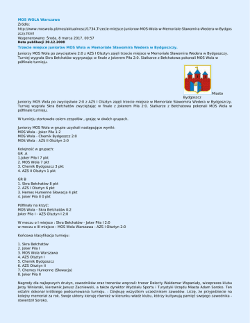 MOS WOLA Warszawa Źródło: http://www.moswola.pl/mos/aktualnosci/1734,Trzecie-miejsce-juniorow-MOS-Wola-w-Memoriale-Slawomira-Wedera-w-Bydgos zczy.html Wygenerowano: Środa, 8 marca 2017, 00:57 Data publikacji 30.12.2008 Trzecie miejsce juniorów MOS Wola w Memoriale Sławomira Wedera w Bydgoszczy. Juniorzy MOS Wola po zwycięstwie 2:0 z AZS I Olsztyn zajęli trzecie miejsce w Memoriale Sławomira Wedera w Bydgoszczy. Turniej wygrała Skra Bełchatów wygrywając w finale z Jokerem Piła 2:0. Siatkarze z Bełchatowa pokonali MOS Wola w półfinale turnieju. Miasto Bydgoszcz Juniorzy MOS Wola po zwycięstwie 2:0 z AZS I Olsztyn zajęli trzecie miejsce w Memoriale Sławomira Wedera w Bydgoszczy. Turniej wygrała Skra Bełchatów zwyciężając w finale z Jokerem Piła 2:0. Siatkarze z Bełchatowa pokonali MOS Wola w półfinale turnieju. W turnieju startowało osiem zespołów , grając w dwóch grupach. Juniorzy MOS Wola w grupie uzyskali następujące wyniki: MOS Wola - Joker Piła 1:2 MOS Wola - Chemik Bydgoszcz 2:0 MOS Wola - AZS II Olsztyn 2:0 Kolejność w grupach: GR .A 1.Joker Piła I 7 pkt 2. MOS Wola 7 pkt 3. Chemik Bydgoszcz 3 pkt 4. AZS II Olsztyn 1 pkt GR B 1. Skra Bełchatów 8 pkt 2. AZS I Olsztyn 6 pkt 3. Hemes Humenne Słowacja 4 pkt 4. Joker Piła II 0 pkt Półfinały na krzyź: MOS Wola - Skra Bełchatów 0:2 Joker Piła I - AZS Olsztyn I 2:0 W meczu o I miejsce : Skra Bełchatów - Joker Piła I 2:0 w meczu o III miejsce : MOS Wola Warszawa - AZS I Olsztyn 2:0 Końcowa klasyfikacja turnieju: 1. Skra Bełchatów 2. Joker Piła I 3. MOS Wola Warszawa 4. AZS Olsztyn I 5. Chemik Bydgoszcz 6. AZS Olsztyn II 7. Chemes Humenne (Słowacja) 8. Joker Piła II Nagrody dla najlepszych drużyn, zawodników oraz trenerów wręczali: trener Delecty Waldemar Wspaniały, wiceprezes klubu Jerzy Winiarski, kierownik Janusz Zacniewski, a także dyrektor Wydziału Sportu i Turystyki Urzędu Miasta Adam Soroko. Ten ostatni dokonał krótkiego podsumowania turnieju. - Dziękuję wszystkim uczestnikom zawodów. Liczę, że przyjedziecie na kolejny memoriał za rok. Swoje ukłony kieruję również w kierunku władz klubu, którzy kultywują pamięć swojego zawodnika stwierdził Soroko. Skład MOS-u : Dmowski, Nassalaki, Behr Mateusz, Trzciński, Chiniewicz, Behr Maciej, Guz (libero) oraz Obidziński, Schamlewski, Nikonowicz. Komentarz (0) dodaj komentarz Brak komentarzy dodaj komentarz