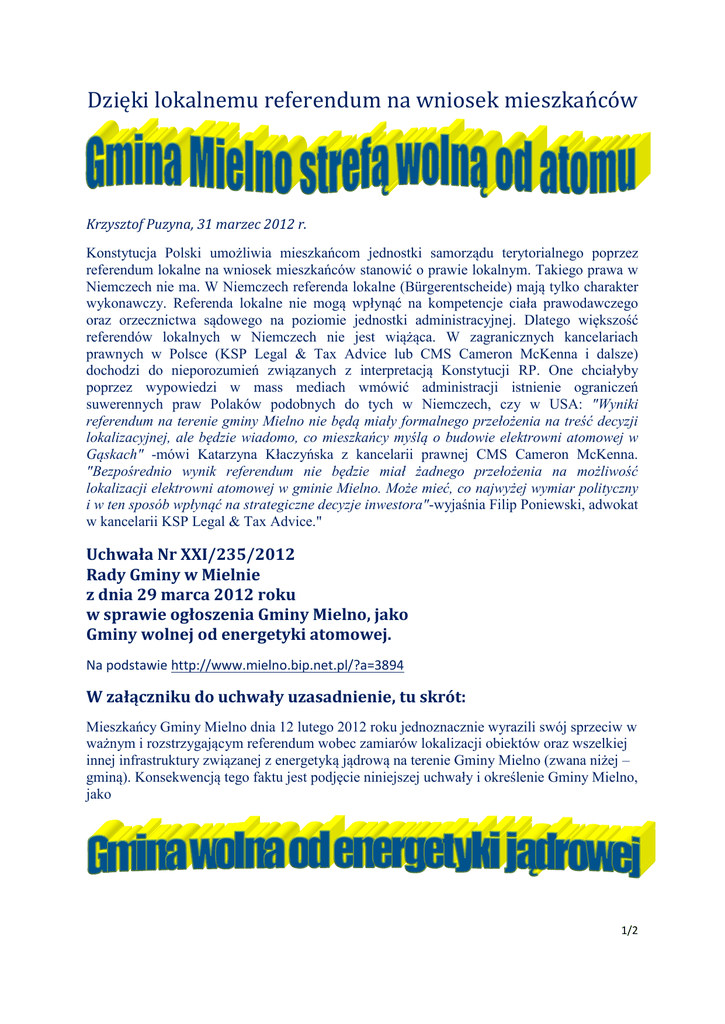 Dzięki lokalnemu referendum na wniosek mieszkańców Krzysztof Puzyna, 31 marzec 2012 r. Konstytucja Polski umożliwia mieszkańcom jednostki samorządu terytorialnego poprzez referendum lokalne na wniosek mieszkańców stanowić o prawie lokalnym. Takiego prawa w Niemczech nie ma. W Niemczech referenda lokalne (Bürgerentscheide) mają tylko charakter wykonawczy. Referenda lokalne nie mogą wpłynąć na kompetencje ciała prawodawczego oraz orzecznictwa sądowego na poziomie jednostki administracyjnej. Dlatego większość referendów lokalnych w Niemczech nie jest wiążąca. W zagranicznych kancelariach prawnych w Polsce (KSP Legal & Tax Advice lub CMS Cameron McKenna i dalsze) dochodzi do nieporozumień związanych z interpretacją Konstytucji RP. One chciałyby poprzez wypowiedzi w mass mediach wmówić administracji istnienie ograniczeń suwerennych praw Polaków podobnych do tych w Niemczech, czy w USA: "Wyniki referendum na terenie gminy Mielno nie będą miały formalnego przełożenia na treść decyzji lokalizacyjnej, ale będzie wiadomo, co mieszkańcy myślą o budowie elektrowni atomowej w Gąskach" -mówi Katarzyna Kłaczyńska z kancelarii prawnej CMS Cameron McKenna. "Bezpośrednio wynik referendum nie będzie miał żadnego przełożenia na możliwość lokalizacji elektrowni atomowej w gminie Mielno. Może mieć, co najwyżej wymiar polityczny i w ten sposób wpłynąć na strategiczne decyzje inwestora"-wyjaśnia Filip Poniewski, adwokat w kancelarii KSP Legal & Tax Advice." Uchwała Nr XXI/235/2012 Rady Gminy w Mielnie z dnia 29 marca 2012 roku w sprawie ogłoszenia Gminy Mielno, jako Gminy wolnej od energetyki atomowej. Na podstawie http://www.mielno.bip.net.pl/?a=3894 W załączniku do uchwały uzasadnienie, tu skrót: Mieszkańcy Gminy Mielno dnia 12 lutego 2012 roku jednoznacznie wyrazili swój sprzeciw w ważnym i rozstrzygającym referendum wobec zamiarów lokalizacji obiektów oraz wszelkiej innej infrastruktury związanej z energetyką jądrową na terenie Gminy Mielno (zwana niżej – gminą). Konsekwencją tego faktu jest podjęcie niniejszej uchwały i określenie Gminy Mielno, jako 1/2 Pełny tekst uzasadnienia do Uchwały nr 235 http://iddd.de/umtsno/bocian/Mielno/Z235RGMielnoUzas.pdf Uchwała Nr XXI/236/2012 Rady Gminy w Mielnie z dnia 29 marca 2012 roku w sprawie wezwania PGE Polskiej Grupy Energetycznej S.A. do natychmiastowego odstąpienia od realizacji działań związanych z budową energetyki atomowej na terenie Gminy Mielno. W załączniku do uchwały uzasadnienie, tu skrót: 1. Brak definicji organu kompetentnego do wydania decyzji o wskazaniu lokalizacji inwestycji. 2. Kompetencje gminy, jako organu do wydania decyzji o wskazaniu lokalizacji inwestycji. 3. Brak wykluczenia samorządu gminy lub wskazania innego organu do podjęcia decyzji o wskazaniu lokalizacji inwestycji. 4. Kompetencja nadana samorządowi gminy przez referendum lokalne. 5. Wniosek o wydanie odmowy wskazania lokalizacji inwestycji przez samorząd gminy. Pełny tekst uzasadnienia do Uchwały nr 236 http://iddd.de/umtsno/bocian/Mielno/Z236RGMielnoUzas.pdf Uchwały: 1. 2. 3. 4. 5. http://iddd.de/umtsno/bocian/Mielno/231RGMielno.pdf http://iddd.de/umtsno/bocian/Mielno/232RGMielno.pdf http://iddd.de/umtsno/bocian/Mielno/233RGMielno.pdf http://iddd.de/umtsno/bocian/Mielno/234RGMielno.pdf http://iddd.de/umtsno/bocian/Mielno/235RGMielno.pdf 6. http://iddd.de/umtsno/bocian/Mielno/236RGMielno.pdf Dipl.-Ing. Krzysztof Puzyna Hütten 118 D-20355 Hamburg Tel. 004940342797 E-Mail: [email protected] Web: http://iddd.de Narody Europy dojrzały do Demokracji Bezpośredniej. Prawdziwi Suwereni posiadają naturalne prawo do samorządzenia i do rozstrzygania o własnym losie. Jak mówią Szwajcarzy: Naród ma zawsze rację nawet, jeśli ona jest sprzeczna z konstytucją. 2/2