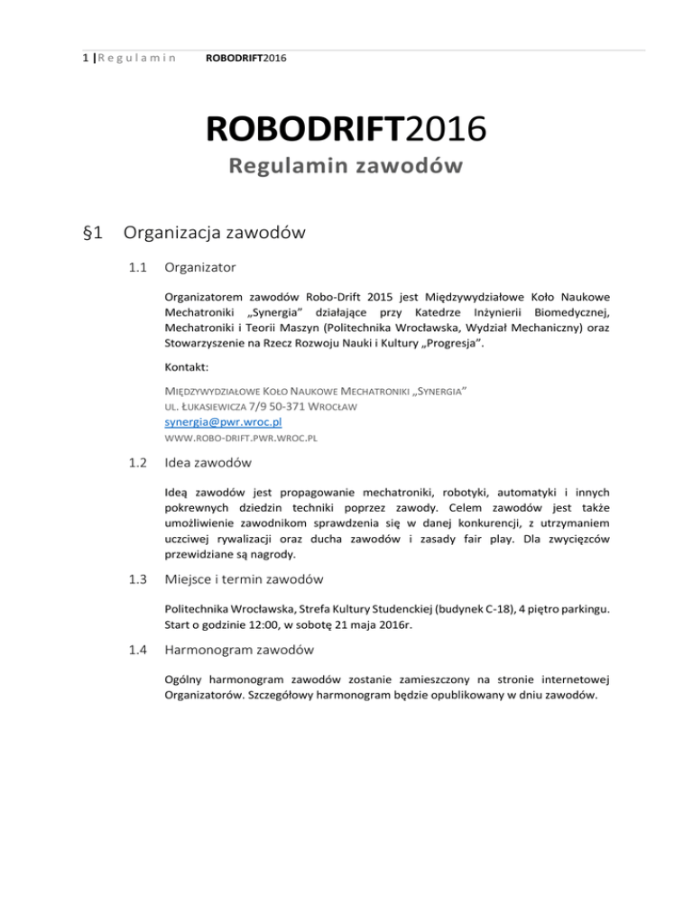 1 |R e g u l a m i n ROBODRIFT2016 ROBODRIFT2016 Regulamin zawodów §1 Organizacja zawodów 1.1 Organizator Organizatorem zawodów Robo-Drift 2015 jest Międzywydziałowe Koło Naukowe Mechatroniki „Synergia” działające przy Katedrze Inżynierii Biomedycznej, Mechatroniki i Teorii Maszyn (Politechnika Wrocławska, Wydział Mechaniczny) oraz Stowarzyszenie na Rzecz Rozwoju Nauki i Kultury „Progresja”. Kontakt: MIĘDZYWYDZIAŁOWE KOŁO NAUKOWE MECHATRONIKI „SYNERGIA” UL. ŁUKASIEWICZA 7/9 50-371 WROCŁAW [email protected] WWW.ROBO-DRIFT.PWR.WROC.PL 1.2 Idea zawodów Ideą zawodów jest propagowanie mechatroniki, robotyki, automatyki i innych pokrewnych dziedzin techniki poprzez zawody. Celem zawodów jest także umożliwienie zawodnikom sprawdzenia się w danej konkurencji, z utrzymaniem uczciwej rywalizacji oraz ducha zawodów i zasady fair play. Dla zwycięzców przewidziane są nagrody. 1.3 Miejsce i termin zawodów Politechnika Wrocławska, Strefa Kultury Studenckiej (budynek C-18), 4 piętro parkingu. Start o godzinie 12:00, w sobotę 21 maja 2016r. 1.4 Harmonogram zawodów Ogólny harmonogram zawodów zostanie zamieszczony na stronie internetowej Organizatorów. Szczegółowy harmonogram będzie opublikowany w dniu zawodów. 2 |R e g u l a m i n ROBODRIFT2016 §2 Zasady uczestnictwa 2.1 Rejestracja drużyny Aby wziąć udział w zawodach należy dokonać rejestracji poprzez stronę internetową: http://robo-drift.pwr.wroc.pl. Drużyny mogą zgłaszać dowolną liczbę pojazdów spełniających wymogi w każdej z kategorii. Rejestracja możliwa jest przez formularz rejestracyjny na stronie Zawodów lub bezpośrednio u Organizatorów w dniu zawodów z uwzględnieniem za wyjątkiem pojazdów startujących w kategorii Time Attack, których masa przekracza 10 kg. W takiej sytuacji rejestracja jest możliwa najpóźniej do 30 dni przed zawodami. 2.2 Dokumentacja Poza wymaganą rejestracją Drużyna zobowiązana jest dostarczyć drogą elektroniczną dokumentację zawierającą podstawowe informacje o swoich pojazdach tj. skład drużyny, instytucja delegująca, nazwa robota, kategoria robota, zdjęcie, wymiary, moc, rodzaj silnika i inne dane techniczne. Plik należy dostarczyć Organizatorom pocztą elektroniczną najpóźniej w dniu zamknięcia rejestracji dla danej kategorii. Właściwa dokumentacja powinna być zapisana w formacie *.pdf o maksymalnym rozmiarze jednej strony A4 zorientowanej poziomo lub jako prezentacja programu Microsoft Power Point. Przesłane dokumentacje będą opublikowane na stronie Organizatorów oraz wyświetlane podczas zawodów. §3 Kategorie pojazdów 3.1 Kategoria RC-Standard Do tej kategorii dopuszczone będą pojazdy RC produkowane seryjnie bądź oparte na standardowych, dostępnych w handlu częściach modelarskich, które nie były modyfikowane przez drużynę. Pojazdy zgłoszone do tej kategorii nie biorą udziału w konkurencji związanej z oceną konstrukcji - Freestyle. Przy zgłoszeniu w dokumentacji należy zawrzeć informacje o modelu i skali pojazdu oraz informacje na temat jego producenta. 3.2 Kategoria Robo-Drift Do tej kategorii dopuszczone będą samodzielnie zaprojektowane i skonstruowane pojazdy. Startować mogą pojazdy zarówno sterowane zdalnie, jak i autonomiczne. §4 Konkurencje i specyfikacja pojazdów 4.1 Time Attack Jest to klasyczny wyścig pojazdów zdalnie sterowanych lub autonomicznych, który odbywać się będzie po wyznaczonym torze. Do orientacji w przestrzeni dostępna będzie linia środkowa (pojazdy klasy linefollower) oraz boczne bandy zabezpieczające 3 |R e g u l a m i n ROBODRIFT2016 tor. O wygranej decyduje czas przejazdu. Czas mierzony będzie elektronicznie za pośrednictwem czujników umieszczonych na starcie i mecie. Ponadto pojazd startujący w tej konkurencji musi spełniać następujące warunki: Wymiary maksymalne: 120 𝑥 80 𝑐𝑚 (pełna paleta EURO) oraz wysokość mniejsza od 80 𝑐𝑚, Dopuszczalna masa: 20 kg W tej konkurencji pojazdy będą klasyfikowane w oddzielnych kategoriach: 4.2 RC-Standard Robo-Drift Off-Road Wyścig z przeszkodami, polegający na swobodnej jeździe w obrębie wyznaczonej powierzchni i pokonywaniu przeszkód znajdujących się na trasie. O zwycięstwie decyduje suma punktów za każdą pokonaną przeszkodę. Punktacja zostanie podana w dniu zawodów. Czas, jaki otrzymują zawodnicy na pokonanie trasy zostanie określony przez Sędziego Głównego w dniu zawodów. 4.3 Freestyle Wystawa każdego robota mobilnego, w której przez Jury oceniany będzie najciekawiej zaprojektowana konstrukcja. Będą brane pod uwagę między innymi: działanie pojazdu, zastosowane rozwiązania konstrukcyjne, estetyka wykonania, użyte technologie. Dodatkowe punkty w tej kategorii można zdobyć uczestnicząc, jako prelegent, w seminarium RoboDrift. §5 Obowiązkowe wymagania dla pojazdów 5.1 Wymiary 5.2 Wymiary maksymalne: 120 𝑥 80 𝑐𝑚 (pełna paleta EURO) oraz wysokość mniejsza od 80 𝑐𝑚, Dopuszczalna masa: 20 kg Inne Zabrania się, aby podczas przejazdu na zewnątrz robota znajdowały się jakiekolwiek niebezpieczne części W przypadku, gdy Organizatorzy uznają, że pojazd zagraża bezpieczeństwu lub sprawnemu przeprowadzeniu Zawodów, nie zostanie on dopuszczony do uczestnictwa. 4 |R e g u l a m i n ROBODRIFT2016 §6 Specyfikacja toru 6.1 Time Attack Tor w każdym miejscu będzie miał szerokość około 1,2 m. Ograniczony będzie bandami o wysokości około 0,3 m wykonanymi z płyt OSB. W części środkowej toru umieszczona będzie biała linia o szerokości około 40 𝑐𝑚 z czarnym paskiem o szerokości około 15 𝑐𝑚. 6.2 Off-Road Na tor składać się będzie szereg przeszkód zdefiniowanych na 14 dni przed zawodami. Co najmniej połowa będzie możliwa do pokonania przy pomocy pojazdu typu RCStandard pod warunkiem sprawnego poruszania się nim. W skład toru wejdą między innymi: Płyty OSB Cegły Dźwignia Fragment trasy gruntowej (żwir lub