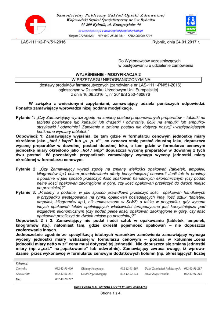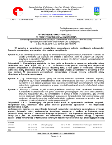 S a m od z i e l n y P ub l i c zn y Za k ł ad Op i e k i Zdr o w o tn e j Wojewódzki Szpital Specjalistyczny nr 3 w Rybniku 44-200 Rybnik, ul. Energetyków 46 www.szpital.rybnik.pl, e-mail: [email protected] Regon 272780323; NIP: 642-25-85-351; KRS: 0000067701 20 LAS-1111/2-PN/51-2016 Rybnik, dnia 24.01.2017 r. Do Wykonawców uczestniczących w postępowaniu o udzielenie zamówienia WYJAŚNIENIE - MODYFIKACJA 2 W PRZETARGU NIEOGRANICZONYM NA: dostawy produktów farmaceutycznych (zamówienie nr LAS-1111-PN/51-2016) ogłoszonym w Dzienniku Urzędowym Unii Europejskiej z dnia 16.06.2016 r., nr 2016/S 250-460676 W związku z wniesionymi zapytaniami, zamawiający udziela poniższych odpowiedzi. Ponadto zamawiający wprowadza niżej podane modyfikacje. Pytanie 1: „Czy Zamawiający wyrazi zgodę na zmianę postaci proponowanych preparatów – tabletki na tabletki powlekane lub kapsułki lub drażetki i odwrotnie, fiolki na ampułki lub ampułkostrzykawki i odwrotnie? Zapytanie o zmianę postaci nie dotyczy pozycji uwzględniających konkretne wymiary tabletek.” Odpowiedź 1: Zamawiający wyjaśnia, że tam gdzie w formularzu cenowym jednostkę miary określono jako „tabl / kaps” lub „s. p. d.”, co oznacza stałą postać doustną leku, dopuszcza wycenę preparatów w dowolnej postaci doustnej leku, a tam gdzie w formularzu cenowym jednostkę miary określono jako „fiol / amp” dopuszcza wycenę preparatów w dowolnej z tych dwu postaci. W pozostałych przypadkach zamawiający wymaga wyceny jednostki miary określonej w formularzu cenowym. Pytanie 2: „Czy Zamawiający wyrazi zgodę na zmianę wielkości opakowań (tabletek, ampułek, kilogramów itp.) celem przedstawienia oferty korzystniejszej cenowo? Jeśli tak to prosimy o podanie w jaki sposób przeliczyć ilość opakowań handlowych ekonomicznym (czy podać pełne ilości opakowań zaokrąglone w górę, czy ilość opakowań przeliczyć do dwóch miejsc po przecinku)?” Pytanie 3: „Prosimy o podanie, w jaki sposób prawidłowo przeliczyć ilość opakowań handlowych w przypadku występowania na rynku opakowań posiadających inną ilość sztuk (tabletek, ampułek, kilogramów itp.), niż umieszczone w SIWZ; a także w przypadku, gdy wycena innych opakowań leków spełniających właściwości terapeutyczne jest korzystniejsza pod względem ekonomicznym (czy podać pełne ilości opakowań zaokrąglone w górę, czy ilość opakowań przeliczyć do dwóch miejsc po przecinku)?” Odpowiedź 2 i 3: Zamawiający nie podał ilości sztuk w opakowaniu (tabletek, ampułek, kilogramów itp.), natomiast tam, gdzie określił pojemność opakowań – nie dopuszcza zaoferowania innych. Jednocześnie zgodnie ze specyfikacją istotnych warunków zamówienia zamawiający wymaga wyceny jednostki miary wskazanej w formularzu cenowym – podana w kolumnie „cena jednostki miary netto w zł” cena musi dotyczyć tej jednostki. Nie dopuszcza się zmiany jednostki miary (np. z „szt.” na „opakowanie” lub odwrotnie). Zamawiający zwraca uwagę, iż wprowadzanie przez wykonawcę w formularzu cenowym dodatkowych kolumn (np. określających liczbę Telefony: Centrala: 032 42-91-000 Główny Księgowy: 032 42-91-299 Dział Zamówień Publicznych: 032 42-91-287 Sekretariat: 032 42-91-251 Dział Organizacyjny: 032 42-92-613 Dział Zaopatrzenia: 032 42-91-214 Fax: 032 42-28-272 Bank Pekao S.A. 58 1240 4272 1111 0000 4833 4765 Strona 1 z 4 sztuk w opakowaniu) może prowadzić do sytuacji braku jednoznaczności oferty lub obliczenia ceny oferty w sposób odmienny od określonego przez zamawiającego w punkcie X specyfikacji, a w konsekwencji – do odrzucenia oferty. Pytanie 4: „Zwracamy się z prośbą o określenie w jaki sposób postąpić w przypadku zaprzestania lub braku produkcji danego preparatu. Czy Zamawiający wyrazi zgodę na podanie ostatniej ceny i informacji pod pakietem?” Odpowiedź 4: Zgodnie z pkt. VIII.b specyfikacji istotnych warunków zamówienia - brak wyceny danej pozycji formularza cenowego lub adnotacja o tym, iż lek nie jest obecnie dostępny, a podana cena jest ostatnią ceną sprzedaży lub że wykonawca nie jest w stanie zagwarantować stałości ceny – są równoważne z niezaoferowaniem danej pozycji - spowoduje odrzucenie oferty, jako niezgodnej ze specyfikacją istotnych warunków zamówienia. W niniejszym piśmie zamawiający w odpowiedzi na zapytania wykonawców dotyczące braku dostępności konkretnych pozycji wprowadza jednoznaczne modyfikacje polegające m. in. na wykreśleniu poszczególnych pozycji – ofertę należy złożyć w oparciu o ostateczne brzmienie opisu przedmiotu zamówienia ustalone niniejszym pismem. Pytanie 5: „Czy w Pakiet 14 poz. 1 (Macrogol 4000 proszek do sporządzania roztworu doustnego, saszetka a 74 g) Zamawiający wyrazi zgodę na wycenę preparatu Moviprep x 4 sasz. (pr.do sporz.rozt.doust.* 1zest.) i po przeliczeniu zaoferowanie 2500 opakowań? Informujemy, że jeden zestaw czterech saszetek Moviprep zawiera (Pr. Do p.rozt.doust 1 zestaw: 2 torebki A + 2 torebki B. Saszetka A: Makrogol 100g, Sodu siarczan bezwodny 7,5g, Sodu chlorek 2,691, Potasu chlorek 1,015g. Saszetka B: Kwas ascorbowy 4,7g, Sodu ascorbinian 5,9g.) i pozwala na przygotowanie do zabiegu jednego pacjenta. Skuteczne oczyszczanie jelita uzyskuje się przy użyciu 2 litrów leku MOVIPREP® dzięki połączeniu makrogolu 3350z komponentą askorbinową i elektrolitami. Dodatek askorbinianu powoduje nasilenie efektu przeczyszczającego poprzez zwiększenie objętości stolca o 25% w porównaniu do efektu wywoływanego przez roztwór niezawierający tego składnika. Badania wykazały, że w porównaniu do 4 litrów innego, badanego roztworu z makrogolem: • MOVIPREP® (2 l) ma zdecydowanie lepiej akceptowaną objętość, dzięki czemu jest łatwiejszy do wypicia dla pacjentów. • MOVIPREP® (2 l) jest oceniany przez pacjentów jako zdecydowanie smaczniejszy(o smaku cytrynowym). • MOVIPREP