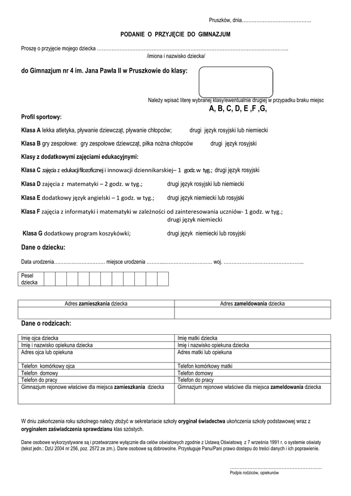 Pruszków, dnia……………………………………. PODANIE O PRZYJĘCIE DO GIMNAZJUM Proszę o przyjęcie mojego dziecka ……………………………………………………………………………………………………….. ……………………………………………………………………/imiona i nazwisko dziecka/ do Gimnazjum nr 4 im. Jana Pawła II w Pruszkowie do klasy: NaleŜy wpisać literę wybranej klasy/ewentualnie drugiej w przypadku braku miejsc A, B, C, D, E ,F ,G, Profil sportowy: Klasa A lekka atletyka, pływanie dziewcząt, pływanie chłopców; drugi język rosyjski lub niemiecki Klasa B gry zespołowe: gry zespołowe dziewcząt, piłka noŜna chłopców drugi język rosyjski Klasy z dodatkowymi zajęciami edukacyjnymi: Klasa C zajęcia z edukacji filozoficznej i innowacji dziennikarskiej– 1 godz. w tyg.; drugi język rosyjski Klasa D zajęcia z matematyki – 2 godz. w tyg.; drugi język rosyjski lub niemiecki Klasa E dodatkowy język angielski – 1 godz. w tyg.; drugi język niemiecki lub rosyjski Klasa F zajęcia z informatyki i matematyki w zależności od zainteresowania uczniów- 1 godz. w tyg.; drugi język niemiecki Klasa G dodatkowy program koszykówki; drugi język niemiecki lub rosyjski Dane o dziecku: Data urodzenia…………………….……. miejsce urodzenia ………..………………………… woj. ………………………………………….. Pesel dziecka Adres zamieszkania dziecka Adres zameldowania dziecka Dane o rodzicach: Imię ojca dziecka Imię i nazwisko opiekuna dziecka Adres ojca lub opiekuna Imię matki dziecka Imię i nazwisko opiekuna dziecka Adres matki lub opiekuna Telefon komórkowy ojca Telefon domowy Telefon do pracy Gimnazjum rejonowe właściwe dla miejsca zamieszkania dziecka Telefon komórkowy matki Telefon domowy Telefon do pracy Gimnazjum rejonowe właściwe dla miejsca zameldowania dziecka W dniu zakończenia roku szkolnego naleŜy złoŜyć w sekretariacie szkoły oryginał świadectwa ukończenia szkoły podstawowej wraz z oryginałem zaświadczenia sprawdzianu klas szóstych. Dane osobowe wykorzystywane są i przetwarzane wyłącznie dla celów oświatowych zgodnie z Ustawą Oświatową z 7 września 1991 r. o systemie oświaty (tekst jedn.: DzU 2004 nr 256, poz. 2572 ze zm.). Dane osobowe są dobrowolne. Przysługuje Panu/Pani prawo dostępu do treści danych i ich poprawienie. ………………………………………………… Podpis rodziców, opiekunów Oceny I półrocza klasy VI - Zachowanie ……………………………………………………. - Jęz. polski ……………………………………………………. - Historia i społeczeństwo ………………………………………………….. - Jęz. angielski …………………………………………………… - Matematyka …………………………………………………… - Przyroda ……………………………………………………. - Muzyka ……………………………………………………. -Technika ……………………………………………………. - Informatyka …………………………………………………… - Wychowanie fizyczne ……………………………………………………. -Religia ……………………………………………………. - ………………… …………………………………………………… ………………………………………………………………….. (podpis wychowawcy) POTWIERDZENIE SZKOŁY PODSTAWOWEJ Potwierdzam, Ŝe ……………………………………………………………………………………..jest uczniem (uczennicą) (imiona i nazwisko ucznia) ………………………………………………………….. (pieczęć podłuŜna szkoły podstawowej) …………………………………………… (podpis dyrektora szkoły)