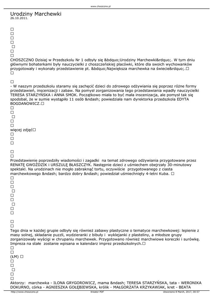 CHOSZCZNO Dzisiaj w Przedszkolu Nr 1 odbyły się „Urodziny Marchewki”. W tym dniu