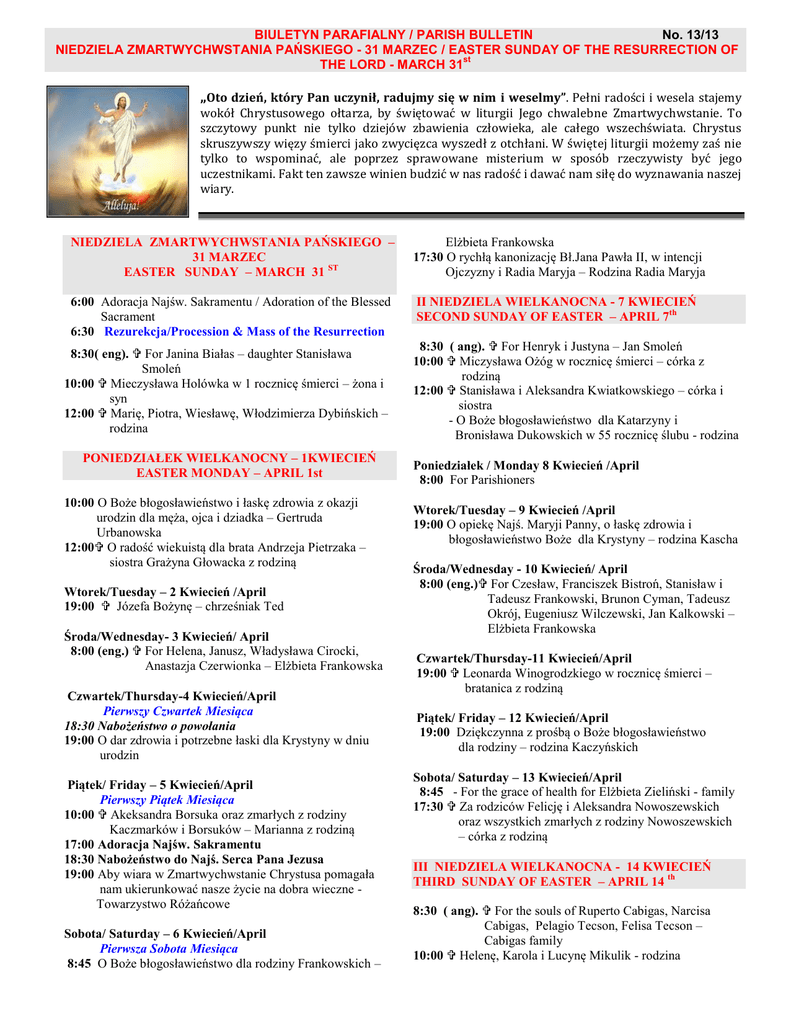BIULETYN PARAFIALNY / PARISH BULLETIN No. 13/13 NIEDZIELA ZMARTWYCHWSTANIA PAŃSKIEGO - 31 MARZEC / EASTER SUNDAY OF THE RESURRECTION OF st THE LORD - MARCH 31 „Oto dzień, który Pan uczynił, radujmy się w nim i weselmy”. Pełni radości i wesela stajemy wokół Chrystusowego ołtarza, by świętować w liturgii Jego chwalebne Zmartwychwstanie. To szczytowy punkt nie tylko dziejów zbawienia człowieka, ale całego wszechświata. Chrystus skruszywszy więzy śmierci jako zwycięzca wyszedł z otchłani. W świętej liturgii możemy zaś nie tylko to wspominać, ale poprzez sprawowane misterium w sposób rzeczywisty być jego uczestnikami. Fakt ten zawsze winien budzić w nas radość i dawać nam siłę do wyznawania naszej wiary. NIEDZIELA ZMARTWYCHWSTANIA PAŃSKIEGO – 31 MARZEC EASTER SUNDAY – MARCH 31 ST Elżbieta Frankowska 17:30 O rychłą kanonizację Bł.Jana Pawła II, w intencji Ojczyzny i Radia Maryja – Rodzina Radia Maryja 6:00 Adoracja Najśw. Sakramentu / Adoration of the Blessed Sacrament 6:30 Rezurekcja/Procession & Mass of the Resurrection II NIEDZIELA WIELKANOCNA - 7 KWIECIEŃ SECOND SUNDAY OF EASTER – APRIL 7th 8:30( eng). For Janina Białas – daughter Stanisława Smoleń 10:00 Mieczysława Holówka w 1 rocznicę śmierci – żona i syn 12:00 Marię, Piotra, Wiesławę, Włodzimierza Dybińskich – rodzina PONIEDZIAŁEK WIELKANOCNY – 1KWIECIEŃ EASTER MONDAY – APRIL 1st 10:00 O Boże błogosławieństwo i łaskę zdrowia z okazji urodzin dla męża, ojca i dziadka – Gertruda Urbanowska 12:00 O radość wiekuistą dla brata Andrzeja Pietrzaka – siostra Grażyna Głowacka z rodziną Wtorek/Tuesday – 2 Kwiecień /April 19:00 Józefa Bożynę – chrześniak Ted Środa/Wednesday- 3 Kwiecień/ April 8:00 (eng.) For Helena, Janusz, Władysława Cirocki, Anastazja Czerwionka – Elżbieta Frankowska Czwartek/Thursday-4 Kwiecień/April Pierwszy Czwartek Miesiąca 18:30 Nabożeństwo o powołania 19:00 O dar zdrowia i potrzebne łaski dla Krystyny w dniu urodzin Piątek/ Friday – 5 Kwiecień/April Pierwszy Piątek Miesiąca 10:00 Akeksandra Borsuka oraz zmarłych z rodziny Kaczmarków i Borsuków – Marianna z rodziną 17:00 Adoracja Najśw. Sakramentu 18:30 Nabożeństwo do Najś. Serca Pana Jezusa 19:00 Aby wiara w Zmartwychwstanie Chrystusa pomagała nam ukierunkować nasze życie na dobra wieczne Towarzystwo Różańcowe Sobota/ Saturday – 6 Kwiecień/April Pierwsza Sobota Miesiąca 8:45 O Boże błogosławieństwo dla rodziny Frankowskich – 8:30 ( ang). For Henryk i Justyna – Jan Smoleń 10:00 Miczysława Ożóg w rocznicę śmierci – córka z rodziną 12:00 Stanisława i Aleksandra Kwiatkowskiego – córka i siostra - O Boże błogosławieństwo dla Katarzyny i Bronisława Dukowskich w 55 rocznicę ślubu - rodzina Poniedziałek / Monday 8 Kwiecień /April 8:00 For Parishioners Wtorek/Tuesday – 9 Kwiecień /April 19:00 O opiekę Najś. Maryji Panny, o łaskę zdrowia i błogosławieństwo Boże dla Krystyny – rodzina Kascha Środa/Wednesday - 10 Kwiecień/ April 8:00 (eng.) For Czesław, Franciszek Bistroń, Stanisław i Tadeusz Frankowski, Brunon Cyman, Tadeusz Okrój, Eugeniusz Wilczewski, Jan Kalkowski – Elżbieta Frankowska Czwartek/Thursday-11 Kwiecień/April 19:00 Leonarda Winogrodzkiego w rocznicę śmierci – bratanica z rodziną Piątek/ Friday – 12 Kwiecień/April 19:00 Dziękczynna z prośbą o Boże błogosławieństwo dla rodziny – rodzina Kaczyńskich Sobota/ Saturday – 13 Kwiecień/April 8:45 - For the grace of health for Elżbieta Zieliński - family 17:30 Za rodziców Felicję i Aleksandra Nowoszewskich oraz wszystkich zmarłych z rodziny Nowoszewskich – córka z rodziną III NIEDZIELA WIELKANOCNA - 14 KWIECIEŃ THIRD SUNDAY OF EASTER – APRIL 14 th 8:30 ( ang). For the souls of Ruperto Cabigas, Narcisa Cabigas, Pelagio Tecson, Felisa Tecson – Cabigas family 10:00 Helenę, Karola i Lucynę Mikulik - rodzina 12:00 Za pomordowanych w Katyniu, Starobielsku,Miednojach oraz w tych wszystkich jeszcze nie znanych miejscach w Związku Sowieckim w latach II wojny światowej – SPK Radosne „Alleluja”, jest dzisiaj na naszych ustach i w naszych sercach. Niech radość wielkanocnego poranka dotrze do każdego ludzkiego serca. Niech będzie zadatkiem i zapowiedzią wiecznego świętowania z Jezusem Zmartwychwstałym. Przyjmijcie z serca płynące życzenia. Przeżywając te święta jako ludzie wierzący, pragniemy, aby wiara w to, że Jezus zmartwychwstał, że żyje i jest wśród nas, przeniknęła nasze serce i była obecna w naszym codziennym życiu, w każdym jego wymiarze. WESOŁYCH ŚWIĄT! OGŁOSZENIA DUSZPASTERSKIE WITAMY – w naszej wspólnocie O. Mieczysława Burdzy, omi, z Toronto, Dyrektora Powołań w prowincji Wniebowzięcia, który spędzi z nami Święta i nam pomoże w liturgii Wielkanocnej. MINISTRANCI – Zapraszają wszystkich Parafian do zakupu lukrowanych babek wielkanocnych w Wielką Sobotę w sali szkolnej o godz 11:00. Dochód przeznaczony będzie na potrzeby Ministrantów. Panu Panu Edwardowi Gacek dziękujemy za wypieki. PODZIĘKOWANIA – Dziękujemy wszystkim, którzy zatroszczyli się o wystrój naszego kościoła na Święta Zmartwychwstania oraz przyczynili się do uświetnienia tych wydarzeń. Niech Pan Bóg wynagrodzi Wasz trud i zaangażowanie. Dziękujemy Paniom z Komitetu Imprezowego za przygotowanie obiadu i wyprzedaży świątecznej w naszej parafii. Dochód wyniósł $ 1,360.00 WYRAZY WDZIĘCZNOŚCI – Grupa Lektorów angielskich pragnie z całego serca gorąco i serdecznie podziękować parafianom za ponowne wspaniałe i hojne poparcie naszej zbiórki na „Agape Street Ministry”.Wszystkie dary zostały dostarczone 26 Marca. Bóg Zapłać! ŚWIĘTO MIŁOSIERDZIA BOŻEGO – W niedzielę 7 Kwietnia obchodzimy Święto Miłosierdzia Bożego tzw. Niedziela Biała. Uroczystości poprzedzi nowenna do Miłosierdzia Bożego. Po Mszy Św. o godz. 12:00 zostanie przeds