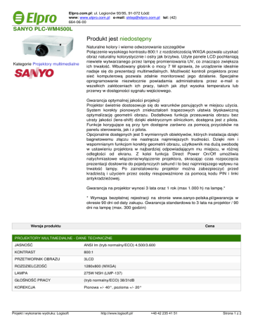 Elpro.com.pl: ul. Legionów 93/95, 91-072 Łódź www: www.elpro.com.pl e-mail: [email protected] tel: (42) 664-06-00 SANYO PLC-WM4500L Produkt jest niedostępny Kategorie Projektory multimedialne Naturalne kolory i wierne odwzorowanie szczegółów Połączenie wysokiego kontrastu 800:1 z rozdzielczością WXGA pozwala uzyskać obraz naturalny kolorystycznie i ostry jak brzytwa. Użyte panele LCD pochłaniają niewiele wytwarzanego przez lampę promieniowania UV, co znacząco zwiększa ich trwałość. Wbudowany głośnik o mocy 7 W sprawia, że urządzenie idealnie nadaje się do prezentacji multimedialnych. Możliwość kontroli projektora przez sieć komputerową pozwala zdalnie monitorować jego działanie. Specjalne oprogramowanie niezwłocznie powiadamia administratora przez e-mail o wszelkich zakłóceniach ich pracy, takich jak zbyt wysoka temperatura lub przerwy w dostępności sygnału wejściowego. Gwarancja optymalnej jakości projekcji Projektor świetnie dostosowuje się do warunków panujących w miejscu użycia. System korekty pionowych zniekształceń trapezowych ułatwia błyskawiczną optymalizację geometrii obrazu. Dodatkowa funkcja przesuwania obrazu bez utraty jakości (lens-shift) dzięki elektrycznym silniczkom, dostępna jest z pilota. Funkcje korygujące są przy tym dostępne zarówno za pomocą przycisków na panelu sterowania, jak i z pilota. Opcjonalnie dostępnych jest 5 wymiennych obiektywów, których instalacja dzięki bagnetowemu złączu nie nastręcza najmniejszych trudności. Dzięki nim i wspomnianym funkcjom korekty geometrii obrazu, użytkownik ma dużą swobodę w ustawieniu projektora w najbardziej odpowiadającym mu miejscu, w różnej odległości od ekranu. Z kolei funkcja Direct Power On/Off umożliwia natychmiastowe włączenie/wyłączenie projektora, skracając czas rozpoczęcia prezentacji dosłownie do pojedynczych sekund i to bez najmniejszego wpływu na trwałość lampy. Po zainstalowaniu projektor można zabezpieczyć przed kradzieżą i użyciem przez osoby nieupoważnione za pomocą kodu PIN i linki antykradzieżowej. Gwarancja na projektor wynosi 3 lata oraz 1 rok (max 1.000 h) na lampę.* * Wymaga bezpłatnej rejestracji na stronie www.sanyo-polska.pl/gwarancja w okresie 90 dni od daty zakupu. Gwarancja standardowa to 3 lata na projektor / 90 dni na lampę (max. 300 godzin) Wersja produktu Cena PROJEKTORY MULTIMEDIALNE - DANE TECHNICZNE JASNOŚĆ ANSI lm (tryb normalny/ECO) 4.500/3.600 KONTRAST 800:1 PRZETWORNIK OBRAZU 3LCD ROZDZIELCZOŚĆ 1280x800 (WXGA) LAMPA 275W NSH (LMP-137) GŁOŚNOŚĆ PRACY (tryb normalny/ECO) 38/31dB KOREKCJA Pionowa +/- 40°, pozioma +/- 20° Projekt i wykonanie wydruku: Logisoft http://www.logisoft.pl/ +48 42 235 41 51 Strona 1 z 2 ŻYWOTNOŚĆ LAMPY (tryb normalny/ECO) 2000/3000 OBIEKTYW Obiektywy dostarczane osobno ODLEGŁOŚĆ OD EKRANU W zależności od obiektywu PRZYŁĄCZA PC (D-SUB 15), 2 x mini jack, 2 x RCA (R/L), wejście DVI, monitor Out (D-Sub 15), eejście S-Video (DIN 4-pin), Component, Port USB, RS232, RJ45, 5xBNC, R/C MiniJack WYMIARY (szer x gł x wys) 489.5 x 371.1 x 164 mm WAGA 8.9 kg POBÓR MOCY 275W Projekt i wykonanie wydruku: Logisoft Powered by TCPDF (www.tcpdf.org) http://www.logisoft.pl/ +48 42 235 41 51 Strona 2 z 2