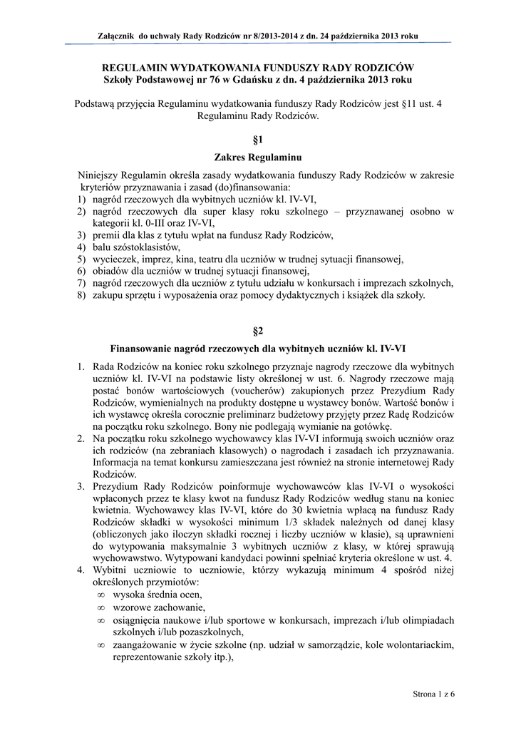 Załącznik do uchwały Rady Rodziców nr 8/2013-2014 z dn. 24 października 2013 roku REGULAMIN WYDATKOWANIA FUNDUSZY RADY RODZICÓW Szkoły Podstawowej nr 76 w Gdańsku z dn. 4 października 2013 roku Podstawą przyjęcia Regulaminu wydatkowania funduszy Rady Rodziców jest §11 ust. 4 Regulaminu Rady Rodziców. §1 Zakres Regulaminu Niniejszy Regulamin określa zasady wydatkowania funduszy Rady Rodziców w zakresie kryteriów przyznawania i zasad (do)finansowania: 1) nagród rzeczowych dla wybitnych uczniów kl. IV-VI, 2) nagród rzeczowych dla super klasy roku szkolnego – przyznawanej osobno w kategorii kl. 0-III oraz IV-VI, 3) premii dla klas z tytułu wpłat na fundusz Rady Rodziców, 4) balu szóstoklasistów, 5) wycieczek, imprez, kina, teatru dla uczniów w trudnej sytuacji finansowej, 6) obiadów dla uczniów w trudnej sytuacji finansowej, 7) nagród rzeczowych dla uczniów z tytułu udziału w konkursach i imprezach szkolnych, 8) zakupu sprzętu i wyposażenia oraz pomocy dydaktycznych i książek dla szkoły. §2 Finansowanie nagród rzeczowych dla wybitnych uczniów kl. IV-VI 1. Rada Rodziców na koniec roku szkolnego przyznaje nagrody rzeczowe dla wybitnych uczniów kl. IV-VI na podstawie listy określonej w ust. 6. Nagrody rzeczowe mają postać bonów wartościowych (voucherów) zakupionych przez Prezydium Rady Rodziców, wymienialnych na produkty dostępne u wystawcy bonów. Wartość bonów i ich wystawcę określa corocznie preliminarz budżetowy przyjęty przez Radę Rodziców na początku roku szkolnego. Bony nie podlegają wymianie na gotówkę. 2. Na początku roku szkolnego wychowawcy klas IV-VI informują swoich uczniów oraz ich rodziców (na zebraniach klasowych) o nagrodach i zasadach ich przyznawania. Informacja na temat konkursu zamieszczana jest również na stronie internetowej Rady Rodziców. 3. Prezydium Rady Rodziców poinformuje wychowawców klas IV-VI o wysokości wpłaconych przez te klasy kwot na fundusz Rady Rodziców według stanu na koniec kwietnia. Wychowawcy klas IV-VI, które do 30 kwietnia wpłacą na fundusz Rady Rodziców składki w wysokości minimum 1/3 składek należnych od danej klasy (obliczonych jako iloczyn składki rocznej i liczby uczniów w klasie), są uprawnieni do wytypowania maksymalnie 3 wybitnych uczniów z klasy, w której sprawują wychowawstwo. Wytypowani kandydaci powinni spełniać kryteria określone w ust. 4. 4. Wybitni uczniowie to uczniowie, którzy wykazują minimum 4 spośród niżej określonych przymiotów: • wysoka średnia ocen, • wzorowe zachowanie, • osiągnięcia naukowe i/lub sportowe w konkursach, imprezach i/lub olimpiadach szkolnych i/lub pozaszkolnych, • zaangażowanie w życie szkolne (np. udział w samorządzie, kole wolontariackim, reprezentowanie szkoły itp.), Strona 1 z 6 Załącznik do uchwały Rady Rodziców nr 8/2013-2014 z dn. 24 października 2013 roku • aktywność wykazywana poza szkołą (np. harcerstwo, wolontariat), • ponadprzeciętna postawa koleżeńska. 5. Kandydatury uczniów wyłonionych zgodnie z zasadami określonymi w ust. 3 (wraz z uzasadnieniem) zostaną zaprezentowane przez wychowawców pozostałym nauczycielom na najbliższej radzie pedagogicznej i poddane głosowaniu. Formę i tryb głosowania (jawny lub tajny) pozostawia się decyzji rady pedagogicznej. 6. W terminie do 10 czerwca grono pedagogiczne (poprzez dyrekcję szkoły) przekaże Prezydium Rady Rodziców listę maksymalnie 10 uczniów (z wyszczególnieniem klasy, imienia i nazwiska ucznia), którzy otrzymali największą liczbę głosów w toku głosowania opisanego w ust. 5. 7. Wręczenie nagród rzeczowych wraz z imiennymi dyplomami nastąpi podczas uroczystości zakończenia roku szkolnego. §3 Finansowanie nagród rzeczowych dla super klasy roku szkolnego 1. Rada Rodziców na koniec roku szkolnego funduje nagrody rzeczowe dla najlepszej klasy roku szkolnego – przyznawane w kategorii kl. IV-VI. Nagrody rzeczowe mają postać voucherów zakupionych przez Prezydium Rady Rodziców, wymienialnych na bilety do kina dla uczniów i ich wychowawcy. Vouchery nie podlegają wymianie na gotówkę. Liczba przyznanych voucherów uzależniona jest od liczebności zwycięskich klas. 2. Na początku roku szkolnego wychowawcy klas informują swoich uczniów oraz ich rodziców (na zebraniach klasowych) o nagrodach i zasadach ich przyznawania. Informacja na temat konkursu zamieszczana jest również na stronie internetowej Rady Rodziców. 3. Kryterium formalnym przyznania nagrody określonej w ust. 1 jest wpłata na fundusz Rady Rodziców do końca kwietnia kwoty w wysokości minimum 10 % składek należnych od danej klasy (obliczonych jako iloczyn składki rocznej i liczby uczniów w klasie). Prezydium Rady Rodziców poinformuje wychowawców klas o wysokości wpłaconych przez te klasy kwot na fundusz Rady Rodziców według stanu na koniec kwietnia. 4. Poza nagrodami określonymi w ust. 1 Rada Rodziców może ufundować puchar dla całej klasy. Jego przyznanie nie jest uzależnione od wysokości wpłat na fundusz Rady Rodziców i pozostawia się decyzji Rady Rodziców. 5. Tryb wyboru najlepszej klasy, z zachowaniem zasad określonych w ust. 3-4, pozostawia się radzie pedagogicznej. 6. W terminie do 10 czerwca grono pedagogiczne (poprzez dyrekcję szkoły) przekaże Prezydium Rady Rodziców listę zawierającą dane najlepszej klasy w kategorii klas IV-VI wraz z podaniem ich aktualnej liczebności. 7. Wręczenie nagród rzeczowych nastąpi podczas uroczystości zakończenia roku szkolnego. §4 Zwrot premii z tytułu wpłat na fundusz Rady Rodziców 1. Z tytułu wpłat składek na fundusz Rady Rodziców przyznaje się premię dla klas w postaci zwrotu 15 % kwot wpłaconych przez poszczególne klasy według stanu na koniec maja. Kryterium uprawniającym do wypłaty powyższej premii na rzecz klasy jest wpłata minimalna w wysokości 20 zł/ucznia. Prezydium Rady Rodziców Strona 2 z 6 Załącznik do uchwały Rady Ro