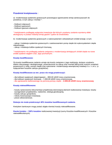 Przedmiot kredytowania : a) modernizacja systemów grzewczych powodująca ograniczenie emisji zanieczyszczeń do powietrza, w tym zakup i montaż *: - Kotłowni olejowych - Kotłowni gazowych - Kotłowni gazowo-olejowych * kredytowaniu podlegają wyłącznie inwestycje dla których uzyskany zostanie wymierny efekt ekologiczny w postaci redukcji emisji gazów i pyłów do środowiska b) modernizacja systemów grzewczych z wykorzystaniem odnawialnych źródeł energii, w tym: - zakup i instalacja systemów grzewczych z zastosowaniem pomp ciepła lub wykorzystaniem ciepła odpadowego, - zakup i instalacja kotłów opalanych biomasą, * kredytowaniu nie podlegają zadania związane z modernizacją istniejących źródeł ciepła na nowe źródła opalane węglem oraz jego pochodnymi. Koszty kwalifikowane: Za koszty kwalifikowane zadania uznaje się koszty związane z jego realizacją, służące uzyskaniu efektu rzeczowego i ekologicznego, przeznaczone na zakup oraz montaż fabrycznie nowych urządzeń grzewczych tj. kotły, pompy ciepła oraz wykonanie i modernizację wewnętrznej instalacji c.o. i c.w.u. (z wyłączeniem kosztów zakupu grzejników). Koszty kwalifikowane za ww. prace nie mogą przekroczyć: - dla kotłowni opalanych olejem/gazem – 800,00 zł/kW mocy znamionowej, - dla kotłowni opalanych biomasą – 1.000,00 zł/kW mocy znamionowej, - dla ogrzewania realizowanego za pomocą pompy ciepła – 2.000,00 zł/kW mocy znamionowej. Koszty niekwalifikowane: - koszty opracowania dokumentacji projektowej stanowiącej element realizowanej inwestycji, koszty wynagrodzeń projektantów, nadzorów, obsługi geodezyjnej, - koszty zakupu grzejników, - roboty towarzyszące inwestycji, - prace odtworzeniowe. Dotacja nie może przekroczyć 40% kosztów kwalifikowanych zadania. Kredytem bankowym mogą zostać objęte również koszty niekwalifikowane. Kwota kredytu : 100% kosztów realizowanej inwestycji (sumy Kosztów kwalifikowanych i Kosztów niekwalifikowanych)