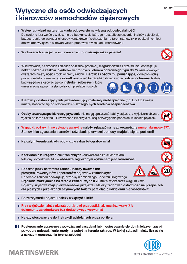Wytyczne dla osób odwiedzających i kierowców samochodów ciężarowych ■ ■ ■ ■ ■ ■ ■ ■ ■ ■ ■ ■ ! polski Wstęp lub wjazd na teren zakładu odbywa się na własną odpowiedzialność! Dozwolone jest wejście wyłącznie do budynku, do którego nastąpiło zgłoszenie. Należy zgłosić się bezpośrednio do wskazanej osoby kontaktowej. Wchodzenie na teren stanowisk produkcyjnych jest dozwolone wyłącznie w towarzystwie pracowników zakładu Martinswerk! W obszarach specjalnie oznakowanych obowiązuje zakaz palenia! W budynkach, na drogach i placach obszarów produkcji, magazynowania i przeładunku obowiązuje nakaz noszenia kasków, okularów ochronnych i obuwia ochronnego typu S3. W oznakowanych obszarach należy nosić środki ochrony słuchu. Kierowca i osoby mu pomagające, które prowadzą prace przeładunkowe, muszą dodatkowo nosić kamizelki ostrzegawcze i odzież ochronną. Należy bezwzględnie stosować się do instrukcji roboczych, które umieszczone są np. na stanowiskach przeładunkowych. Kierowcy dostarczający lub przeładowujący materiały niebezpieczne (np. ługi lub kwasy) muszą stosować się do odpowiednich szczególnych środków bezpieczeństwa. Osoby towarzyszące kierowcy prywatnie nie mogą opuszczać kabiny pojazdu, z wyjątkiem obszaru wjazdu na teren zakładu. Przewożone zwierzęta muszą bezwzględnie pozostać w kabinie pojazdu. Wypadki, pożary i inne sytuacje awaryjne należy zgłaszać na nasz wewnętrzny numer alarmowy 777. Stanowisko zgłaszania alarmów i udzielania pierwszej pomocy znajduje się na portierni! Na całym terenie zakładu obowiązuje zakaz fotografowania! Korzystanie z urządzeń elektronicznych (odtwarzacze ze słuchawkami, telefony komórkowe itd.) w obszarze zagrożonym wybuchem jest zabronione! Podczas jazdy na terenie zakładu należy uważać na: pieszych, rowerzystów i operatorów pojazdów zakładowych! Na terenie zakładu obowiązują przepisy niemieckiego Kodeksu Drogowego. Prędkość maksymalna na terenie zakładu wynosi 20 km/h, w obszarze wagi 10 km/h. Pojazdy szynowe mają pierwszeństwo przejazdu. Należy zachować ostrożność na przejściach dla pieszych i przejazdach szynowych! Należy pamiętać o udzieleniu pierwszeństwa! Po zatrzymaniu pojazdu należy wyłączyć silnik! Przy wyjeździe należy okazać portierowi przepustki, jak również wszystkie dokumenty załadunkowe bez dodatkowego wezwania! Należy stosować się do instrukcji udzielanych przez portiera! Postępowanie sprzeczne z powyższymi zasadami lub niestosowanie się do niniejszych zasad powoduje unieważnienie zgody na pobyt na terenie zakładu. W takiej sytuacji należy liczyć się z nakazem opuszczenia terenu zakładu! martinswerk martinswerk