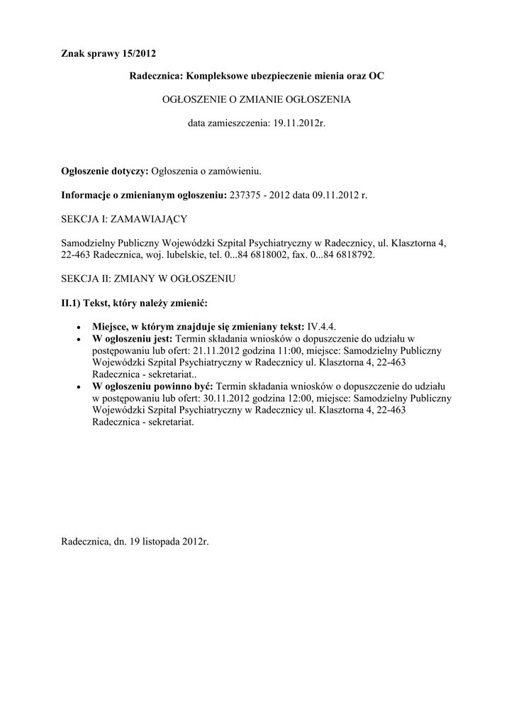 Znak sprawy 15/2012 Radecznica: Kompleksowe ubezpieczenie mienia oraz OC OGŁOSZENIE O ZMIANIE OGŁOSZENIA data zamieszczenia: 19.11.2012r. Ogłoszenie dotyczy: Ogłoszenia o zamówieniu. Informacje o zmienianym ogłoszeniu: 237375 - 2012 data 09.11.2012 r. SEKCJA I: ZAMAWIAJĄCY Samodzielny Publiczny Wojewódzki Szpital Psychiatryczny w Radecznicy, ul. Klasztorna 4, 22-463 Radecznica, woj. lubelskie, tel. 0...84 6818002, fax. 0...84 6818792. SEKCJA II: ZMIANY W OGŁOSZENIU II.1) Tekst, który należy zmienić: • • • Miejsce, w którym znajduje się zmieniany tekst: IV.4.4. W ogłoszeniu jest: Termin składania wniosków o dopuszczenie do udziału w postępowaniu lub ofert: 21.11.2012 godzina 11:00, miejsce: Samodzielny Publiczny Wojewódzki Szpital Psychiatryczny w Radecznicy ul. Klasztorna 4, 22-463 Radecznica - sekretariat.. W ogłoszeniu powinno być: Termin składania wniosków o dopuszczenie do udziału w postępowaniu lub ofert: 30.11.2012 godzina 12:00, miejsce: Samodzielny Publiczny Wojewódzki Szpital Psychiatryczny w Radecznicy ul. Klasztorna 4, 22-463 Radecznica - sekretariat. Radecznica, dn. 19 listopada 2012r.