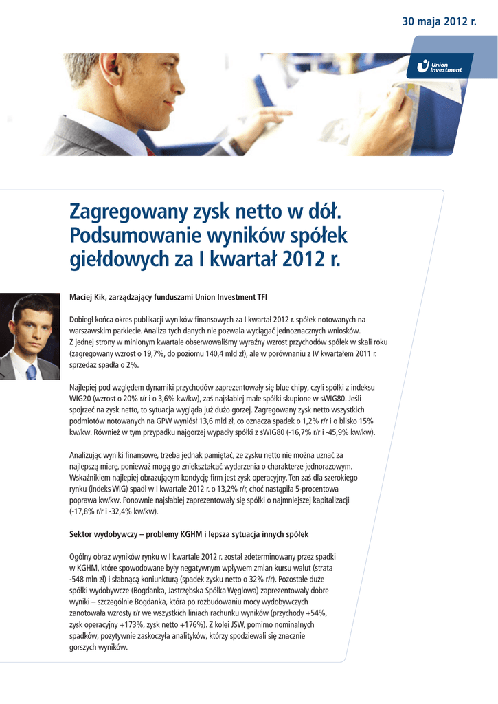 30 maja 2012 r. Zagregowany zysk netto w dół. Podsumowanie wyników spółek giełdowych za I kwartał 2012 r. Maciej Kik, zarządzający funduszami Union Investment TFI Dobiegł końca okres publikacji wyników finansowych za I kwartał 2012 r. spółek notowanych na warszawskim parkiecie. Analiza tych danych nie pozwala wyciągać jednoznacznych wniosków. Z jednej strony w minionym kwartale obserwowaliśmy wyraźny wzrost przychodów spółek w skali roku (zagregowany wzrost o 19,7%, do poziomu 140,4 mld zł), ale w porównaniu z IV kwartałem 2011 r. sprzedaż spadła o 2%. Najlepiej pod względem dynamiki przychodów zaprezentowały się blue chipy, czyli spółki z indeksu WIG20 (wzrost o 20% r/r i o 3,6% kw/kw), zaś najsłabiej małe spółki skupione w sWIG80. Jeśli spojrzeć na zysk netto, to sytuacja wygląda już dużo gorzej. Zagregowany zysk netto wszystkich podmiotów notowanych na GPW wyniósł 13,6 mld zł, co oznacza spadek o 1,2% r/r i o blisko 15% kw/kw. Również w tym przypadku najgorzej wypadły spółki z sWIG80 (-16,7% r/r i -45,9% kw/kw). Analizując wyniki finansowe, trzeba jednak pamiętać, że zysku netto nie można uznać za najlepszą miarę, ponieważ mogą go zniekształcać wydarzenia o charakterze jednorazowym. Wskaźnikiem najlepiej obrazującym kondycję firm jest zysk operacyjny. Ten zaś dla szerokiego rynku (indeks WIG) spadł w I kwartale 2012 r. o 13,2% r/r, choć nastąpiła 5-procentowa poprawa kw/kw. Ponownie najsłabiej zaprezentowały się spółki o najmniejszej kapitalizacji (-17,8% r/r i -32,4% kw/kw). Sektor wydobywczy – problemy KGHM i lepsza sytuacja innych spółek Ogólny obraz wyników rynku w I kwartale 2012 r. został zdeterminowany przez spadki w KGHM, które spowodowane były negatywnym wpływem zmian kursu walut (strata -548 mln zł) i słabnącą koniunkturą (spadek zysku netto o 32% r/r). Pozostałe duże spółki wydobywcze (Bogdanka, Jastrzębska Spółka Węglowa) zaprezentowały dobre wyniki – szczególnie Bogdanka, która po rozbudowaniu mocy wydobywczych zanotowała wzrosty r/r we wszystkich liniach rachunku wyników (przychody +54%, zysk operacyjny +173%, zysk netto +176%). Z kolei JSW, pomimo nominalnych spadków, pozytywnie zaskoczyła analityków, którzy spodziewali się znacznie gorszych wyników. 30 maja 2012 r. Sektor bankowy – kolejny dobry kwartał Bardzo solidne wyniki pokazały spółki z sektora finansowego, a trzeba pamiętać, że jest to sektor najsilniej reprezentowany na polskiej giełdzie. Największe banki miały wyniki zgodne z oczekiwaniami: PKO BP odnotował 1 mld zł zysku netto (wzrost o 15,4% r/r), Pekao SA 710 mln zł zysku netto (wzrost o 9,6% r/r). Pozytywnie zaskakiwały mniejsze banki, m.in. ING, BRE czy Bank Handlowy. Poprawie uległ głównie wynik odsetkowy i wynik z działalności finansowej. Ogółem wynik netto sektora bankowego wzrósł w I kwartale 2012 r. o 18%, do ponad 3,56 mld zł. Spółki budowlane – nadal słabe wyniki Sektor budowlany po raz kolejny bardzo rozczarował inwestorów. Pomimo wzrostu przychodów cały sektor wypracował ujemny wynik netto, a zyski operacyjne skurczyły się o 67%. Spółki budowlane mają ponadto bardzo złą sytuację płynnościową. Negatywnie wyróżnia się spółka PBG, która ma ogromne problemy finansowe, a w I kwartale 2012 r. odnotowała 60 mln złotych straty netto. Sektor handlowy – zyski na fali wzrostu konsumpcji Na drugim biegunie znalazły się spółki handlowe, którym sprzyjała bardzo dynamicznie rosnąca konsumpcja i co za tym idzie – sprzedaż detaliczna. LPP i NG2 znacząco zwiększyły sprzedaż, przede wszystkim dzięki rozwojowi sieci (również za granicą) i większej efektywności już istniejących sklepów (przychody spółek wzrosły odpowiednio o 31,5% i 38,8%). Bardzo dobre wyniki zaprezentował także Eurocash, wicelider dystrybucji artykułów spożywczych (poza wzrostem organicznym ujawniły się pozytywne efekty niedawnego przejęcia spółki Tradis). Sektor przemysłowy – udany kwartał dla spółek chemicznych Wśród spółek przemysłowych na wyróżnienie zasługują firmy chemiczne. Ich przychody wzrosły o 36%, a zyski o 33%. Wyniki te okazały się znacznie lepsze od oczekiwań analityków. Z tego grona jedynie Police nie były w stanie poprawić ubiegłorocznego zysku. Sytuację na spółkach chemicznych dodatkowo podgrzewa duże zainteresowanie potencjalnymi przejęciami inwestorów branżowych. Wśród pozostałych spółek przemysłowych wciąż dobrze prezentują się wyniki firm produkujących głównie na eksport, takich jak Amica, Apator, Stomil Sanok czy Dębica. Rozczarowały natomiast spółki powiązane z sektorem budowlanym, takie jak Rovese (Cersanit) czy Barlinek. 30 maja 2012 r. W sektorze utilities warto zwrócić uwagę na spółkę PGNiG, która ma za sobą gorszy kwartał. Ze względu na opóźnienia we wprowadzeniu podwyżki cen gazu strata PGNiG w segmencie obrotu wyniosła aż 778 mln zł, a zyski spółki w ujęciu rocznym spadły o ponad 70%. Perspektywy spółek z warszawskiego parkietu na przyszłe kwartały nie wyglądają obiecująco. Biorąc pod uwagę pogarszające się wskaźniki makroekonomiczne polskiej gospodarki (produkcja przemysłowa, sprzedaż detaliczna, wskaźniki wyprzedzające) i problemy ekonomiczne naszych największych partnerów handlowych w strefie euro, można przewidywać, że poprawa wyników w kolejnych kwartałach będzie trudna. Masz pytania? ☎ @ 800 567 662 (22) 449 03 40 (od poniedziałku do piątku, od 8.00 do 18.00). tfi@union-investment.pl