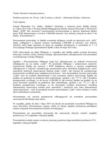 Temat: Zawarcie znaczącej umowy Podstawa prawna: art. 56 ust. 1 pkt 2 ustawy o ofercie – informacje bieżące i okresowe Treść raportu: Zarząd Miraculum S.A. (dalej: „Spółka”) informuje o zawarciu przez Spółkę dzisiaj, tj. 2 lipca 2015 roku z Wyższą Szkołą Pedagogiczną imienia Janusza Korczaka w Warszawie (dalej: „WSP” lub „Inwestor”) porozumienia inwestycyjnego w sprawie udzielenia Spółce przez WSP finansowania w kwocie 3.000.000 (słownie: trzy miliony) złotych na okres 5 lat (dalej: „Porozumienie”). Porozumienie przewiduje, że Spółka wyemituje obligacje zwykłe na okaziciela serii „AD2” (dalej „Obligacje”) o łącznej wartości nominalnej 3.000.000 zł (słownie: trzy miliony złotych), które będą zamienne na akcje na zasadach określonych w uchwałach nr 5 i 6 Zwyczajnego Walnego Zgromadzenia Spółki z dnia 26 maja 2015 roku. WSP zobowiązało się objąć Obligacje w wypadku, gdy Spółka spełni wymogi Inwestora dotyczące wartości emisji, terminu wykupu, oprocentowania, zabezpieczenia oraz przesłanek wcześniejszego wykupu Obligacji. Zgodnie z Porozumieniem Obligacje mają być zabezpieczone na znakach towarowych składających się na markę „Lider”. Po przydziale Obligacji i ustanowieniu zastawów rejestrowych Spółka ma zawrzeć z WSP dodatkową umowę w sprawie uzupełnienia zabezpieczeń w zakresie warunkowego przeniesienia praw autorskich majątkowych i praw autorskich zależnych stanowiących element marki „Lider”, jak również do warunkowego przeniesienia wszelkich praw majątkowych do know – how do produkcji towarów pod marką „Lider” oraz do wydania dokumentacji z tym związanej. Oprócz powyższego Spółka ma poddać się egzekucji na podstawie aktu notarialnego, zgodnie z art. 777 § 1 pkt 5 Kodeksu postępowania cywilnego, co do kwoty 4.500.000 zł, jak również Spółka ma poddać się na rzecz Inwestora egzekucji na podstawie aktu notarialnego, zgodnie z art. 777 § 1 pkt 4 Kodeksu postępowania cywilnego, co do obowiązku wydania Inwestorowi wszelkiej dokumentacji stanowiącej nośniki praw autorskich i zależnych oraz innej dokumentacji stanowiącej know – how do produkcji towarów pod markami „Lider”, które zostaną w tymże akcie notarialnym wymienione. Porozumienie nie zawiera postanowień odbiegających od warunków powszechnie stosowanych dla danego typu umów. W wypadku, gdyby do dnia 7 lipca 2015 nie doszło do przydziału wszystkich Obligacji na rzecz Inwestora, Porozumienie wygasa, chyba że Strony zgodnie postanowią przedłużyć termin związania Porozumieniem (termin rozwiązujący). Porozumienie nie przewiduje stosowania kar umownych, których wartość mogłaby przekroczyć 10 % kapitałów własnych Spółki. Porozumienie zostało uznane za umowę znaczącą, ponieważ jego przedmiot przekracza 10 % kapitałów własnych Spółki.