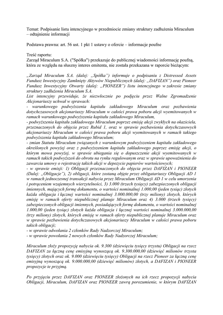 Temat: Podpisanie listu intencyjnego w przedmiocie zmiany struktury zadłużenia Miraculum