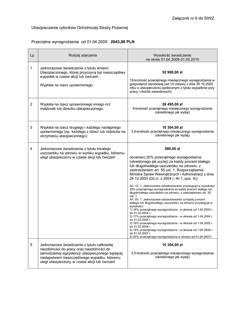 Załącznik nr 6 do SIWZ Ubezpieczenie członków Ochotniczej Straży Pożarnej Przeciętne wynagrodzenie od 01.04.2009 2943,88 PLN Lp. 1 Rodzaj zdarzenia Wysokość świadczenie na okres 01.04.2009-31.03.2010 Jednorazowe świadczenie z tytułu śmierci Ubezpieczonego, której przyczyną był nieszczęśliwy wypadek w czasie akcji lub ćwiczeń. 52 990,00 zł Wypłata na rzecz uprawnionego. 2 3 4 Wypłata na rzecz uprawnionego innego ni ż małżonek lub dziecko ubezpieczonego. Wypłata na rzecz drugiego i każdego następnego uprawnionego (np. każdego z dzieci lub rodziców na utrzymaniu ubezpieczonego) Jednorazowe świadczenie z tytułu trwałego uszczerbku na zdrowiu w wyniku wypadku, któremu uległ ubezpieczony w czasie akcji lub ćwiczeń 18-krotność przeciętnego miesięcznego wynagrodzenia w gospodarce narodowej (art.14 Ustawy z dnia 30.10.2002 roku o ubezpieczeniu społecznym z tytułu wypadków przy pracy i chorób zawodowych). 26 495,00 zł 9-krotność przeciętnego miesięcznego wynagrodzenia (określonego jak wyżej) 10 304,00 zł 3,5-krotność przeciętnego miesięcznego wynagrodzenia (określonego jak wyżej) 589,00 zł docelowo 20% przeciętnego wynagrodzenia (określonego jak wyżej) za każdy procent stałego lub długotrwałego uszczerbku na zdrowiu, z zastrzeżeniem art. 55 ust. 1. Rozporządzenia Ministra Spraw Wewnętrznych i Administracji z dnia 24.12.2003 (Dz.U. z 2004 r. Nr 1, poz. 6)) Art. 12. 1. Jednorazowe odszkodowanie przysługuje w wysokości 20% przeciętnego wynagrodzenia za każdy procent stałego lub długotrwałego uszczerbku na zdrowiu, z zastrzeżeniem art. 55 ust. 1. Art. 55. 1. Jednorazowe odszkodowanie za każdy procent stałego lub długotrwałego uszczerbku na zdrowiu przysługuje w wysokości: 1) 16% przeciętnego wynagrodzenia - w okresie od 1.04.2003 r. do 31.03.2004 r.; 2) 17% przeciętnego wynagrodzenia - w okresie od 1.04.2004 r. do 31.03.2005 r. 3) 18% przeciętnego wynagrodzenia - w okresie od 1.04.2005 r. do 31.03.2006 r. 4) 19% przeciętnego wynagrodzenia - w okresie od 1.04.2006 r. do 31.03.2007 r. 5) 20% przeciętnego wynagrodzenia w okresie od 01.04.2007r. 5 Jednorazowe świadczenie z tytułu całkowitej niezdolności do pracy oraz niezdolności do samodzielnej egzystencji ubezpieczonego będącej następstwem nieszczęśliwego wypadku, któremu uległ ubezpieczony w czasie akcji lub ćwiczeń 10 304,00 zł 3,5-krotność przeciętnego miesięcznego wynagrodzenia (określonego jak wyżej)