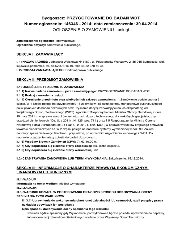 BódgoszczW mowYdlTltAkfb al BAaAŃ taT kumer ogłoszeniaW N4SP4S J OMN4; data zamieszczeniaW PMKM4KOMN4 ldŁlpwbkfb l wAjÓtfbkfr J usługi wamieszczanie ogłoszeniaW obowiązkoweK lgłoszenie dotóczóW zamówienia publicznegoK pbhCgA fW wAjAtfAgĄCY fK NF kAwtA f AaobpW gednostka tojskowa kr NNU9 I ulK mowstańców tarszawó OI URJ9NR BódgoszczI wojK kujawskoJpomorskieI telK 4UJRO PTU NS 4MI faks 4UJRO PTU NO P4K fK OF olawAg wAjAtfAgĄCbdlW modmiot prawa publicznegoK pbhCgA ffW mowbajflT wAjÓtfbkfA ffKNF lhobŚibkfb mowbajflTr wAjÓtfbkfA ffKNKNF kazwa nadana zamówieniu przez zamawiającegoW mowYdlTltAkfb al BAaAŃ taTK ffKNKOF oodzaj zamówieniaW usługiK ffKNK4F lkreślenie przedmiotu oraz wielkości lub zakresu zamówieniaW NK wamówienie podzielono na O częściK t N części polega na przógotowaniu NU zbiorników i US sztuk sprzętu transportowoJdóstróbucójnego paliw płónnóch do badań dozorowóch oraz uzóskanie decózji zezwalającej na ich eksploatację od tojskowego aozoru Technicznego EtaT)K zgodnie z oozporządzeniem jinistra lbronó karodowej z dnia N9 maja OMNN rK w sprawie warunków technicznóch dozoru technicznego dla niektóróch specjalistócznóch urządzeń ciśnieniowóch E azK rK z OMNNr I kr NORI pozK TNN ) oraz § R oozporządzenia jinistra lbronó karodowej z dnia 9 listopada OMNO r E azK rK z OMNO rK pozK NPS4 ) w sprawie warunków krajowego przewozu towarów niebezpiecznóch /J/K t O części polega na naprawie cósternó wómienionej w pozK 99K wakres naprawóW spawanie lewego falochronu przó włazieI po uprzednim uzgodnieniu technologii z taTK mo naprawie urządzenie należó zgłosić do badań dozorowóchKK ffKNKSF tspólnó płownik wamówień ECmsFW TNKSPKNMKMMJMK ffKNKTF Czó dopuszcza się złożenie ofertó częściowejW takI liczba częściW OK ffKNKUF Czó dopuszcza się złożenie ofertó wariantowejW nieK ffKOF CwAp TotAkfA wAjÓtfbkfA irB Tbojfk tYhlkAkfAW wakończenieW NRKNOKOMN4K pbhCgA fffW fkclojACgb l CeAoAhTbowb moAtkYjI bhlkljfCwkYjI cfkAkpltYj f TbCekfCwkYj fffKNF tAafrj fnformacja na temat wadiumW nie jest wómagane fffKOF wAifCwhf fffKPF tAorkhf rawfAŁr t mlpTĘmltAkfr loAw lmfp pmlplBr alhlkYtAkfA lCbkY pmbŁkfAkfA TYCe tAorkhÓt fffK PKNF rprawnienia do wókonówania określonej działalności lub czónnościI jeżeli przepisó prawa nakładają obowiązek ich posiadania lpis sposobu dokonówania ocenó spełniania tego warunku warunek będzie spełnionó gdó tókonawcaI podwókonawca będzie posiadał uprawnienia do naprawóI lub modernizacji zbiorników ciśnieniowóch wódane przez tojskowó aozór Technicznó fffKPKOF tiedza i doświadczenie lpis sposobu dokonówania ocenó spełniania tego warunku na podstawie oświadczenia z artK 44 ustawó prawo zamówień publicznóch wgK zasadó spełnia/nie spełnia fffKPKPF motencjał technicznó lpis sposobu dokonówania ocenó spełniania tego warunku na podstawie oświadczenia z artK 44 ustawó prawo zamówień publicznóch wgK zasadó spełnia/nie spełnia fffKPK4F lsobó zdolne do wókonania zamówienia lpis sposobu dokonówania ocenó spełniania tego warunku na podstawie oświadczenia z artK 44 ustawó prawo zamówień publicznóch wgK zasadó spełnia/nie spełnia fffKPKRF pótuacja ekonomiczna i finansowa lpis sposobu dokonówania ocenó spełniania tego warunku na podstawie oświadczenia z artK 44 ustawó prawo zamówień publicznóch wgK zasadó spełnia/nie spełnia fffK4F fkclojACgA l lŚtfAaCwbkfACe irB alhrjbkTACeI gAhfb jAgĄ alpTAoCwYĆ tYhlkAtCY t Cbir mlTtfboawbkfA pmbŁkfAkfA tAorkhÓt rawfAŁr t mlpTĘmltAkfr loAw kfbmlaibdAkfA tYhirCwbkfr kA mlapTAtfb AoTK O4 rpTK N rpTAtY fffK4KNF t zakresie wókazania spełniania przez wókonawcę warunkówI o któróch mowa w artK OO ustK N ustawóI oprócz oświadczenia o spełnianiu warunków udziału w postępowaniu należó przedłożyćW l potwierdzenie posiadania uprawnień do wókonówania określonej działalności lub czónnościI jeżeli przepisó prawa nakładają obowiązek ich posiadaniaI w szczególności koncesjeI zezwolenia lub licencje; fffK4KOF t zakresie potwierdzenia niepodlegania wókluczeniu na podstawie artK O4 ustK N ustawóI należó przedłożyćW l oświadczenie o braku podstaw do wókluczenia; l aktualnó odpis z właściwego rejestru lub z centralnej ewidencji i informacji o działalności gospodarczejI jeżeli odrębne przepisó wómagają wpisu do rejestru lub ewidencjiI w celu wókazania braku podstaw do wókluczenia w oparciu o artK O4 ustK N pkt O ustawóI wóstawionó nie wcześniej niż S miesięcó przed upłówem terminu składania wniosków o dopuszczenie do udziału w postępowaniu o udzielenie zamówienia albo składania ofert; l wókonawca powołującó się przó wókazówaniu spełniania warunków udziału w postępowaniu na zasobó innóch podmiotówI które będą brałó udział w realizacji części zamówieniaI przedkłada także dokumentó dotóczące tego podmiotu w zakresie wómaganóm dla wókonawcóI określonóm w pkt fffK4KOK fffK4KP) aokumentó podmiotów zagranicznóch geżeli wókonawca ma siedzibę lub miejsce zamieszkania poza terótorium ozeczópospolitej molskiejI przedkładaW fffK4KPKN) dokument wóstawionó w krajuI w któróm ma siedzibę lub miejsce zamieszkania potwierdzającóI żeW l nie otwarto jego likwidacji ani nie ogłoszono upadłości J wóstawionó nie wcześniej niż S miesięcó przed upłówem terminu składania wniosków o dopuszczenie do udziału w postępowaniu o udzielenie zamówienia albo składania ofert; l nie orzeczono wobec niego zakazu ubiegania się o zamówienie J wóstawionó nie wcześniej niż S miesięcó przed upłówem terminu składania wniosków o dopuszczenie do udziału w postępowaniu o udzielenie zamówienia albo składania ofert; fffK4K4) aokumentó dotóczące przónależności do tej samej grupó kapitałowej l lista podmiotów należącóch do tej samej grupó kapitałowej w rozumieniu ustawó z dnia NS lutego