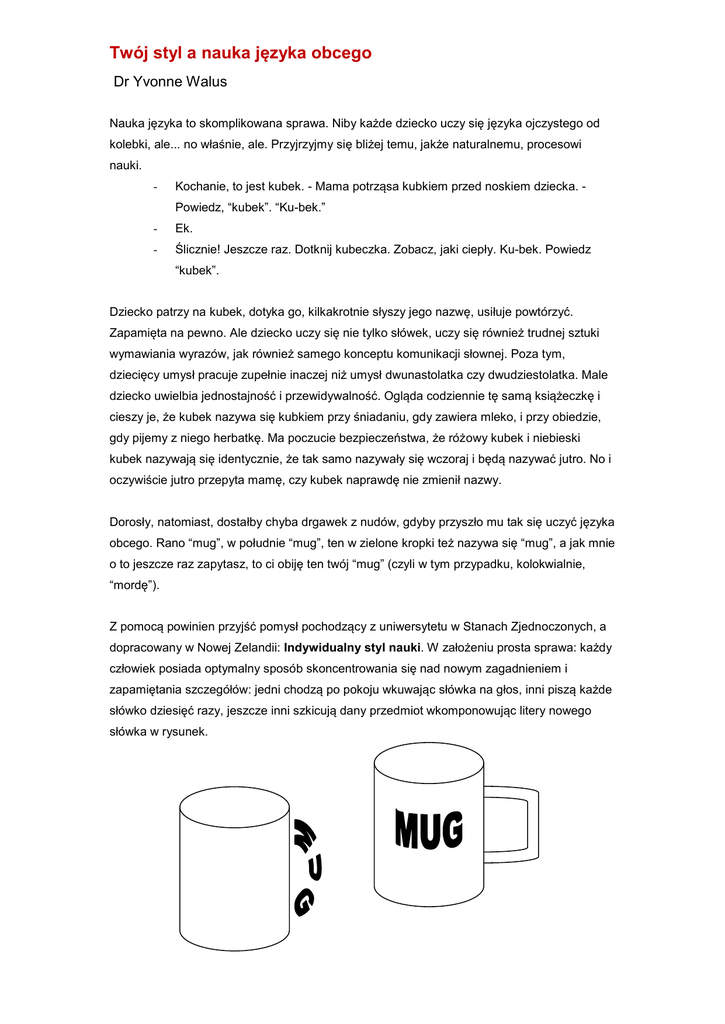 Twój styl a nauka języka obcego Dr Yvonne Walus Nauka języka to skomplikowana sprawa. Niby każde dziecko uczy się języka ojczystego od kolebki, ale... no właśnie, ale. Przyjrzyjmy się bliżej temu, jakże naturalnemu, procesowi nauki. - Kochanie, to jest kubek. - Mama potrząsa kubkiem przed noskiem dziecka. Powiedz, “kubek”. “Ku-bek.” - Ek. - Ślicznie! Jeszcze raz. Dotknij kubeczka. Zobacz, jaki ciepły. Ku-bek. Powiedz “kubek”. Dziecko patrzy na kubek, dotyka go, kilkakrotnie słyszy jego nazwę, usiłuje powtórzyć. Zapamięta na pewno. Ale dziecko uczy się nie tylko słówek, uczy się również trudnej sztuki wymawiania wyrazów, jak również samego konceptu komunikacji słownej. Poza tym, dziecięcy umysł pracuje zupełnie inaczej niż umysł dwunastolatka czy dwudziestolatka. Male dziecko uwielbia jednostajność i przewidywalność. Ogląda codziennie tę samą książeczkę i cieszy je, że kubek nazywa się kubkiem przy śniadaniu, gdy zawiera mleko, i przy obiedzie, gdy pijemy z niego herbatkę. Ma poczucie bezpieczeństwa, że różowy kubek i niebieski kubek nazywają się identycznie, że tak samo nazywały się wczoraj i będą nazywać jutro. No i oczywiście jutro przepyta mamę, czy kubek naprawdę nie zmienił nazwy. Dorosły, natomiast, dostałby chyba drgawek z nudów, gdyby przyszło mu tak się uczyć języka obcego. Rano “mug”, w południe “mug”, ten w zielone kropki też nazywa się “mug”, a jak mnie o to jeszcze raz zapytasz, to ci obiję ten twój “mug” (czyli w tym przypadku, kolokwialnie, “mordę”). Z pomocą powinien przyjść pomysł pochodzący z uniwersytetu w Stanach Zjednoczonych, a dopracowany w Nowej Zelandii: Indywidualny styl nauki. W założeniu prosta sprawa: każdy człowiek posiada optymalny sposób skoncentrowania się nad nowym zagadnieniem i zapamiętania szczegółów: jedni chodzą po pokoju wkuwając słówka na głos, inni piszą każde słówko dziesięć razy, jeszcze inni szkicują dany przedmiot wkomponowując litery nowego słówka w rysunek. Twój styl a nauka języka obcego Dr Yvonne Walus Ale to tylko początek. Twój styl nauki sięga głębiej. Ważna jest pora dnia (jesteś skowronkiem czy sową?), temperatura w pokoju, oświetlenie (nieprawdą jest, że jasna lampa pozwala się lepiej uczyć), warsztat pracy (jedni lubią uczyć się przy biurku, inni na podłodze). Sposób, w jaki najlepiej zrozumiesz gramatykę języka obcego, też zależy od Twojej osobowości i dominacji półkuli mózgowych. Niektórzy wolą uczyć się w krótkich i treściwych podpunktach, inni wolą wesołe anegdoty. Niektórzy chcą opanować jedno zagadnienie dogłębnie, innych taka metoda nuży - oni pragną najpierw poznać ogólnie wszystkie zasady obcej gramatyki zanim wnikną w szczegóły. No a co z komputerami? Co z konwersacją w języku obcym? To samo. Jeśli twój styl obejmuje naukę z użyciem komputera (lubisz uczyć się sam/a, w bezruchu, wzrokowo i dotykiem), kurs online może być dla Ciebie złotym środkiem. Jeśli perspektywa rozmowy z nieznajomym peszy Cię nawet po polsku, to kursy językowe oparte na konwersacji nie przyniosą Ci wiele pożytku. Japońska kultura przywiązuje wiele wagi do ocen szkolnych. Lekcja angielskiego w Japonii, nawet dla dorosłych, zawsze zaczyna się kartkówką - pisemnym sprawdzianem słówek i gramatyki. Ponieważ Japończycy to ciężko pracujący naród, prawie każdy uczeń uzyskuje stuprocentowy wynik. To pozwala im dobrze się poczuć i zachować twarz podczas drugiej części lekcji - właśnie konwersacji, do której już nie można przygotować się w domu, wkuwając na pamięć. Czy wiesz, jak wyglądałaby Twoja wymarzona lekcja języka obcego? Sprawdź z doradcą edukacyjnym Edu & You. A tak na pocieszenie, to właśnie język polski jest jednym z najtrudniejszych. Wracając do nauki języka jako dziecko, co jest trudniej wymówić: “książeczka” czy “book”? Zwłaszcza, że ta książeczka odmienia się przez siedem przypadków, a “book” wcale.