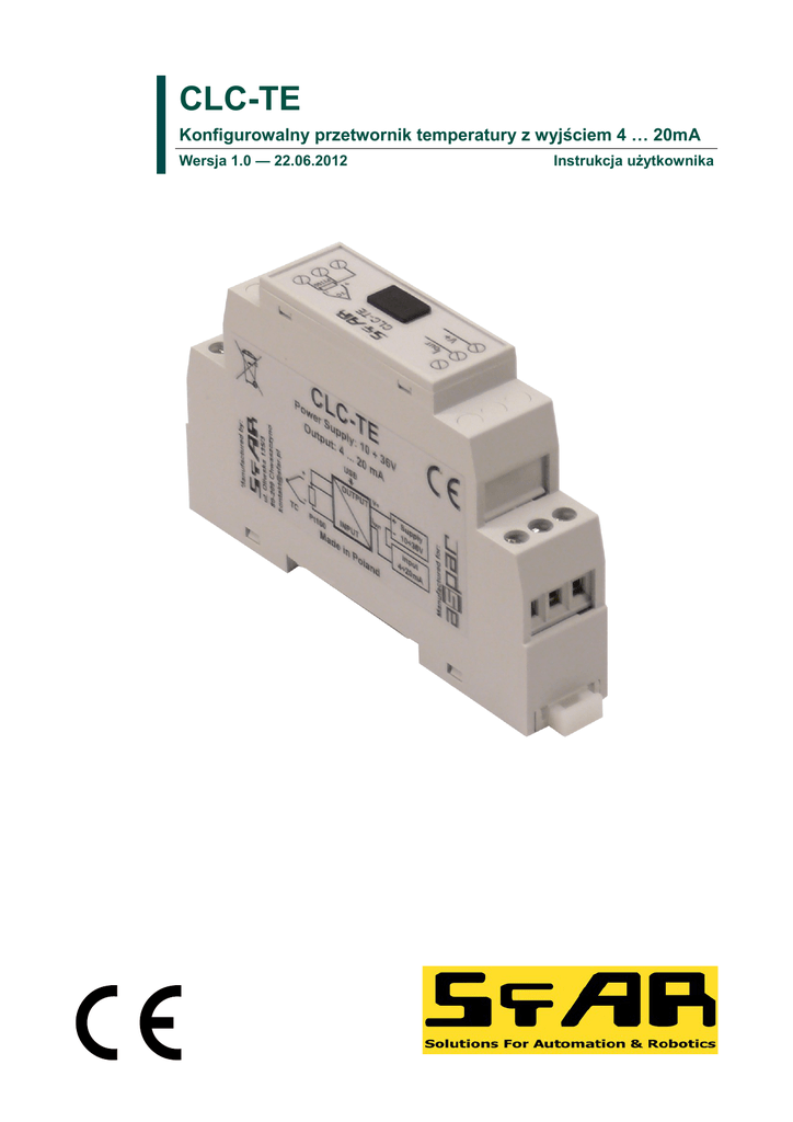 CLC-TE Konfigurowalny przetwornik temperatury z wyjściem 4 … 20mA Wersja 1.0 — 22.06.2012 Instrukcja użytkownika SFAR CLC-TE Instrukcja użytkownika Dziękujemy za wybór naszego produktu. Niniejsza instrukcja ułatwi Państwu prawidłową obsługę i poprawną eksploatację opisywanego urządzenia. Informacje zawarte w niniejszej instrukcji przygotowane zostały z najwyższą uwagą przez naszych specjalistów i służą jako opis produktu bez ponoszenia jakiejkolwiek odpowiedzialności w rozumieniu prawa handlowego. Informacje te nie zwalniają użytkownika z obowiązku poddania produktu własnej ocenie i sprawdzenia jego właściwości. Zastrzegamy sobie możliwość zmiany parametrów produktów bez powiadomienia. Prosimy o uważne przeczytanie instrukcji i stosowanie się do zawartych w niej zaleceń. UWAGA! Niedostosowanie się do instrukcji może spowodować uszkodzenie urządzenia albo utrudnić posługiwanie się sprzętem lub oprogramowaniem. Konfigurowalny przetwornik temperatury z wyjściem 4 … 20mA Instrukcja użytkownika © SFAR 2012. Wszelkie prawa zastrzeżone. Wersja 1.0 - 22.06.2012 2z8 SFAR CLC-TE Instrukcja użytkownika 1. Zasady bezpieczeństwa • Przed pierwszym uruchomieniem urządzenia należy zapoznać się z niniejszą instrukcją obsługi; • Przed pierwszym uruchomieniem urządzenia należy upewnić się, że wszystkie przewody zostały podłączone prawidłowo; • Należy zapewnić właściwe warunki pracy, zgodne ze specyfikacją urządzenia (np. : napięcie zasilania, temperatura, maksymalny pobór prądu); • Przed dokonaniem jakichkolwiek modyfikacji przyłączeń przewodów, należy wyłączyć napięcie zasilania. 2. Charakterystyka ogólna Przetworniki z serii CLC posiadają jedno wejście pomiarowe zlinearyzowane na podstawie znormalizowanych tablic charakterystyk przetwarzania. Pomiar po przetworzeniu według skali zadanej przez użytkownika przekazywany jest na pasywne wyjście prądowe 4-20mA w przypadku wersji bez izolacji galwanicznej lub aktywne w przypadku wersji z izolacją galwaniczną (wymagane dodatkowe zasilanie). Wśród obsługiwanych typów czujników wejściowych znajdują się: Pt100, Pt500, Pt1000, Ni100, KTY81-110, rezystancja od 0 do 8kΩ oraz termopary J, K, T, N, S, R, B Producent udostępnia następujące wersje przetworników: • CLC-TE – bez separacji galwanicznej (zasilany z pętli prądowej) • CLC-TE-G – z separacją galwaniczną (wymagane dodatkowe zasilanie) Konfiguracja typu czujnika, zakresu temperatur oraz prądów wyjściowych odbywa się przez użytkownika za pomocą dostarczonego oprogramowania komunikującego się z urządzeniem przez USB. Konfigurowalny przetwornik temperatury z wyjściem 4 … 20mA Instrukcja użytkownika © SFAR 2012. Wszelkie prawa zastrzeżone. Wersja 1.0 - 22.06.2012 3z8 SFAR CLC-TE Instrukcja użytkownika 3. Specyfikacja techniczna Napięcie zasilania 10 … 24 … 36V DC Prąd zasilania / wyjściowy (CLC-TE) 3 … 21mA Prąd zasilania (CLC-TE-G) 30 … 52mA Prąd wyjściowy (CLC-TE-G) 0 … 22mA Rezystancja obciążenia (max) (Napięcie zasilania – 10V) / 21mA [Ω] Liczba wejść 1 Typ wejścia Uniwersalne (termorezystancyjne termoparowe) Prąd pomiaru czujników termorezystancyjnych ~250μA Dokładność pomiaru (czujniki termorezystancyjne) (25°C) ± 0,2°C Dokładność pomiaru (czujniki termoparowe) (25°C) ± 2°C Czas reakcji 100ms Stabilność temperaturowa ± 0,01% zakresu przetwarzania / °C Temperatura pracy (czujniki termorezystancyjne) -20 °C - +50°C Temperatura pracy (czujniki termoparowe) 0 °C - +50°C Temperatura przechowywania -40 °C - +85°C Wilgotność względna 0 – 90% (bez kondensacji) Złącze zasilające / wyjściowe 3 pinowe Złącze pomiarowe 3 pinowe Złącze konfiguracyjne miniUSB Wymiary Wysokość 90 mm Głębokość 56 mm Szerokość 17 mm Stopień ochrony IP20 Kompatybilność elektromagnetyczna (EMC) wg norm PE-EN 55022:2011 PE-EN 55024:2011 PE-EN 61000-6-1:2004 PE-EN 61000-6-2:2004 PE-EN 61000-6-3:2004 PE-EN 61000-6-4:2004 Konfigurowalny przetwornik temperatury z wyjściem 4 … 20mA Instrukcja użytkownika i © SFAR 2012. Wszelkie prawa zastrzeżone. Wersja 1.0 - 22.06.2012 4z8 SFAR CLC-TE Instrukcja użytkownika 4. Wymiary modułu 17 50 56 34 Wygląd i wymiary modułu znajdują się na rysunku poniżej. Moduł mocowany jest bezpośrednio do szyny w przemysłowym standardzie DIN. 90 5. Podłączenie przetwornika 5.1. CLC-TE-G podłączenie czujnika termorezystancyjnego, zewnętrzne zasilanie 5.2. CLC-TE podłączenie czujnika termoparowego, zasilanie z pętli prądowej Konfigurowalny przetwornik temperatury z wyjściem 4 … 20mA Instrukcja użytkownika © SFAR 2012. Wszelkie prawa zastrzeżone. Wersja 1.0 - 22.06.2012 5z8 SFAR CLC-TE Instrukcja użytkownika 6. Sygnalizacja błędów 6.1. Przekroczenie zakresu Przekroczenie zakresu pomiarowego urządzenia powoduje ustawienie prądu wyjściowego w jedną ze skonfigurowanych przez użytkownika wartości (np. 4 i 20mA) w zależności, z której strony zakres został przekroczony. 20mA 4mA temperatura górna temperatura dolna T 6.2. Brak czujnika lub zwarcie wejść pomiarowych W przypadku braku czujnika prąd wyjściowy osiąga wartość zdefiniowaną w konfiguracji np. 21mA W przypadku zwarcia wejścia pomiarowego w module skonfigurowanego do pracy z czujnikami termorezystancyjnymi prąd wyjściowy może osiągnąć wartość zdefiniowaną przez użytkownika np. 3mA 7. Konfiguracja przetwornika Konfiguracja przetwornika odbywa się za pomocą dedykowanej aplikacji (do pobrania za darmo ze strony producenta) przez port USB. Urządzenie po podłączeniu do komputera kablem USB wykrywa się automatycznie i do poprawnego działania nie są potrzebna żadne dodatkowe sterowniki. Po wykryciu urządzenia przez program, w pasku statusu programu pojawi się informacja o podłączeniu urządzenia wraz z wersją firmware'u przetwornika. Użytkownik ma do dyspozycji następujące parametry do k