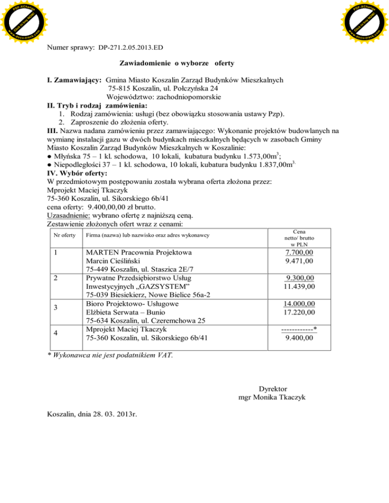 F -X C h a n ge F -X C h a n ge c u -tr a c k N y bu to k lic Numer sprawy: DP-271.2.05.2013.ED Zawiadomienie o wyborze oferty I. Zamawiaj cy: Gmina Miasto Koszalin Zarz d Budynków Mieszkalnych 75-815 Koszalin, ul. Po czy ska 24 Województwo: zachodniopomorskie II. Tryb i rodzaj zamówienia: 1. Rodzaj zamówienia: us ugi (bez obowi zku stosowania ustawy Pzp). 2. Zaproszenie do z enia oferty. III. Nazwa nadana zamówieniu przez zamawiaj cego: Wykonanie projektów budowlanych na wymian instalacji gazu w dwóch budynkach mieszkalnych b cych w zasobach Gminy Miasto Koszalin Zarz d Budynków Mieszkalnych w Koszalinie: M ska 75 – 1 kl. schodowa, 10 lokali, kubatura budynku 1.573,00m3; Niepodleg ci 37 – 1 kl. schodowa, 10 lokali, kubatura budynku 1.837,00m3. IV. Wybór oferty: W przedmiotowym post powaniu zosta a wybrana oferta z ona przez: Mprojekt Maciej Tkaczyk 75-360 Koszalin, ul. Sikorskiego 6b/41 cena oferty: 9.400,00,00 z brutto. Uzasadnienie: wybrano ofert z najni sz cen . Zestawienie z onych ofert wraz z cenami: Nr oferty Firma (nazwa) lub nazwisko oraz adres wykonawcy 1 MARTEN Pracownia Projektowa Marcin Cie li ski 75-449 Koszalin, ul. Staszica 2E/7 Prywatne Przedsi biorstwo Us ug Inwestycyjnych „GAZSYSTEM” 75-039 Biesiekierz, Nowe Bielice 56a-2 Bioro Projektowo- Us ugowe El bieta Serwata – Bunio 75-634 Koszalin, ul. Czeremchowa 25 Mprojekt Maciej Tkaczyk 75-360 Koszalin, ul. Sikorskiego 6b/41 2 3 4 Cena netto/ brutto w PLN 7.700,00 9.471,00 9.300,00 11.439,00 14.000,00 17.220,00 ------------* 9.400,00 * Wykonawca nie jest podatnikiem VAT. Dyrektor mgr Monika Tkaczyk Koszalin, dnia 28. 03. 2013r. .d o o .c m C m w o .d o w w w w w C lic k to bu y N O W ! PD O W ! PD c u -tr a c k .c