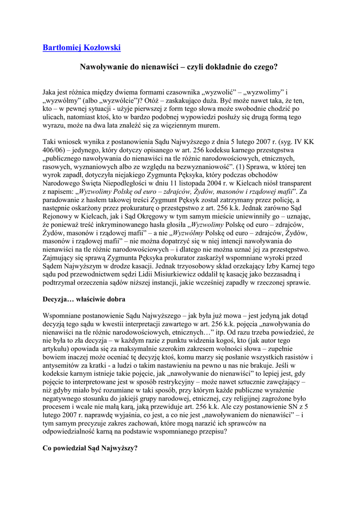 Bartłomiej Kozłowski Nawoływanie do nienawiści – czyli dokładnie do czego? Jaka jest różnica między dwiema formami czasownika „wyzwolić” – „wyzwolimy” i „wyzwólmy” (albo „wyzwólcie”)? Otóż – zaskakująco duża. Być może nawet taka, że ten, kto – w pewnej sytuacji - użyje pierwszej z form tego słowa może swobodnie chodzić po ulicach, natomiast ktoś, kto w bardzo podobnej wypowiedzi posłuży się drugą formą tego wyrazu, może na dwa lata znaleźć się za więziennym murem. Taki wniosek wynika z postanowienia Sądu Najwyższego z dnia 5 lutego 2007 r. (syg. IV KK 406/06) – jedynego, który dotyczy opisanego w art. 256 kodeksu karnego przestępstwa „publicznego nawoływania do nienawiści na tle różnic narodowościowych, etnicznych, rasowych, wyznaniowych albo ze względu na bezwyznaniowość”. (1) Sprawa, w której ten wyrok zapadł, dotyczyła niejakiego Zygmunta Pęksyka, który podczas obchodów Narodowego Święta Niepodległości w dniu 11 listopada 2004 r. w Kielcach niósł transparent z napisem: „Wyzwolimy Polskę od euro – zdrajców, Żydów, masonów i rządowej mafii”. Za paradowanie z hasłem takowej treści Zygmunt Pęksyk został zatrzymany przez policję, a następnie oskarżony przez prokuraturę o przestępstwo z art. 256 k.k. Jednak zarówno Sąd Rejonowy w Kielcach, jak i Sąd Okręgowy w tym samym mieście uniewinniły go – uznając, że ponieważ treść inkryminowanego hasła głosiła „Wyzwolimy Polskę od euro – zdrajców, Żydów, masonów i rządowej mafii” – a nie „Wyzwólmy Polskę od euro – zdrajców, Żydów, masonów i rządowej mafii” – nie można dopatrzyć się w niej intencji nawoływania do nienawiści na tle różnic narodowościowych – i dlatego nie można uznać jej za przestępstwo. Zajmujący się sprawą Zygmunta Pęksyka prokurator zaskarżył wspomniane wyroki przed Sądem Najwyższym w drodze kasacji. Jednak trzyosobowy skład orzekający Izby Karnej tego sądu pod przewodnictwem sędzi Lidii Misiurkiewicz oddalił tę kasację jako bezzasadną i podtrzymał orzeczenia sądów niższej instancji, jakie wcześniej zapadły w rzeczonej sprawie. Decyzja… właściwie dobra Wspomniane postanowienie Sądu Najwyższego – jak była już mowa – jest jedyną jak dotąd decyzją tego sądu w kwestii interpretacji zawartego w art. 256 k.k. pojęcia „nawoływania do nienawiści na tle różnic narodowościowych, etnicznych…” itp. Od razu trzeba powiedzieć, że nie była to zła decyzja – w każdym razie z punktu widzenia kogoś, kto (jak autor tego artykułu) opowiada się za maksymalnie szerokim zakresem wolności słowa – zupełnie bowiem inaczej może oceniać tę decyzję ktoś, komu marzy się posłanie wszystkich rasistów i antysemitów za kratki - a ludzi o takim nastawieniu na pewno u nas nie brakuje. Jeśli w kodeksie karnym istnieje takie pojęcie, jak „nawoływanie do nienawiści” to lepiej jest, gdy pojęcie to interpretowane jest w sposób restrykcyjny – może nawet sztucznie zawężający – niż gdyby miało być rozumiane w taki sposób, przy którym każde publiczne wyrażenie negatywnego stosunku do jakiejś grupy narodowej, etnicznej, czy religijnej zagrożone było procesem i wcale nie małą karą, jaką przewiduje art. 256 k.k. Ale czy postanowienie SN z 5 lutego 2007 r. naprawdę wyjaśnia, co jest, a co nie jest „nawoływaniem do nienawiści” – i tym samym precyzuje zakres zachowań, które mogą narazić ich sprawców na odpowiedzialność karną na podstawie wspomnianego przepisu? Co powiedział Sąd Najwyższy? Aby to ocenić, przyjrzyjmy się zasadniczym tezom tego postanowienia. Co według niego jest „nawoływaniem do nienawiści na tle różnic narodowych, etnicznych, rasowych wyznaniowych albo ze względu na bezwyznaniowość”? Otóż, jak stwierdził Sąd Najwyższy „Nawoływanie do nienawiści z powodów wymienionych w art. 256 k.k. – w tym na tle różnic narodowościowych – sprowadza się do tego typu wypowiedzi, które wzbudzają uczucia silnej niechęci, złości, braku akceptacji, wręcz wrogości do poszczególnych osób lub całych grup społecznych czy wyznaniowych bądź też z uwagi na formę wypowiedzi podtrzymują i nasilają takie negatywne nastawienia i podkreślają tym samym uprzywilejowanie, wyższość określonego narodu, grupy etnicznej, rasy lub wyznania”. Dodatkowo, jak stwierdził sąd „Przestępstwo z art. 256 k.k. ma charakter umyślny i może zostać popełnione tylko w zamiarze bez-pośrednim, o szczególnym zabarwieniu a więc w konkretnej intencji (dolus directus coloratus)”. Wnioski z orzeczenia Z przytoczonego cytatu zdają się wynikać co najmniej dwa wnioski. Pierwszy z nich jest taki, że aby popełnić przestępstwo „publicznego nawoływania do nienawiści na tle różnic narodowych, etnicznych…” etc. trzeba chcieć wywołać nienawiść na tle takowych różnic, bądź też poprzez formę wypowiedzi podtrzymywać ją i podsycać – nie wystarczy jedynie mieć zamiar np. rozpowszechnić jakieś informacje, zwróć uwagę na takie czy inne zjawiska (np. postępowanie członków jakieś grupy etnicznej, czy religijnej) – ze świadomością, że dana wypowiedź może zachęcać do nienawiści na tle różnic wskazanych w art. 256 k.k. Innymi słowy – przestępstwa „nawoływania do nienawiści” nie można popełnić w zamiarze ewentualnym, a tylko w bezpośrednim – „zabarwionym” dodatkowo celem działania. Drugi natomiast wniosek jest taki, że zakres pojęcia „nienawiści” – nawoływanie do której zakazuje art. 256 k.k. – jest całkiem szeroki. Nienawiść – jak wynika z przytoczonego fragmentu postanowienia Sądu Najwyższego – to nie tylko jakaś skrajna, destrukcyjna emocja – np. pobudzająca do czynnej agresji wściekłość – ale także mniej skrajne – choć pewnie mogące utrzymywać się dłużej – uczucia – takie n