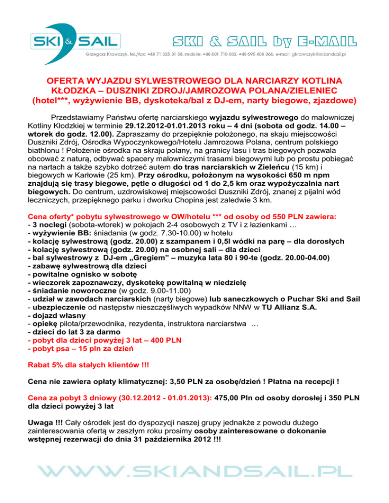 OFERTA WYJAZDU SYLWESTROWEGO DLA NARCIARZY KOTLINA KŁODZKA – DUSZNIKI ZDROJ/JAMROZOWA POLANA/ZIELENIEC (hotel***, wyżywienie BB, dyskoteka/bal z DJ-em, narty biegowe, zjazdowe) Przedstawiamy Państwu ofertę narciarskiego wyjazdu sylwestrowego do malowniczej Kotliny Kłodzkiej w terminie 29.12.2012-01.01.2013 roku – 4 dni (sobota od godz. 14.00 – wtorek do godz. 12.00). Zapraszamy do przepięknie położonego, na skaju miejscowości Duszniki Zdrój, Ośrodka Wypoczynkowego/Hotelu Jamrozowa Polana, centrum polskiego biathlonu ! Położenie ośrodka na skraju polany, na granicy lasu i tras biegowych pozwala obcować z naturą, odbywać spacery malowniczymi trasami biegowymi lub po prostu pobiegać na nartach a także szybko dotrzeć autem do tras narciarskich w Zieleńcu (15 km) i biegowych w Karłowie (25 km). Przy ośrodku, położonym na wysokości 650 m npm znajdują się trasy biegowe, pętle o długości od 1 do 2,5 km oraz wypożyczalnia nart biegowych. Do centrum, uzdrowiskowej miejscowości Duszniki Zdrój, znanej z pijalni wód leczniczych, przepięknego parku i dworku Chopina jest zaledwie 3 km. Cena oferty* pobytu sylwestrowego w OW/hotelu *** od osoby od 550 PLN zawiera: - 3 noclegi (sobota-wtorek) w pokojach 2-4 osobowych z TV i z łazienkami … - wyżywienie BB: śniadania (w godz. 7.30-10.00) w hotelu - kolację sylwestrową (godz. 20.00) z szampanem i 0,5l wódki na parę – dla dorosłych - kolację sylwestrową (godz. 20.00) na osobnej sali – dla dzieci - bal sylwestrowy z DJ-em „Gregiem” – muzyka lata 80 i 90-te (godz. 20.00-04.00) - zabawę sylwestrową dla dzieci - powitalne ognisko w sobotę - wieczorek zapoznawczy, dyskotekę powitalną w niedzielę - śniadanie noworoczne (w godz. 9.00-11.00) - udział w zawodach narciarskich (narty biegowe) lub saneczkowych o Puchar Ski and Sail - ubezpieczenie od następstw nieszczęśliwych wypadków NNW w TU Allianz S.A. - dojazd własny - opiekę pilota/przewodnika, rezydenta, instruktora narciarstwa … - dzieci do lat 3 za darmo - pobyt dla dzieci powyżej 3 lat – 400 PLN - pobyt psa – 15 pln za dzień Rabat 5% dla stałych klientów !!! Cena nie zawiera opłaty klimatycznej: 3,50 PLN za osobę/dzień ! Płatna na recepcji ! Cena za pobyt 3 dniowy (30.12.2012 - 01.01.2013): 475,00 Pln od osoby dorosłej i 350 PLN dla dzieci powyżej 3 lat Uwaga !!! Cały ośrodek jest do dyspozycji naszej grupy jednakże z powodu dużego zainteresowania ofertą w zeszłym roku prosimy osoby zainteresowane o dokonanie wstępnej rezerwacji do dnia 31 października 2012 !!! OW Jamrozowa Polana *** – Duszniki Zdrój – Kotlina Kłodzka OW Jamrozowa Polana *** - położony jest na skraju miejscowości Duszniki Zdrój. Otaczają go leśne górskie trasy spacerowe, rowerowe, biathlonowe i biegowe (oświetlone) oraz piękne lasy sosnowe. Do przyrody nie może być już bliżej ... Z ośrodka na narty do ośrodka narciarskiego Zieleniec dotrzemy autem w 15 minut (15 km) zaś do tras biegowych w Karłowie w 20 minut. Przy ośrodku są biegowe trasy narciarskie biathlonowe i wypożyczalnia nart biegowych i zjazdowych. Hotel dysponuje 104 miejscami w pokojach 1,2,3,4 osobowych i apartamentach. widok na restaurację ... i bilardową … Wszystkie pokoje hotelu wyposażone są w telefon, TV sat, posiadają łazienki z pełnym węzłem sanitarnym. Na miejscu znajduje się drink-bar, sala śniadaniowa, kominkowa, bilardowa, konferencyjna, sauna, siłownia, pole do mini golfa, plac zabaw dla dzieci oraz bezpłatny dostęp do internetu drogą WiFi. Przy hotelu jest parking. Oddalona od hotelu o 50 metrów restauracja, w której można wykupić obiady i kolacje, prowadzi pyszną domową kuchnię polską, jak również oferuje dania kuchni europejskiej. Stacja narciarska - Zieleniec Zieleniec jest największym ośrodkiem narciarskim w Kotlinie Kłodzkiej (jednym z większych w Sudetach). Jest dzielnicą Dusznik Zdroju. Leży na wysokości ok. 950 m. n. p. m. w paśmie Gór Orlickich. Panuje tam specyficzny mikroklimat (jedyny taki w Polsce) - zbliżony do alpejskiego. Ze względu na szczególny układ ciśnieniowy mas powietrza, tutejszy mikroklimat wymusza na organiźmie ludzkim zwiększenie produkcji czerwonych ciałek krwi, co w efekcie znacznie poprawia samopoczucie osób nawet kilka dni przebywających w Zieleńcu. Północne stoki Zieleńca, doskonałe tereny narciarskie oraz duża ilośc opadów w okresie zimowym (1300 mm w ciągu roku z czego 40% przypada na okres od listopada do marca) sprawiają, że śnieg leży blisko 150 dni. Zieleniec oferuje 28 wyciągów. Dla lubiących nocne jazdy przygotowanych jest 10 oświetlonych stoków. Trasy zjazdowe Zieleńca są bardzo zróżnicowane pod względem techniki jazdy: od bardzo łatwych do bardzo trudnych. Dlatego każdy znajdzie coś dla siebie. Dla osób uprawiających frestyle na nartach lub snowboardzie Zieleniec oferuje snowpark oraz pełnowymiarową rynnę (halfpipe). Trasy zjazdowe i wyciągi są tak rozmieszczone, że mamy możliwość (nie ściągając nart czy deski z nóg) przejechnia z jednego końca Zieleńca na drugi i z powrotem. Trasy biegowe w wokół Karłowa Na terenie Parku Narodowego Gór Stołowych, w okresie zimowym wytyczane są narciarskie trasy biegowe. Konfiguracja terenu oraz malowniczy, zimowy krajobraz sprzyjają uprawianiu w Górach Stołowych tej formy rekreacji. Wyznaczone są pętle, których przebieg umożliwia poruszanie się po całym niemal obszarze Parku. Punktem centralnym jest miejscowość Karłów, posiadająca odpowiednią bazę noclegową i gastronomiczną. W Karłowie rozpoczęła swoją działalność wypożyczalnia sprzętu biegowego w Karłowie. Wypożyczalnia zlokalizowana jest na parkingu przy Ośrodku Wypoczynkowym i Restauracji "Szczeliniec" - Karłów 6a. Główna pętla oznaczona jest kolorem zielonym. Jej przebieg jest następujący: Karłów - Łąki Pasterskie - Pasterka - Droga nad Urwiskiem - Skalne Grzyby - Batorówek - Ka