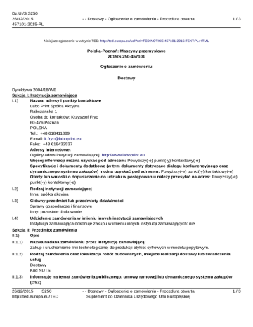 Dz.U./S S250 26/12/2015 457101-2015-PL - - Dostawy - Ogłoszenie o zamówieniu - Procedura otwarta 1/3 Niniejsze ogłoszenie w witrynie TED: http://ted.europa.eu/udl?uri=TED:NOTICE:457101-2015:TEXT:PL:HTML Polska-Poznań: Maszyny przemysłowe 2015/S 250-457101 Ogłoszenie o zamówieniu Dostawy Dyrektywa 2004/18/WE Sekcja I: Instytucja zamawiająca I.1) Nazwa, adresy i punkty kontaktowe Labo Print Spółka Akcyjna Rabczańska 1 Osoba do kontaktów: Krzysztof Fryc 60-476 Poznań POLSKA Tel.: +48 618411889 E-mail: [email protected] Faks: +48 618432537 Adresy internetowe: Ogólny adres instytucji zamawiającej: http://www.laboprint.eu Więcej informacji można uzyskać pod adresem: Powyższy(-e) punkt(-y) kontaktowy(-e) Specyfikacje i dokumenty dodatkowe (w tym dokumenty dotyczące dialogu konkurencyjnego oraz dynamicznego systemu zakupów) można uzyskać pod adresem: Powyższy(-e) punkt(-y) kontaktowy(-e) Oferty lub wnioski o dopuszczenie do udziału w postępowaniu należy przesyłać na adres: Powyższy(-e) punkt(-y) kontaktowy(-e) I.2) Rodzaj instytucji zamawiającej Inna: spółka akcyjna I.3) Główny przedmiot lub przedmioty działalności Sprawy gospodarcze i finansowe Inny: pozostałe drukowanie I.4) Udzielenie zamówienia w imieniu innych instytucji zamawiających Instytucja zamawiająca dokonuje zakupu w imieniu innych instytucji zamawiających: nie Sekcja II: Przedmiot zamówienia II.1) Opis II.1.1) Nazwa nadana zamówieniu przez instytucję zamawiającą: Zakup i uruchomienie linii technologicznej do produkcji etykiet cyfrowych w modelu popytowym. II.1.2) Rodzaj zamówienia oraz lokalizacja robót budowlanych, miejsce realizacji dostawy lub świadczenia usług Dostawy Kod NUTS II.1.3) Informacje na temat zamówienia publicznego, umowy ramowej lub dynamicznego systemu zakupów (DSZ) 26/12/2015 S250 http://ted.europa.eu/TED - - Dostawy - Ogłoszenie o zamówieniu - Procedura otwarta Suplement do Dziennika Urzędowego Unii Europejskiej 1/3 Dz.U./S S250 26/12/2015 457101-2015-PL - - Dostawy - Ogłoszenie o zamówieniu - Procedura otwarta II.1.4) Informacje na temat umowy ramowej II.1.5) Krótki opis zamówienia lub zakupu Przedmiotem zamówienia jest zakup i uruchomienie linii technologicznej do produkcji etykiet cyfrowych w modelu popytowym. II.1.6) Wspólny Słownik Zamówień (CPV) 42000000, 42900000, 42962000 II.1.7) Informacje na temat Porozumienia w sprawie zamówień rządowych (GPA) II.1.8) Części II.1.9) Informacje o ofertach wariantowych II.2) Wielkość lub zakres zamówienia II.2.1) Całkowita wielkość lub zakres: II.2.2) Informacje o opcjach II.2.3) Informacje o wznowieniach II.3) Czas trwania zamówienia lub termin realizacji 2/3 Sekcja III: Informacje o charakterze prawnym, ekonomicznym, finansowym i technicznym III.1) Warunki dotyczące zamówienia III.1.1) Wymagane wadia i gwarancje: III.1.2) Główne warunki finansowe i uzgodnienia płatnicze i/lub odniesienie do odpowiednich przepisów je regulujących: III.1.3) Forma prawna, jaką musi przyjąć grupa wykonawców, której zostanie udzielone zamówienie: III.1.4) Inne szczególne warunki III.2) Warunki udziału III.2.1) Sytuacja podmiotowa wykonawców, w tym wymogi związane z wpisem do rejestru zawodowego lub handlowego III.2.2) Zdolność ekonomiczna i finansowa III.2.3) Kwalifikacje techniczne III.2.4) Informacje o zamówieniach zastrzeżonych III.3) Specyficzne warunki dotyczące zamówień na usługi III.3.1) Informacje dotyczące określonego zawodu III.3.2) Osoby odpowiedzialne za wykonanie usługi Sekcja IV: Procedura IV.1) Rodzaj procedury IV.1.1) Rodzaj procedury Otwarta IV.1.2) Ograniczenie liczby wykonawców, którzy zostaną zaproszeni do składania ofert lub do udziału IV.1.3) Zmniejszenie liczby wykonawców podczas negocjacji lub dialogu IV.2) Kryteria udzielenia zamówienia IV.2.1) Kryteria udzielenia zamówienia Oferta najkorzystniejsza ekonomicznie z uwzględnieniem kryteriów kryteria określone w specyfikacjach, w zaproszeniu do składania ofert lub negocjacji lub w dokumencie opisowym 26/12/2015 S250 http://ted.europa.eu/TED - - Dostawy - Ogłoszenie o zamówieniu - Procedura otwarta Suplement do Dziennika Urzędowego Unii Europejskiej 2/3 Dz.U./S S250 26/12/2015 457101-2015-PL - - Dostawy - Ogłoszenie o zamówieniu - Procedura otwarta IV.2.2) Informacje na temat aukcji elektronicznej IV.3) Informacje administracyjne IV.3.1) Numer referencyjny nadany sprawie przez instytucję zamawiającą: IV.3.2) Poprzednie publikacje dotyczące tego samego zamówienia IV.3.3) Warunki otrzymania specyfikacji, dokumentów dodatkowych lub dokumentu opisowego IV.3.4) Termin składania ofert lub wniosków o dopuszczenie do udziału w postępowaniu 2.2.2016 - 14:00 IV.3.5) Data wysłania zaproszeń do składania ofert lub do udziału zakwalifikowanym kandydatom IV.3.6) Języki, w których można sporządzać oferty lub wnioski o dopuszczenie do udziału w postępowaniu IV.3.7) Minimalny okres, w którym oferent będzie związany ofertą IV.3.8) Warunki otwarcia ofert 3/3 Sekcja VI: Informacje uzupełniające VI.1) Informacje o powtarzającym się charakterze zamówienia VI.2) Informacje o funduszach Unii Europejskiej Zamówienie dotyczy projektu/programu finansowanego ze środków Unii Europejskiej: tak Podać odniesienie do projektu (projektów) i/lub programu (programów): Wielkopolski Regionalny Program Operacyjny 2014-2020 Poddziałanie 1.5.2 – Wsparcie wysoko innowacyjnych przedsiębiorstw (wdrażających innowacje technologiczne, procesowe, produktowe) poprzez inwestycje w: środki trwałe; wartości niematerialne i prawne(inwestycje w transfer technologii poprzez nabycie praw patentowych, licencji, know-how lub nieopatentowanej wiedzy technicznej). VI.3) Informacje dodatkowe Nasza firma jest zobowiązana na mocy przepisów krajowych, aby opublikować ogłoszenie, ponieważ ubiega się o środki publiczne na towary, które mają być zamawiane. VI.4) Procedury odwoławcze VI.4.1) Organ odpowiedzial
