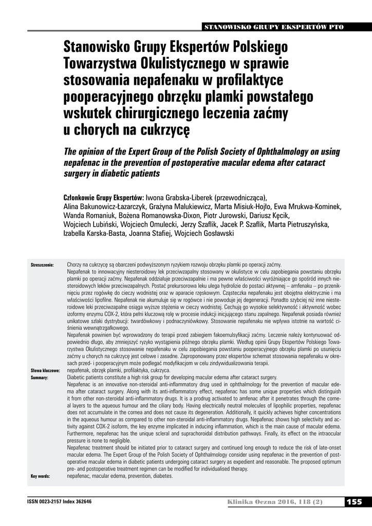 STANOWISKO GRUPY EKSPERTÓW PTO Stanowisko Grupy Ekspertów Polskiego Towarzystwa Okulistycznego w sprawie stosowania nepafenaku w profilaktyce pooperacyjnego obrzęku plamki powstałego wskutek chirurgicznego leczenia zaćmy u chorych na cukrzycę The opinion of the Expert Group of the Polish Society of Ophthalmology on using nepafenac in the prevention of postoperative macular edema after cataract surgery in diabetic patients Członkowie Grupy Ekspertów: Iwona Grabska-Liberek (przewodnicząca), Alina Bakunowicz-Łazarczyk, Grażyna Malukiewicz, Marta Misiuk-Hojło, Ewa Mrukwa-Kominek, Wanda Romaniuk, Bożena Romanowska-Dixon, Piotr Jurowski, Dariusz Kęcik, Wojciech Lubiński, Wojciech Omulecki, Jerzy Szaflik, Jacek P. Szaflik, Marta Pietruszyńska, Izabella Karska-Basta, Joanna Stafiej, Wojciech Gosławski Streszczenie: Słowa kluczowe: Summary: Key words: Chorzy na cukrzycę są obarczeni podwyższonym ryzykiem rozwoju obrzęku plamki po operacji zaćmy. Nepafenak to innowacyjny niesteroidowy lek przeciwzapalny stosowany w okulistyce w celu zapobiegania powstaniu obrzęku plamki po operacji zaćmy. Nepafenak oddziałuje przeciwzapalnie i ma pewne właściwości wyróżniające go spośród innych niesteroidowych leków przeciwzapalnych. Postać prekursorowa leku ulega hydrolizie do postaci aktywnej – amfenaku – po przeniknięciu przez rogówkę do cieczy wodnistej oraz w aparacie rzęskowym. Cząsteczka nepafenaku jest obojętna elektrycznie i ma właściwości lipofilne. Nepafenak nie akumuluje się w rogówce i nie powoduje jej degeneracji. Ponadto szybciej niż inne niesteroidowe leki przeciwzapalne osiąga wyższe stężenia w cieczy wodnistej. Cechują go wysokie selektywność i aktywność wobec izoformy enzymu COX-2, która pełni kluczową rolę w procesie indukcji inicjującego stanu zapalnego. Nepafenak posiada również unikatowe szlaki dystrybucji: twardówkowy i podnaczyniówkowy. Stosowanie nepafenaku nie wpływa istotnie na wartość ciśnienia wewnątrzgałkowego. Nepafenak powinien być wprowadzony do terapii przed zabiegiem fakoemulsyfikacji zaćmy. Leczenie należy kontynuować odpowiednio długo, aby zmniejszyć ryzyko wystąpienia późnego obrzęku plamki. Według opinii Grupy Ekspertów Polskiego Towarzystwa Okulistycznego stosowanie nepafenaku w celu zapobiegania powstaniu pooperacyjnego obrzęku plamki po usunięciu zaćmy u chorych na cukrzycę jest celowe i zasadne. Zaproponowany przez ekspertów schemat stosowania nepafenaku w okresach przed- i pooperacyjnym może podlegać modyfikacjom w celu zindywidualizowania terapii. nepafenak, obrzęk plamki, profilaktyka, cukrzyca. Diabetic patients constitute a high risk group for developing macular edema after cataract surgery. Nepafenac is an innovative non-steroidal anti-inflammatory drug used in ophthalmology for the prevention of macular edema after cataract surgery. Along with its anti-inflammatory effect, nepafenac has some unique properties which distinguish it from other non-steroidal anti-inflammatory drugs. It is a prodrug activated to amfenac after it penetrates through the corneal layers to the aqueous humour and the ciliary body. Having electrically neutral molecules of lipophilic properties, nepafenac does not accumulate in the cornea and does not cause its degeneration. Additionally, it quickly achieves higher concentrations in the aqueous humour as compared to other non-steroidal anti-inflammatory drugs. Nepafenac shows high selectivity and activity against COX-2 isoform, the key enzyme implicated in inducing inflammation, which is the main cause of macular edema. Furthermore, nepafenac has the unique scleral and suprachoroidal distribution pathways. Finally, its effect on the intraocular pressure is none to negligible. Nepafenac treatment should be initiated prior to cataract surgery and continued long enough to reduce the risk of late-onset macular edema. The Expert Group of the Polish Society of Ophthalmology consider using nepafenac in the prevention of post operative macular edema in diabetic patients undergoing cataract surgery as expedient and reasonable. The proposed optimum pre- and postoperative treatment regimen can be modified for individualised therapy. nepafenac, macular edema, prevention, diabetes. ISSN 0023-2157 Index 362646 Klinika Oczna 2016, 118 (2) 155 Stanowisko Grupy Ekspertów Polskiego Towarzystwa Okulistycznego w sprawie stosowania nepafenaku w profilaktyce pooperacyjnego obrzęku… Wstęp Cukrzyca stanowi obecnie istotny problem zdrowia publicznego w Polsce (1). W badaniu WOBASZ obserwowano jej występowanie u 7,4% mężczyzn i u 6,2% kobiet. Nieprawidłową tolerancję glukozy stwierdzono u 12,4% mężczyzn i u 6,9% kobiet. Spośród wszystkich chorujących na cukrzycę uczestników tego badania leczonych było 51,9% mężczyzn i 62,0% kobiet (2). Według raportu Międzynarodowej Federacji Cukrzycy (International Diabetes Federation – IDF) w 2011 roku w Polsce na cukrzycę chorowało około 3,1 mln ludzi, czyli 10,6% dorosłej populacji. W tym prawie milion osób (około 30% wszystkich chorych na cukrzycę) to chorzy niezdiagnozowani i nieleczeni, niemający zatem świadomości, że chorują (3). Prognozy opracowane przez IDF wskazują, że w 2035 roku liczba chorujących na cukrzycę w skali światowej zwiększy się o połowę (4). Chorzy na cukrzycę – grupa podwyższonego ryzyka wystąpienia obrzęku plamki po operacji zaćmy Chorych na cukrzycę zaliczamy do szczególnej grupy ryzyka rozwinięcia się torbielowatego obrzęku plamki (Cystoid Macular Edema – CME) po operacji zaćmy (5, 6). Ponadto u chorych na cukrzycę ze względu na zmiany występujące w obrębie oczu, w tym zmiany w komórkach receptorowych oraz naczyniach krwionośnych prowadzące do niedotlenienia siatkówki, i zaburzenia krzepnięcia krwi (7) oraz wyjściowo wyższe niż u osób zdrowych stężenie prostaglandyn (PG) ryzyko wystąpienia powikłań pooperacyjnych i pogorszenia widzen