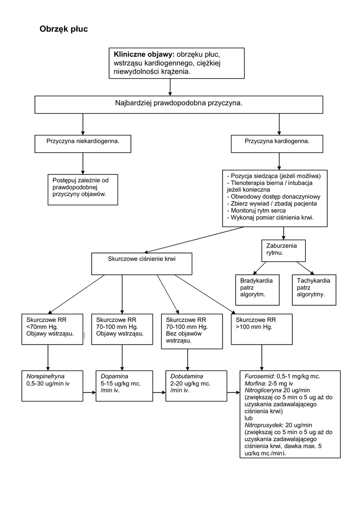 Obrz k p uc Kliniczne objawy: obrz ku p uc, wstrz su kardiogennego, ci kiej niewydolno ci kr enia. Najbardziej prawdopodobna przyczyna. Przyczyna niekardiogenna. Przyczyna kardiogenna. - Pozycja siedz ca (je eli mo liwa) - Tlenoterapia bierna / intubacja je eli konieczna - Obwodowy dost p donaczyniowy - Zbierz wywiad / zbadaj pacjenta - Monitoruj rytm serca - Wykonaj pomiar ci nienia krwi. Post puj zale nie od prawdopodobnej przyczyny objawów. Zaburzenia rytmu. Skurczowe ci nienie krwi Bradykardia patrz algorytm. Skurczowe RR <70mm Hg. Objawy wstrz su. Norepinefryna 0,5-30 ug/min iv Skurczowe RR 70-100 mm Hg. Objawy wstrz su. Dopamina 5-15 ug/kg mc. /min iv. Skurczowe RR 70-100 mm Hg. Bez objawów wstrz su. Dobutamina 2-20 ug/kg mc. /min iv. Tachykardia patrz algorytmy. Skurczowe RR >100 mm Hg. Furosemid: 0,5-1 mg/kg mc. Morfina: 2-5 mg iv Nitrogliceryna 20 ug/min (zwi kszaj co 5 min o 5 ug a do uzyskania zadawalaj cego ci nienia krwi) lub Nitroprusydek: 20 ug/min (zwi kszaj co 5 min o 5 ug a do uzyskania zadawalaj cego ci nienia krwi, dawka max. 5 ug/kg mc./min).