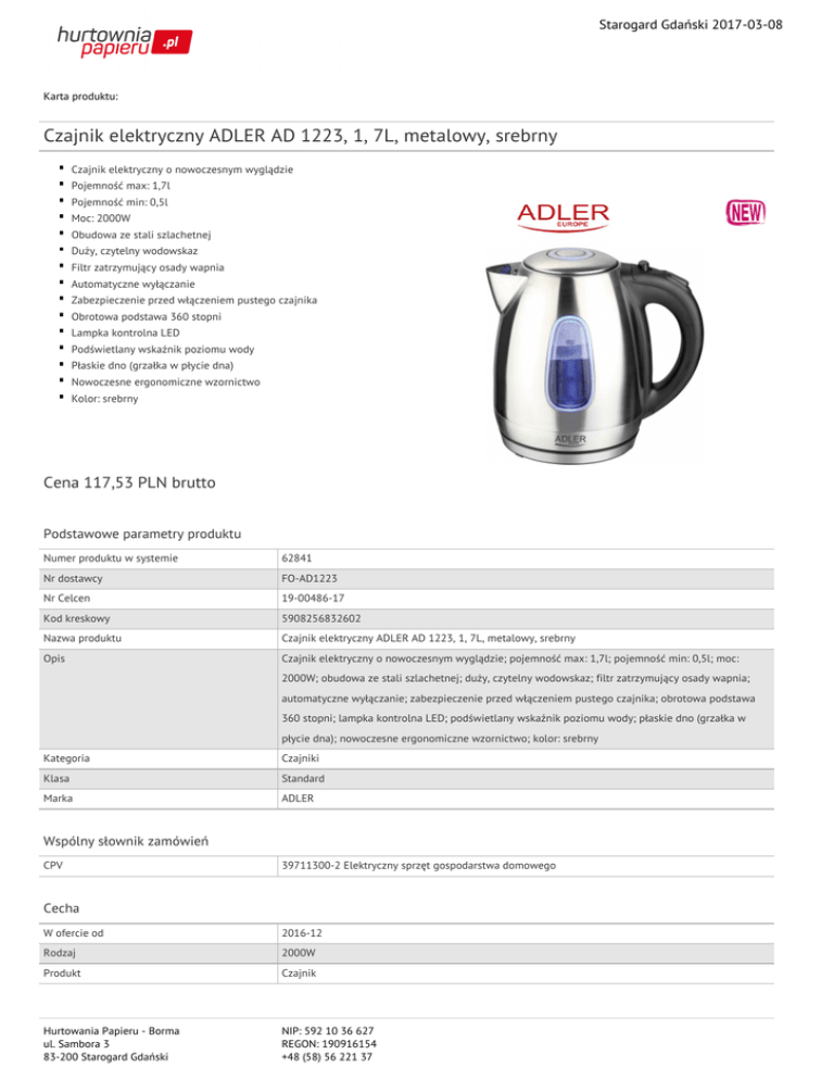 Starogard Gdański 2017-03-08 Karta produktu: Czajnik elektryczny ADLER AD 1223, 1, 7L, metalowy, srebrny Czajnik elektryczny o nowoczesnym wyglądzie Pojemność max: 1,7l Pojemność min: 0,5l Moc: 2000W Obudowa ze stali szlachetnej Duży, czytelny wodowskaz Filtr zatrzymujący osady wapnia Automatyczne wyłączanie Zabezpieczenie przed włączeniem pustego czajnika Obrotowa podstawa 360 stopni Lampka kontrolna LED Podświetlany wskaźnik poziomu wody Płaskie dno (grzałka w płycie dna) Nowoczesne ergonomiczne wzornictwo Kolor: srebrny Cena 117,53 PLN brutto Podstawowe parametry produktu Numer produktu w systemie 62841 Nr dostawcy FO-AD1223 Nr Celcen 19-00486-17 Kod kreskowy 5908256832602 Nazwa produktu Czajnik elektryczny ADLER AD 1223, 1, 7L, metalowy, srebrny Opis Czajnik elektryczny o nowoczesnym wyglądzie; pojemność max: 1,7l; pojemność min: 0,5l; moc: 2000W; obudowa ze stali szlachetnej; duży, czytelny wodowskaz; filtr zatrzymujący osady wapnia; automatyczne wyłączanie; zabezpieczenie przed włączeniem pustego czajnika; obrotowa podstawa 360 stopni; lampka kontrolna LED; podświetlany wskaźnik poziomu wody; płaskie dno (grzałka w płycie dna); nowoczesne ergonomiczne wzornictwo; kolor: srebrny Kategoria Czajniki Klasa Standard Marka ADLER Wspólny słownik zamówień CPV 39711300-2 Elektryczny sprzęt gospodarstwa domowego Cecha W ofercie od 2016-12 Rodzaj 2000W Produkt Czajnik Hurtowania Papieru - Borma ul. Sambora 3 83-200 Starogard Gdański NIP: 592 10 36 627 REGON: 190916154 +48 (58) 56 221 37 Starogard Gdański 2017-03-08 Karta katalogowa produktu cd. Czajnik elektryczny ADLER AD 1223, 1, 7L, metalowy, srebrny Typ Elektryczny Materiał Metal Wymiary Pojemność (ml) 1700 Certyfikaty Hit Standard Nowy produkt w ofercie Nowość Kolor Kolor Srebrny Pozostałe zdjęcia produktu Serdecznie zapraszamy do współpracy Hurtowania Papieru - Borma zespół. Hurtowania Papieru - Borma ul. Sambora 3 83-200 Starogard Gdański NIP: 592 10 36 627 REGON: 190916154 +48 (58) 56 221 37