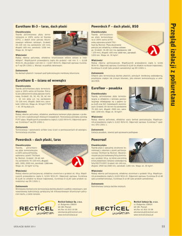 Powerdeck F – dach płaski, BSO Charakterystyka Twarda poliuretanowa płyta termoizolacyjna w 100% wolna od freonów (CFC), z dwóch stron pokryta bitumizowanym włóknem szklanym. Grubość: 30–100 mm (na zamówienie 120 mm), długość: 600 mm, szerokość: 1200 mm. Waga: ok. 30 kg/m3. Charakterystyka Twarda poliizocjanurowa płyta termoizolacyjna w 100% wolna od freonów, wykonana z pianki TAUfoam by Recticel. Płyta obustronnie pokryta jest okładziną z włókna szklanego. Grubość: 30–80 mm (na zamówienie 100 i 120 mm), długość: 600 oraz 1000 mm, szerokość: 1200 mm. Waga: ok. 30 kg/m3. Właściwości Rodzaj rdzenia: poliuretan, okładzina: bitumizowane włókno szklane w ilości 400g/m2. Współczynnik przewodzenia ciepła dla grubości < 60 mm: λ = 0,028 W/(m·K), dla grubości > 60 mm: λ = 0,027 W/(m·K). Odporność ogniowa: Euroklasa F wg EN 13501-1. Montaż: na podłożu betonowym. Zastosowanie Na dachach płaskich i tarasach pod hydroizolacyjne membrany bitumiczne. Eurothane G – ściana od wewnątrz Charakterystyka Twarda poliuretanowa płyta termoizolacyjna w 100% wolna od freonów. Pokryta jest jednostronnie płytą gipsowo-kartonową. Grubość: 20, 30, 40, 50, 60 mm + 10 mm płyty g-k (na zamówienie 70–120 mm), długość: 2600 mm, szerokość: 1200 mm. Waga: ok. 30 kg/m3 PUR + ok. 30 kg płyty g-k. Właściwości Rodzaj rdzenia: poliizocjanurat. Współczynnik przewodzenia ciepła λ: 0,026 W/(m·K). Odporność ogniowa: Euroklasa B-s2,d0 (w układzie na blasze trapezowej), Euroklasa E-s2,d0 (jako produkt samodzielny) wg EN 13501-1. Zastosowanie Głównie jako termoizolacja dachów płaskich, pokrytych membraną wodoodporną, przyklejona ciepłym lub zimnym bitumem, jako element termoizolacyjny w układzie BSO. Eurofloor – posadzka Właściwości Rodzaj rdzenia: poliuretan, okładzina: powlekana kartonem płyta gipsowa o grubości 9,5 mm o wykończonych dłuższych krawędziach. Paroizolacja pomiędzy warstwą PUR i gipsu. Współczynnik przewodzenia ciepła λ: 0,023 W/(m·K). Odporność ogniowa: Euroklasa F wg EN 13501-1. Charakterystyka Twarda, poliuretanowa płyta termoizolacyjna w okładzinie z laminatu paroizolacyjnego składającego się z papieru typu kraft oraz folii (metalowych) aluminiowych. Grubość: 20–60 mm (na zamówienie 70–100 mm), długość: 2500 mm, szerokość: 1200 mm. Waga: ok. 30 kg/m3. Właściwości Rodzaj rdzenia: poliuretan, okładzina: szary laminat paroizolacyjny. Współczynnik przewodzenia ciepła λ: 0,023 W/(m·K). Odporność ogniowa: Euroklasa F zgodnie z EN 13501-1. Zastosowanie Termoizolacja i wykończenie sufitów (oraz ścian) w pomieszczeniach od wewnątrz. Termoizolacja strychów. Zastosowanie Izolacje posadzek, również pod ogrzewanie podłogowe. Powerdeck – dach płaski, taras Powerroof Charakterystyka Twarda, poliuretanowa płyta termoizolacyjna w 100% wolna od freonów, wykonana z pianki TAUfoam by Recticel. Grubość: 30–60 mm (na zamówienie 70–120 mm), długość: 600, 1000, 2500 mm, szerokość: 1200 mm. Waga: ok. 33 kg/m3 ± 2 kg. Charakterystyka Twarda płyta o specjalnej strukturze komórkowej z rdzeniem z pianki poliizocjanurowej TAUfoam by Recticel. Obustronnie pokryta jest karbowaną folią aluminiową o grubości 50 μ, na której wierzchnią stronę dodatkowo nałożono wodoodporną folię RECTIVENT. Grubość: 60–140 mm, długość: 2400 lub 2500 mm, szerokość: 1200 mm. Waga: ok. 30 kg/m3. Właściwości Rodzaj rdzenia: poliizocjanurat, okładzina: aluminium o grubości ok. 50 μ. Współczynnik przewodzenia ciepła λ: 0,024 W/(m·K). Odporność ogniowa: Euroklasa B-s2,d0 (w układzie na blasze trapezowej), Euroklasa D-s2,d0 (jako produkt samodzielny) wg EN 13501-1. Właściwości Rodzaj rdzenia: poliizocjanurat, okładzina: aluminium o grubości 50 μ. Współczynnik przewodzenia ciepła λ: 0,024 W/(m·K). Odporność ogniowa: Euroklasa B-s2-d0 (jako przekład końcowy), Euroklasa D-s2-d0 (jako produkt samodzielny). Zastosowanie Montowana mechanicznie termoizolacja dachów płaskich o podłożu metalowym z jednowarstwową hydroizolacją syntetyczną lub kilkuwarstwowym bitumicznym pokryciem dachu, a także tarasów. Recticel Izolacje Sp. z o.o. ul. Bułgarska 108A/4 60-381 Poznań tel./fax: 61 815 10 08 [email protected] www.recticelizolacje.pl IZOLACJE XI/XII 2011 Zastosowanie Nakrokwiowa izolacja dachów skośnych. Recticel Izolacje Sp. z o.o. ul. Bułgarska 108A/4 60-381 Poznań tel./fax: 61 815 10 08 [email protected] www.recticelizolacje.pl 55 Przegląd izolacji z poliuretanu Eurothane Bi-3 – taras, dach płaski