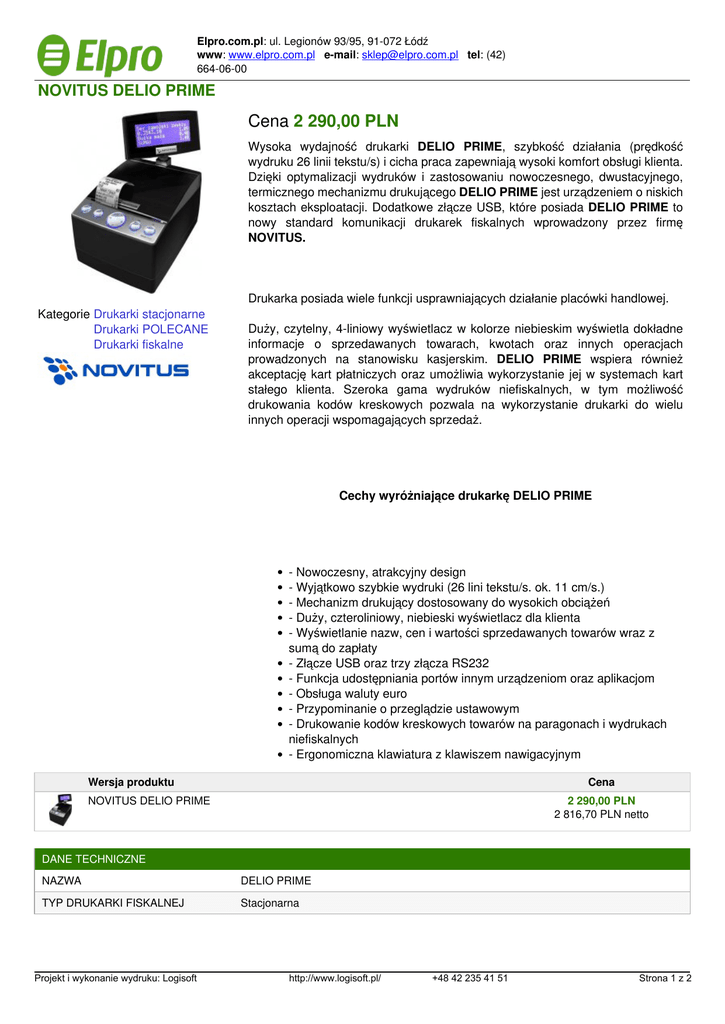 Elpro.com.pl: ul. Legionów 93/95, 91-072 Łódź www: www.elpro.com.pl e-mail: [email protected] tel: (42) 664-06-00 NOVITUS DELIO PRIME Cena 2 290,00 PLN Wysoka wydajność drukarki DELIO PRIME, szybkość działania (prędkość wydruku 26 linii tekstu/s) i cicha praca zapewniają wysoki komfort obsługi klienta. Dzięki optymalizacji wydruków i zastosowaniu nowoczesnego, dwustacyjnego, termicznego mechanizmu drukującego DELIO PRIME jest urządzeniem o niskich kosztach eksploatacji. Dodatkowe złącze USB, które posiada DELIO PRIME to nowy standard komunikacji drukarek fiskalnych wprowadzony przez firmę NOVITUS. Drukarka posiada wiele funkcji usprawniających działanie placówki handlowej. Kategorie Drukarki stacjonarne Drukarki POLECANE Drukarki fiskalne Duży, czytelny, 4-liniowy wyświetlacz w kolorze niebieskim wyświetla dokładne informacje o sprzedawanych towarach, kwotach oraz innych operacjach prowadzonych na stanowisku kasjerskim. DELIO PRIME wspiera również akceptację kart płatniczych oraz umożliwia wykorzystanie jej w systemach kart stałego klienta. Szeroka gama wydruków niefiskalnych, w tym możliwość drukowania kodów kreskowych pozwala na wykorzystanie drukarki do wielu innych operacji wspomagających sprzedaż. Cechy wyróżniające drukarkę DELIO PRIME - Nowoczesny, atrakcyjny design - Wyjątkowo szybkie wydruki (26 lini tekstu/s. ok. 11 cm/s.) - Mechanizm drukujący dostosowany do wysokich obciążeń - Duży, czteroliniowy, niebieski wyświetlacz dla klienta - Wyświetlanie nazw, cen i wartości sprzedawanych towarów wraz z sumą do zapłaty - Złącze USB oraz trzy złącza RS232 - Funkcja udostępniania portów innym urządzeniom oraz aplikacjom - Obsługa waluty euro - Przypominanie o przeglądzie ustawowym - Drukowanie kodów kreskowych towarów na paragonach i wydrukach niefiskalnych - Ergonomiczna klawiatura z klawiszem nawigacyjnym Wersja produktu Cena NOVITUS DELIO PRIME 2 290,00 PLN 2 816,70 PLN netto DANE TECHNICZNE NAZWA DELIO PRIME TYP DRUKARKI FISKALNEJ Stacjonarna Projekt i wykonanie wydruku: Logisoft http://www.logisoft.pl/ +48 42 235 41 51 Strona 1 z 2 PRZEZNACZENIE Średnie i duże punkty sprzedaży detalicznej i hurtowej LICZBA PROGRAMOWANYCH TOWARÓW 150 000 STAWKI PODATKOWE 7 LICZBA ZNAKÓW W NAZWIE TOWARU 40 NOŚNIK KOPII ELEKTRONICZNEJ Brak MECHANIZM DRUKUJĄCY Dwustacyjna drukarka termiczna CITIZEN LT483 SZEROKOŚĆ PAPIERU 2 x 49 mm KLAWIATURA Switch'owa LICZBA KLAWISZY 4 + klawisz nawigacyjny WYŚWIETLACZ OBSŁUGI Wspólny z wyświetlaczem klienta WYŚWIETLACZ KLIENTA Alfanumeryczny, obrotowy, podświetlany (niebieski) LCD, 4 x 20 znaków INTERFEJSY 3 x RS232 + USB (dwukanałowe) URZĄDZENIA WSPÓŁPRACUJĄCE Komputer, terminal EFT , PinPad, czytnik kart magnetycznych, skaner, szuflada, modem i inne ZASILANIE ZEWNĘTRZNE 230 V, zasilacz zewnętrzny ZASILANIE WEWNĘTRZNE Wbudowany akumulator (2 x 12 V 0,8 Ah) GABARYTY (szer. x dł. x wys.) 170 x 240 x 255 mm WAGA 3,1 kg Produkty powiązane Rolki termiczne 17,24 PLN EMERSON ROLKI TERMICZNE 49/30 10SZT Projekt i wykonanie wydruku: Logisoft Powered by TCPDF (www.tcpdf.org) http://www.logisoft.pl/ +48 42 235 41 51 Strona 2 z 2