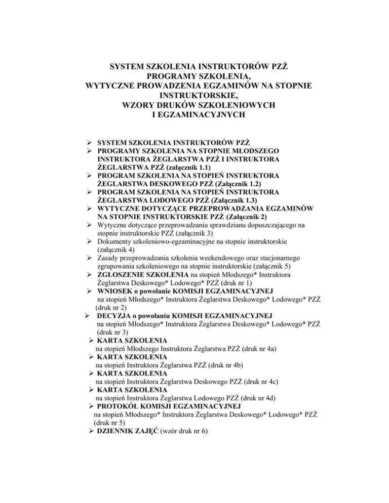 pieczęć organizatora szkolenia SYSTEM SZKOLENIA INSTRUKTORÓW PZŻ PROGRAMY SZKOLENIA, WYTYCZNE PROWADZENIA EGZAMINÓW NA STOPNIE INSTRUKTORSKIE, WZORY DRUKÓW SZKOLENIOWYCH I EGZAMINACYJNYCH SYSTEM SZKOLENIA INSTRUKTORÓW PZŻ PROGRAMY SZKOLENIA NA STOPNIE MŁODSZEGO INSTRUKTORA ŻEGLARSTWA PZŻ I INSTRUKTORA ŻEGLARSTWA PZŻ (załącznik 1.1) PROGRAM SZKOLENIA NA STOPIEŃ INSTRUKTORA ŻEGLARSTWA DESKOWEGO PZŻ (Załącznik 1.2) PROGRAM SZKOLENIA NA STOPIEŃ INSTRUKTORA ŻEGLARSTWA LODOWEGO PZŻ (Załącznik 1.3) WYTYCZNE DOTYCZĄCE PRZEPROWADZANIA EGZAMINÓW NA STOPNIE INSTRUKTORSKIE PZŻ (Załącznik 2) Wytyczne dotyczące przeprowadzania sprawdzianu dopuszczającego na stopnie instruktorskie PZŻ (załącznik 3) Dokumenty szkoleniowo-egzaminacyjne na stopnie instruktorskie (załącznik 4) Zasady przeprowadzania szkolenia weekendowego oraz stacjonarnego zgrupowania szkoleniowego na stopnie instruktorskie (załącznik 5) ZGŁOSZENIE SZKOLENIA na stopień Młodszego* Instruktora Żeglarstwa Deskowego* Lodowego* PZŻ (druk nr 1) WNIOSEK o powołanie KOMISJI EGZAMINACYJNEJ na stopień Młodszego* Instruktora Żeglarstwa Deskowego* Lodowego* PZŻ (druk nr 2) DECYZJA o powołaniu KOMISJI EGZAMINACYJNEJ na stopień Młodszego* Instruktora Żeglarstwa Deskowego* Lodowego* PZŻ (druk nr 3) KARTA SZKOLENIA na stopień Młodszego Instruktora Żeglarstwa PZŻ (druk nr 4a) KARTA SZKOLENIA na stopień Instruktora Żeglarstwa PZŻ (druk nr 4b) KARTA SZKOLENIA na stopień Instruktora Żeglarstwa Deskowego PZŻ (druk nr 4c) KARTA SZKOLENIA na stopień Instruktora Żeglarstwa Lodowego PZŻ (druk nr 4d) PROTOKÓŁ KOMISJI EGZAMINACYJNEJ na stopień Młodszego* Instruktora Żeglarstwa Deskowego* Lodowego* PZŻ (druk nr 5) DZIENNIK ZAJĘĆ (wzór druk nr 6) ZAŚWIADCZENIE zaliczeniu sprawdzianu dopuszczającego do szkolenia na stopień Młodszego* Instruktora Żeglarstwa Deskowego* Lodowego* PZŻ (druk nr 7) POTWIERDZENIE ODBYCIA STAŻU na stopień Instruktora Żeglarstwa Deskowego* Lodowego* PZŻ (druk nr 8) ZAŚWIADCZENIE O ODBYCIU SZKOLENIA na stopień Młodszego* Instruktora Żeglarstwa Deskowego* Lodowego* PZŻ (druk nr 9) ZAŚWIADCZENIE LEKARSKIE dla kandydatów na stopień Instruktora Żeglarstwa Deskowego PZŻ (druk nr 10) WNIOSEK O WYMIANĘ PATENTU Młodszego* Instruktora Żeglarstwa Deskowego* Lodowego* PZŻ (druk nr 11) WNIOSEK O NADANIE TYTUŁU Instruktora Wykładowcy PZŻ (druk nr 12) OPINIA dla kandydatów do tytułu Instruktora Wykładowcy PZŻ (druk nr 13) WNIOSEK O WYMIANĘ LEGITYMACJI Instruktora Wykładowcy PZŻ (druk nr 14).