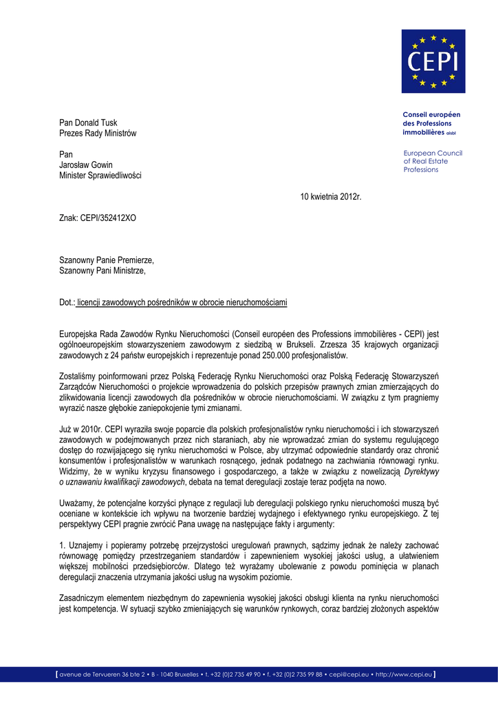 Conseil européen des Professions immobilières aisbl Pan Donald Tusk Prezes Rady Ministrów European Council of Real Estate Professions Pan Jarosław Gowin Minister Sprawiedliwości 10 kwietnia 2012r. Znak: CEPI/352412XO Szanowny Panie Premierze, Szanowny Pani Ministrze, Dot.: licencji zawodowych pośredników w obrocie nieruchomościami Europejska Rada Zawodów Rynku Nieruchomości (Conseil européen des Professions immobilières - CEPI) jest ogólnoeuropejskim stowarzyszeniem zawodowym z siedzibą w Brukseli. Zrzesza 35 krajowych organizacji zawodowych z 24 państw europejskich i reprezentuje ponad 250.000 profesjonalistów. Zostaliśmy poinformowani przez Polską Federację Rynku Nieruchomości oraz Polską Federację Stowarzyszeń Zarządców Nieruchomości o projekcie wprowadzenia do polskich przepisów prawnych zmian zmierzających do zlikwidowania licencji zawodowych dla pośredników w obrocie nieruchomościami. W związku z tym pragniemy wyrazić nasze głębokie zaniepokojenie tymi zmianami. JuŜ w 2010r. CEPI wyraziła swoje poparcie dla polskich profesjonalistów rynku nieruchomości i ich stowarzyszeń zawodowych w podejmowanych przez nich staraniach, aby nie wprowadzać zmian do systemu regulującego dostęp do rozwijającego się rynku nieruchomości w Polsce, aby utrzymać odpowiednie standardy oraz chronić konsumentów i profesjonalistów w warunkach rosnącego, jednak podatnego na zachwiania równowagi rynku. Widzimy, Ŝe w wyniku kryzysu finansowego i gospodarczego, a takŜe w związku z nowelizacją Dyrektywy o uznawaniu kwalifikacji zawodowych, debata na temat deregulacji zostaje teraz podjęta na nowo. UwaŜamy, Ŝe potencjalne korzyści płynące z regulacji lub deregulacji polskiego rynku nieruchomości muszą być oceniane w kontekście ich wpływu na tworzenie bardziej wydajnego i efektywnego rynku europejskiego. Z tej perspektywy CEPI pragnie zwrócić Pana uwagę na następujące fakty i argumenty: 1. Uznajemy i popieramy potrzebę przejrzystości uregulowań prawnych, sądzimy jednak Ŝe naleŜy zachować równowagę pomiędzy przestrzeganiem standardów i zapewnieniem wysokiej jakości usług, a ułatwieniem większej mobilności przedsiębiorców. Dlatego teŜ wyraŜamy ubolewanie z powodu pominięcia w planach deregulacji znaczenia utrzymania jakości usług na wysokim poziomie. Zasadniczym elementem niezbędnym do zapewnienia wysokiej jakości obsługi klienta na rynku nieruchomości jest kompetencja. W sytuacji szybko zmieniających się warunków rynkowych, coraz bardziej złoŜonych aspektów [ avenue de Tervueren 36 bte 2 • B - 1040 Bruxelles • t. +32 (0)2 735 49 90 • f. +32 (0)2 735 99 88 • [email protected] • http://www.cepi.eu ] prawnych i technicznych oraz nowych pojawiających się ograniczeń, niezbędny jest wysoki poziom kwalifikacji profesjonalistów, zaś moŜliwość skorzystania z usług fachowców, których umiejętności są potwierdzone odpowiednim świadectwem jest niezbywalnym prawem konsumentów. Zakup domu lub mieszkania jest najwaŜniejszą decyzją, jaką podejmuje rodzina, a z powodu wysokiego stopnia skomplikowania transakcji potrzebuje ona specjalistycznej pomocy przy jej przeprowadzeniu. WyraŜamy głębokie przekonanie, Ŝe przeciętny pośrednik musi posiadać umiejętności konieczne do bezpiecznego przeprowadzenia konsumenta przez procedury transakcji i tym samym gwarantujące jej sukces. Jesteśmy takŜe przeświadczeni, Ŝe zarówno wejście na rynek krajowy, jak i wykonywanie na nim działalności zawodowej musi być uregulowane w jasny i przejrzysty sposób 2. Kwestia regulacji zwodów pozostaje w gestii poszczególnych państw członkowskich, przy czym powinny one stosować zasadę pomocniczości. Musimy zdać sobie sprawę z bardzo róŜnych tradycji funkcjonujących w tej dziedzinie w Europie. Zaledwie kilka krajów, na przykład Wielka Brytania, zdecydowało się jakiś czas temu na pełną deregulację rynku nieruchomości, wspierając jednocześnie samoregulację prowadzoną przez specjalistów pracujących na tym rynku. Inne kraje, na przykład Holandia, podjęły decyzję o deregulacji niektórych obszarów rynku, przekazując organizacjom zawodowym misję utrzymania wysokich standardów dla profesjonalistów i stworzenia punktu odniesienia dla klientów. W Belgii powołano urząd (IPI) nadzorujący wdraŜanie przepisów regulacyjnych. Poza Polską, większość krajów Europy Centralnej, nie ma zarówno regulacji, jak i organizacji zawodowych. Uznajemy, Ŝe potrzeba dalszego rozwoju rynku oraz potrzeba identyfikacji przeszkód, które utrudniają obywatelom innych państw członkowskich dostęp do rynków narodowych i do prowadzenia na nich działalności gospodarczej wymagają usprawnienia procedur uznawania kwalifikacji zawodowych i oferowania usług na terenie całej Unii Europejskiej. Mówi o tym zasada proporcjonalności. Nie jest jednak rzeczą właściwą, aby sprawy waŜne dla Europy, ze względu na obecny kryzys, wykorzystywać jako uzasadnienie deregulacji o charakterze ideologicznym. Ponadto równie niewłaściwe jest wprowadzenie deregulacji przez państwa członkowskie bez podjęcia próby uzgodnienia zasad na poziomie europejskim, co wydaje się być nie tylko rozsądną alternatywą, ale równieŜ pozwoliłoby na stworzenie ponadgranicznego porozumienia. Bez tych elementów podejmowane próby zmian są niebezpieczne dla rynku i groŜą obniŜeniem jakości usług świadczonych dla konsumentów. 3. Dyrektywa usługowa zawiera przepisy dotyczące jakości usług. RównieŜ znowelizowana Dyrektywa o kwalifikacjach zawodowych potwierdza prawo konsumentów do otrzymywania usług zawodowych na wysokim poziomie. NaleŜy tu przypomnieć o istotnych elementach ochrony konsumentów, które są konieczne zarówno w przypadku świadczenia usług na rynku krajowym, jak i obsługi transakcji transgranicznych. NaleŜy brać pod uwagę róŜnice występujące pomiędzy sektorami rynku, które powinn