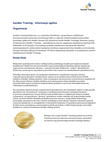 Sandler Training - Informacje ogólne Organizacja Know-how