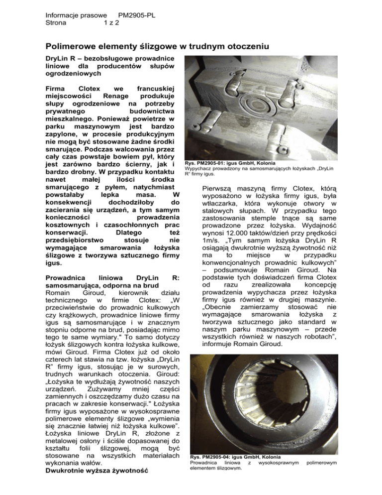 Informacje prasowe PM2905-PL Strona 1z2 Polimerowe elementy ślizgowe w trudnym otoczeniu DryLin R – bezobsługowe prowadnice liniowe dla producentów słupów ogrodzeniowych Firma Clotex we francuskiej miejscowości Renage produkuje słupy ogrodzeniowe na potrzeby prywatnego budownictwa mieszkalnego. Ponieważ powietrze w parku maszynowym jest bardzo zapylone, w procesie produkcyjnym nie mogą być stosowane żadne środki smarujące. Podczas walcowania przez cały czas powstaje bowiem pył, który jest zarówno bardzo ścierny, jak i bardzo drobny. W przypadku kontaktu nawet małej ilości środka smarującego z pyłem, natychmiast powstałaby lepka masa. W konsekwencji dochodziłoby do zacierania się urządzeń, a tym samym konieczności prowadzenia kosztownych i czasochłonnych prac konserwacji. Dlatego też przedsiębiorstwo stosuje nie wymagające smarowania łożyska ślizgowe z tworzywa sztucznego firmy igus. Prowadnica liniowa DryLin R: samosmarująca, odporna na brud Romain Giroud, kierownik działu technicznego w firmie Clotex: „W przeciwieństwie do prowadnic kulkowych czy krążkowych, prowadnice liniowe firmy igus są samosmarujące i w znacznym stopniu odporne na brud, posiadając mimo tego te same wymiary." To samo dotyczy łożysk ślizgowych kontra łożyska kulkowe, mówi Giroud. Firma Clotex już od około czterech lat stawia na tzw. łożyska „DryLin R” firmy igus, stosując je w surowych, trudnych warunkach otoczenia. Giroud: „Łożyska te wydłużają żywotność naszych urządzeń. Zużywamy mniej części zamiennych i oszczędzamy dużo czasu na pracach w zakresie konserwacji." Łożyska firmy igus wyposażone w wysokosprawne polimerowe elementy ślizgowe „wymienia się znacznie łatwiej niż łożyska kulkowe”. Łożyska liniowe DryLin R, złożone z metalowej osłony i ściśle dopasowanej do kształtu folii ślizgowej, mogą być stosowane na wszystkich materiałach wykonania wałów. Dwukrotnie wyższa żywotność Rys. PM2905-01: igus GmbH, Kolonia Wypychacz prowadzony na samosmarujących łożyskach „DryLin R“ firmy igus. Pierwszą maszyną firmy Clotex, którą wyposażono w łożyska firmy igus, była wtłaczarka, która wykonuje otwory w stalowych słupach. W przypadku tego zastosowania stemple tnące są same prowadzone przez łożyska. Wydajność wynosi 12.000 taktów/dzień przy prędkości 1m/s. „Tym samym łożyska DryLin R osiągają dwukrotnie wyższą żywotność niż ma to miejsce w przypadku konwencjonalnych prowadnic kulkowych” – podsumowuje Romain Giroud. Na podstawie tych doświadczeń firma Clotex od razu zrealizowała koncepcję prowadzenia wypychacza przez łożyska firmy igus również w drugiej maszynie. „Obecnie zamierzamy stosować nie wymagające smarowania łożyska z tworzywa sztucznego jako standard w naszym parku maszynowym – przede wszystkich również w naszych robotach”, informuje Romain Giroud. Rys. PM2905-04: igus GmbH, Kolonia Prowadnica liniowa z wysokosprawnym elementem ślizgowym. polimerowym Informacje prasowe PM2905-PL Strona 2z2 Od przemysłu spożywczego po budowę dróg Na potrzeby jeszcze trudniejszych zastosowań, na przykład w przemyśle betonowym i kamieniarskim, w branży samochodowej (np. pistolety do zgrzewania), w przemyśle spożywczym (np. wyroby mączne na szynach, które szybko ulegają sklejeniu), w budowie dróg, w kamieniołomach lub pracach pod ziemią firma igus posiada w swoim programie dostaw dodatkowo również inne systemy prowadzenia oprócz prowadnic kołowych. Obecnie skonstruowano nową wersję prowadnicy DryLin T, której elementy ślizgowe są ustalane kształtowo przez pokrywy metalowe w wózku prowadnicy. Rys. PM2905-02: igus GmbH, Kolonia Park maszynowy firmy Clotex w miejscowości Renage: wszędzie pełno czarnego, ściernego pyłu. KONTAKT PRASOWY: André Kluth Corporate Communication Manager Rys. PM2905-03: igus GmbH, Kolonia "Mniejszy stopień zużycia części zamiennych, oszczędność czasu w związku z konserwacją” – mówi Romain Giroud, kierownik działu technicznego w firmie Clotex w miejscowości Renage (Francja). igus GmbH Spicher Str. 1a D-51147 Köln Tel. +49 (0) 22 03 / 96 49 - 611 Fax +49 (0) 22 03 / 96 49 - 631 [email protected] www.igus.de DIN ISO 9001:2000 KONTAKT: igus® Sp zo.o ul. Parowcowa 10b 02-445 Warszawa Tel. 022-863 57 70 Faks 022-863 61 69 [email protected] www.igus.com.pl “igus, Chainflex, Easy Chain, E-Chain, E-Chain Systems, Energy Chain, Energy Chain Systems, Flizz, ReadyChain, Triflex, TwisterChain, DryLin, iglidur, igubal, Polysorb“ są znakami towarowymi chronionymi prawem w Republice Federalnej Niemiec i na całym świecie.