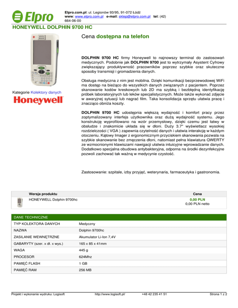 Elpro.com.pl: ul. Legionów 93/95, 91-072 Łódź www: www.elpro.com.pl e-mail: [email protected] tel: (42) 664-06-00 HONEYWELL DOLPHIN 9700 HC Cena dostępna na telefon DOLPHIN 9700 HC firmy Honeywell to najnowszy terminal do zastosowań medycznych. Podobnie jak DOLPHIN 9700 jest to wytrzymały Asystent Cyfrowy zwiększający produktywność pracowników poprzez szybkie oraz skuteczne sposoby transmisji i gromadzenia danych. Kategorie Kolektory danych Obsługa medyczna z nim jest mobilna. Dzięki komunikacji bezprzewodowej WiFi ma dostęp na bieżąco do wszystkich danych związanych z pacjentem. Poprzez skanowanie kodów kreskowych lub 2D ma szybką i bezbłędną identyfikację próbek laboratoryjnych lub leków specjalistycznych. Może także wykonać zdjęcie w awaryjnej sytuacji lub nagrać film. Taka konsolidacja sprzętu ułatwia pracę i znacząco obniża koszty. DOLPHIN 9700 HC udostępnia większą wydajność i komfort pracy przez zoptymalizowany interfejs użytkownika oraz dużą wydajność systemu. Jego konstrukcję wyprofilowano na wzór przemysłowy, dzięki czemu jest łatwy w obsłudze i znakomicie układa się w dłoni. Duży 3.7" wyświetlacz wysokiej rozdzielczości ( VGA ) zapewnia czytelność danych i ułatwia interakcję w każdym otoczeniu. Kątowy Imager z ergonomicznym przyciskiem skanowania pozwala na szybkie skanowanie bez zmęczenia dłoni, natomiast pełna klawiatura QWERTY ze wzmocnionymi klawiszami nawigacji ułatwia intuicyjne wprowadzanie danych. Dodatkowo specjalna obudowa antybakteryjna, odporna na środki dezynfekcyjne pozwoli zachować tak ważną w medycynie czystość. Zastosowanie: szpitale, izby przyjęć, weterynaria, farmaceutyka i gastronomia. Wersja produktu Cena HONEYWELL Dolphin 9700hc 0,00 PLN 0,00 PLN netto DANE TECHNICZNE TYP KOLEKTORA DANYCH Medyczny NAZWA Dolphin 9700hc ZASILANIE WEWNĘTRZNE Akumulator Li-Ion 7,4V GABARYTY (szer. x dł. x wys.) 165 x 85 x 41mm WAGA 445 g PROCESOR 624Mhz PAMIĘĆ FLASH 1 GB PAMIĘĆ RAM 256 MB Projekt i wykonanie wydruku: Logisoft http://www.logisoft.pl/ +48 42 235 41 51 Strona 1 z 2 WYŚWIETLACZ OBSŁUGI VGA 3,7' dotykowy KLAWIATURA 45 CZYTNIK KODÓW KRESKOWYCH Imager 2D INTERFEJSY BT/WIFI/GPRS/USB ODPORNOŚĆ NA UPADEK 1,5 m TEMPERATURA PRACY -10 do 50 Projekt i wykonanie wydruku: Logisoft Powered by TCPDF (www.tcpdf.org) http://www.logisoft.pl/ +48 42 235 41 51 Strona 2 z 2