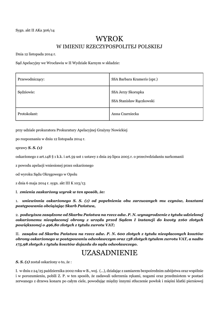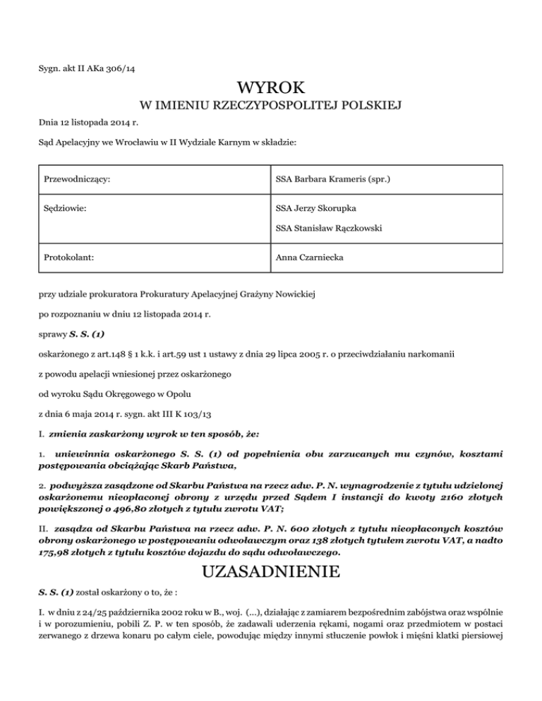 Sygn. akt II AKa 306/14 WYROK W IMIENIU RZECZYPOSPOLITEJ POLSKIEJ Dnia 12 listopada 2014 r. Sąd Apelacyjny we Wrocławiu w II Wydziale Karnym w składzie: Przewodniczący: SSA Barbara Krameris (spr.) Sędziowie: SSA Jerzy Skorupka SSA Stanisław Rączkowski Protokolant: Anna Czarniecka przy udziale prokuratora Prokuratury Apelacyjnej Grażyny Nowickiej po rozpoznaniu w dniu 12 listopada 2014 r. sprawy S. S. (1) oskarżonego z art.148 § 1 k.k. i art.59 ust 1 ustawy z dnia 29 lipca 2005 r. o przeciwdziałaniu narkomanii z powodu apelacji wniesionej przez oskarżonego od wyroku Sądu Okręgowego w Opolu z dnia 6 maja 2014 r. sygn. akt III K 103/13 I. zmienia zaskarżony wyrok w ten sposób, że: 1. uniewinnia oskarżonego S. S. (1) od popełnienia obu zarzucanych mu czynów, kosztami postępowania obciążając Skarb Państwa, 2. podwyższa zasądzone od Skarbu Państwa na rzecz adw. P. N. wynagrodzenie z tytułu udzielonej oskarżonemu nieopłaconej obrony z urzędu przed Sądem I instancji do kwoty 2160 złotych powiększonej o 496,80 złotych z tytułu zwrotu VAT; II. zasądza od Skarbu Państwa na rzecz adw. P. N. 600 złotych z tytułu nieopłaconych kosztów obrony oskarżonego w postępowaniu odwoławczym oraz 138 złotych tytułem zwrotu VAT, a nadto 175,98 złotych z tytułu kosztów dojazdu do sądu odwoławczego. UZASADNIENIE S. S. (1) został oskarżony o to, że : I. w dniu z 24/25 października 2002 roku w B., woj. (...), działając z zamiarem bezpośrednim zabójstwa oraz wspólnie i w porozumieniu, pobili Z. P. w ten sposób, że zadawali uderzenia rękami, nogami oraz przedmiotem w postaci zerwanego z drzewa konaru po całym ciele, powodując między innymi stłuczenie powłok i mięśni klatki piersiowej oraz grzbietu po stronie prawej, złamanie wieloodłamowe żeber po stronie prawej, stłuczenie płuca prawego, złamanie kości ramiennej prawej, stłuczenie mięśni kończyny górnej prawej, złamanie brzegu prawego talerza biodrowego oraz szeregu innych urazów ciała, które w konsekwencji doprowadziły do krwotoku do dróg oddechowych, upośledziły ruchomość klatki piersiowej i poprzez zatkanie dróg oddechowych spowodowały niewydolność oddechową i poprzez pozostawienie nagiej Z. P. w niskiej temperaturze skutkowały jej śmiercią, przy czym w/w, używając środków opisanych wcześniej, doprowadził Z. P. do poddania się innej czynności seksualnej w ten sposób, że po rozebraniu do naga dotykali ją w obrębie narządów płciowych, zaś S. S. (1) przypalał jej sutki tj. o przestępstwo z art. 148 § 1 k.k. i art. 197 § 2 k.k. w zw. z art. 11 § 2 k.k. II. w marcu 2007 roku w B. w mieszkaniu przy ul. (...), wbrew przepisom ustawy, w celu osiągnięcia korzyści majątkowej, udzielił R. P. (1) środek odurzający w postaci 2 gram amfetaminy wartości 80 złotych, za którą R. P. (1) zapłacił kwotę 100 złotych tj. o przestępstwo z art. 59 ust. 1 ustawy z dnia 29 lipca 2005 roku o przeciwdziałaniu narkomanii (Dz. U. 2005, Nr 179, poz. 1485) Sąd Okręgowy w Opolu wyrokiem z dnia 6 maja 2014 r., sygn. akt: III K 103/13: 1. w ramach czynu zarzucanego w pkt I części wstępnej wyroku uznał oskarżonego S. S. (1) za winnego tego, że w nocy z 24/25 października 2002 roku w B., działając wspólnie i w porozumieniu z R. P. (1) pobił Z. P. w ten sposób, że obaj zadawali jej po całym ciele uderzenia rękoma oraz zerwaną z drzewa gałęzią, powodując między innymi stłuczenia powłok i mięśni klatki piersiowej oraz grzbietu po stronie prawej, złamanie wieloodłamowe żeber po stronie prawej, stłuczenie płuca prawego, złamanie kości ramiennej prawej, stłuczenie mięśni kończyny górnej prawej, złamanie brzegu prawego talerza biodrowego oraz szereg innych urazów ciała, które w konsekwencji doprowadziły do krwotoku do dróg oddechowych, upośledziły ruchomość klatki piersiowej, a poprzez zatkanie dróg oddechowych spowodowały niewydolność oddechową, zaś S. S. (1) przypalał Z. P. sutki, po czym pozostawili nagą Z. P. w niskiej temperaturze, co doprowadziło do jej śmierci, tj. przestępstwa za art. 158 § 3 k.k. i za to na podstawie art. 158 § 3 k.k. wymierzył oskarżonemu S. S. (1) karę 6 lat pozbawienia wolności, 2. uznał oskarżonego S. S. (1) za winnego czynu zarzucanego w pkt II części wstępnej wyroku, z tą zmianą, że przyjął miejsce dokonania czynu na ul. (...) oraz pominął zwrot „za którą R. P. (1) zapłacił 100 zł”, uznał, że czyn ten stanowi wypadek mniejszej wagi, tj. przestępstwa z art. 59 ust. 3 ustawy z dnia 29 lipca 2005 roku o przeciwdziałaniu narkomanii i za to na podstawie art. 59 ust 3 ustawy o przeciwdziałaniu narkomanii wymierzył oskarżonemu S. S. (1) karę 6 miesięcy pozbawienia wolności, 3. na podstawie art. 85 k.k. i art. 86 § 1 k.k. połączył kary pozbawienia wolności orzeczone w punktach 1 i 2 części dyspozytywnej wyroku i wymierzył oskarżonemu karę łączną 6 lat pozbawienia wolności, 4. na podstawie art. 63 § 1 k.k. zaliczył oskarżonemu na poczet orzeczonej kary łącznej pozbawienia wolności okres zatrzymania i tymczasowego aresztowania od dnia 16 kwietnia 2007 roku do 2 września 2008 roku, 5. na podstawie art. 29 ust. 1 ustawy z dnia 26 maja 1982 r. Prawo o adwokaturze (Dz. U. nr 29 poz. 124 z póź. zm.) zasądził od Skarbu Państwa na rzecz adwokata P. N. kwotę 1623,60 złotych, w tym należny podatek od towarów i usług, tytułem udzielonej oskarżonemu nie opłaconej obrony z urzędu, 6. na podstawie art. 624 § 1 k.p.k. zwolnił oskarżonego od zapłaty na rzecz Skarbu Państwa kosztów sądowych w całości. Powyższy wyrok zaskarżył w całości imieniem oskarżonego S. S. (1) jego obrońca. Na podstawie art. 427 § 2 k.p.k. i art. 438 pkt 2 i 3 k.p.k. zarzucił: 1. błąd w ustaleniach faktycznych przyjętych za podstawę wydania skarżonego wyroku, mający wpływ na jego treść, który doprowadził Sąd I instancji do niesłuszne