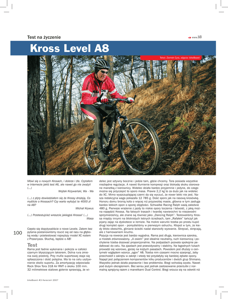 Test na życzenie Kross Level A8 Tekst: Ziemek Cyra, zdjęcia: bikeBoard Mówi się o nowych Krosach, i dobrze i źle. Czytałem w internecie jakiś test A6, ale nawet go nie zważyli (...) Wojtek Krzywański, Wa - Wa (...) z płyty dowiedziałem się że Krossy drożeją. Co myślicie o Krossach? Czy warto wyłożyć te 4000 zł na A8? Michał Krywus (...) Przetestujcież wreszcie jakiegoś Krossa! (...) Masa 100 Często się dopytywaliście o nowe Levele. Zatem bez pytania postanowiliśmy rzucić się od razu na głęboką wodę i przetestować najwyższy model XC rodem z Przasnysza. Słuchaj, będzie o A8! Test Rama jest ładnie wykonana i pokryta w całości czarnym błyszczącym lakierem. Dolna rura zmienia swój przekrój. Przy mufie suportowej staje się spłaszczona i dość potężna. Ma to na celu usztywnienie okolic suportu. Za amortyzację odpowiada Rock Shox Tora 318 Air RMT o skoku 100 mm. 32 milimetrowe stalowe golenie sprawiają, że wi- bi k eBoar d #3 Kwiecień 2007 delec jest sztywny bocznie i jedzie tam, gdzie chcemy. Tora posiada wszystkie niezbędne regulacje. A nawet tłumienie kompresji oraz blokadę skoku sterowane manetką z kierownicy. Widelec działa bardzo przyjemnie i jedyne, do czego można się przyczepić to sporo masa. Prawie 2,2 kg to za dużo jak na widelec do XC. Mimo wyszczuplającej czerni da się wyczuć, że rower lekki nie jest. Nasza redakcyjna waga pokazała 12 785 g. Dość sporo jak na rasową krosówkę. Honoru domu bronią koła o więcej niż przyzwoitej masie, główna w tym zasługa bardzo lekkich opon o sporej objętości. Schwalbe Racing Ralph ważą zaledwie 480 g. Pierwsze wrażenie z jazdy to niskie opory toczenia i łatwość, z jaką można napędzić Krossa. Na łatwych trasach i twardej nawierzchni to niezawodni sprzymierzeńcy, ale znane są również jako „Dancing Ralph”. Testowaliśmy Krossa między innymi na błotnistych leśnych ścieżkach, tam „Rafałek” tańczył jak pijany zając na dyskotece w remizie. Na mokre warunki trzeba po prostu kupić drugi komplet opon - pomyśleliśmy w pierwszym odruchu. Kłopot w tym, że kiedy błoto obeschło, gliniane ścieżki nadal stanowiły wyzwanie. Skręcać, skręcają, ale z hamowaniem krucho. Pozycja na rowerze jest bardzo wygodna. Rama jest długa, kierownica szeroka, a mostek zrównoważony. „A osiem” jest idealnie neutralny, ruch kierownicą i pochylenie trzeba dozować proporcjonalnie. Na podjazdach pozwala spokojnie pedałować do celu. Na zjazdach jest przewidywalny i stabilny. Na łagodnych łukach prowadzi się wzorowo, gorzej na krętych pasażach. Powodem jest dłuższy o centymetr względem wzorca „ogon” A8. Trzeba nim czasami mocno szarpnąć, żeby przechodził z zakrętu w zakręt i wtedy też przydałyby się bardziej zębate opony. Napęd jest połączeniem komponentów kilku producentów i dwóch grup Shimano. Wszystko jednak działa poprawnie i bez problemów. Biegi wchodzą czysto. Nawet pod dużym obciążeniem. Bez sensu jest jednak zastosowanie przerzutki z normalną sprężyną razem z manetkami Dual Control. Biegi wrzuca się na odwrót niż Uwaga! Tekst jest integralną częścią testu. Wnioskowanie tylko na podstawie punktacji może prowadzić do błędów w interpretacji przyzwyczaiły nas nie tylko Kross Level A8 manetki DC, ale potencjał Kontakt: Kross, tel. (0-29) 752-44-45, przerzutki Top Normal zo3999 zł www.kross.pl stał zmarginalizowany. Sztyca, mostek i kieJazda 5 rownica są sygnowane Budowa 4 i porządnie wykonane Amortyzacja 5 przez Truvativa. Kierownica 2,9 Opłacalność o średnicy 31,8 jest sztywOcena 4,7 na i pozwala precyzyjnie końcowa kierować rowerem. Nie ma dobry widelec mowy o gięciu, czy „pływaprzyjemny w prowadzeniu niu” nawet przy sprintach zachowanie opon w błocie na stojąco. Siodełko jest tak subiektywnym komponentem, że trudno je ocenić. Nas tyłki od niego nie bolały. Podsumowanie Kross ma pecha, bo w tej kategorii cenowej znalazły się podobne modele bardzo wysoko cenionych brandów. Kross ma lekka ramę (testowaliśmy wielki rozmiar 21”) o klasycznej i bardzo dobrej geometrii. Owszem zastosowanie przerzutek XT podnosi wartość roweru, a bardzo dobry amortyzator ładnie wyłapuje nierówności. Hamulce LX powstrzymają nawet rozpędzonego wielkoluda i pozwoliły wychodzić Rama: aluminium 6061 Rozmiary: 17”, 19”, (21”) Geometria: rozmiar testowany: 21”-540 mm Baza kół: 1090 mm Długość tylnego widelca: 420 mm Długość górnej rury: 610 mm Wysokość osi suportu: 320 mm Kąt główki ramy: 71° Kąt rury podsiodłowej: 73° Masa kompletnego roweru: 12 785 g Masa ramy: 1925 g Masa przedniego koła: 1870 g Masa tylnego koła: 2460 g Skok amortyzacji: przód - 80 mm Przedni widelec: Rock Shox Tora 318 Air RMT (masa: 2107 g) Koła: Shimano WH-M505 Opony: Schwalbe Racing Ralph Evolution 2.1 (masa 480 g) Korby: Truvativ Stylo 3.3 44/32/22T Kaseta: SRAM PG-970 (11-34) 9-rz. Łańcuch: KMC 5FXSP X9 Przerzutka przód: Shimano XT Przerzutka tył: Shimano XT Manetki: Shimano LX DC Klamki: Shimano LX DC Hamulce: Shimano BR-M585, 160 mm Łożyska sterów: VP-A41AC Wspornik kierownicy: Truvativ Team (110 mm) Kierownica: Truvativ Team (580 mm) Wspornik siodełka: Truvativ Team Siodełko: Off Limit Pedały: aluminium Rogi: Kalloy Uno ze sporych opresji. Opony idealnie pasują na polskie maratońskie trasy (pod warunkiem, że jest sucho). Ale trzeba powiedzieć to wprost, w przeciwieństwie do Signów, A8 nie ma silnej osobowości. W Przasnyszu powstał bardo solidny i bardzo kompletny rower, ale na tle innych, w tej kategorii cenowej, nie wyróżnia się niczym szczególnym. O przepraszam, pochodzi z Polski. Zdjęcia detali roweru oraz więcej zdjęć z testu a także pełne specyfikacje porównywalnych modeli na www.bikeboard.pl. Porównywalne modele Oto kilka innych propozycji, których nie testowaliśmy. Z rowerem testowanym porównaliśmy je na podstawie dostępnych danych technicznych